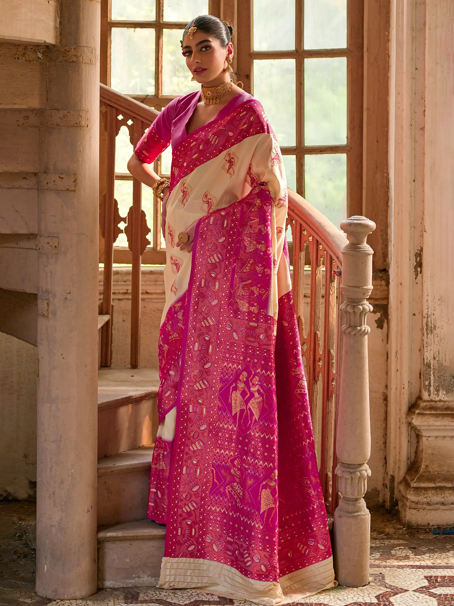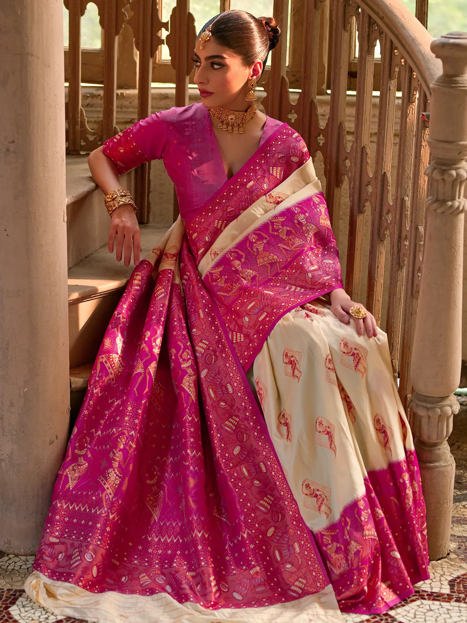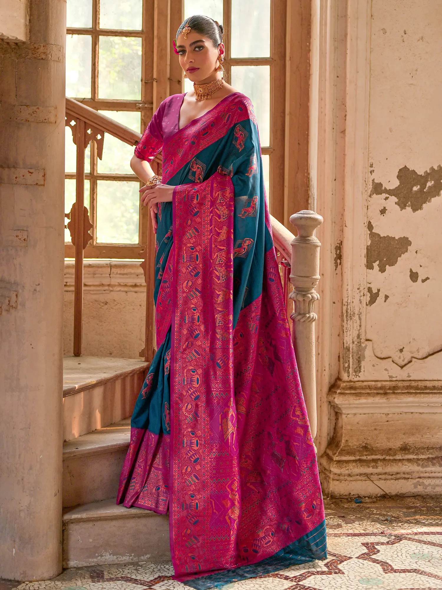 Dual Shade Pure Silk Saree with Golden Zari Woven Peacock-Elephant Motif Broad Border and Bold Aamra Motif on Pallu