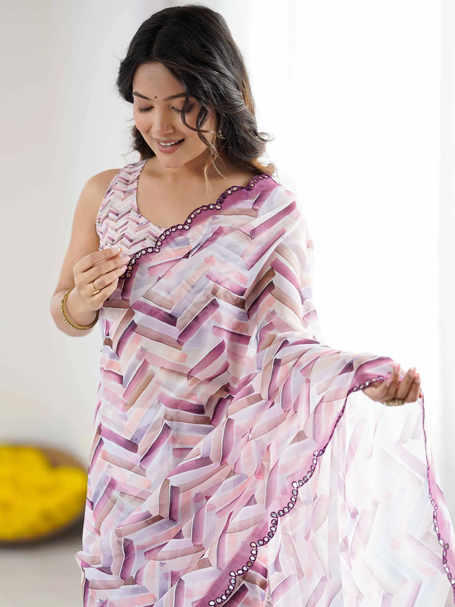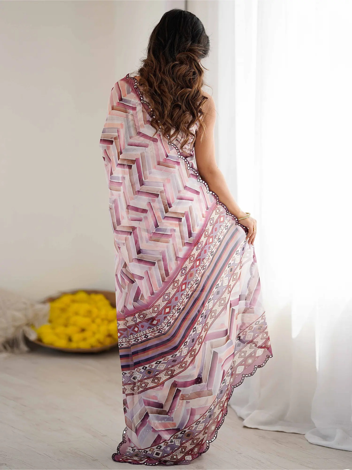 Alluring Georgette Saree Boasting Designer Printed Mirror Cut Work With Captivating Zigzag Gradient Stripes