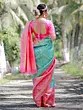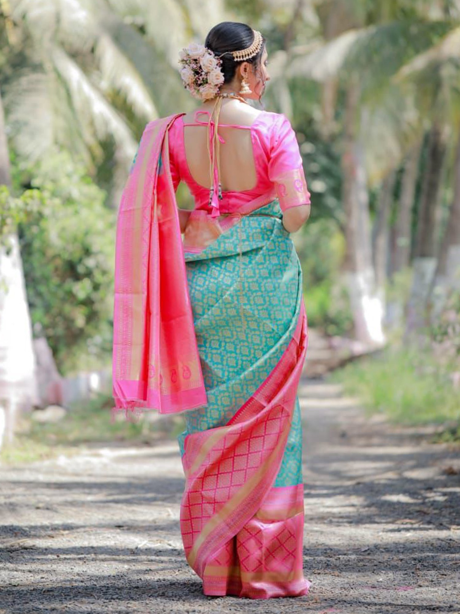 The captivating interplay of vibrant pink and refreshing aqua blue forms a striking visual narrative. Notice the rich pallu, adorned with elaborate jacquard motifs, designed to draw the eye and command admiration. The contrasting border frames the ensemble with a touch of opulence, adding depth and definition. This is more than just a garment; it's a wearable work of art, designed to drape beautifully and flatter your form, ensuring you feel as magnificent as you look.