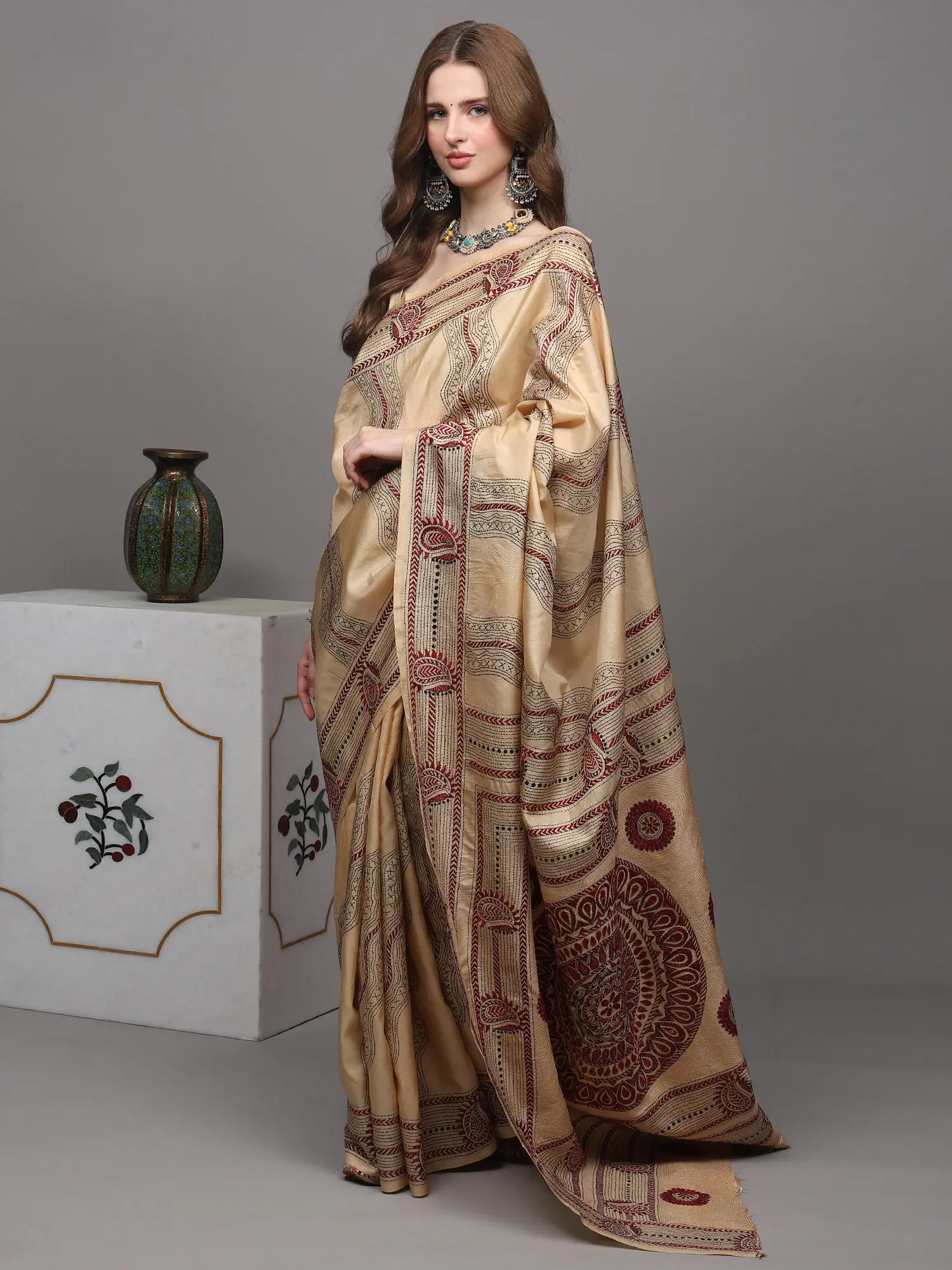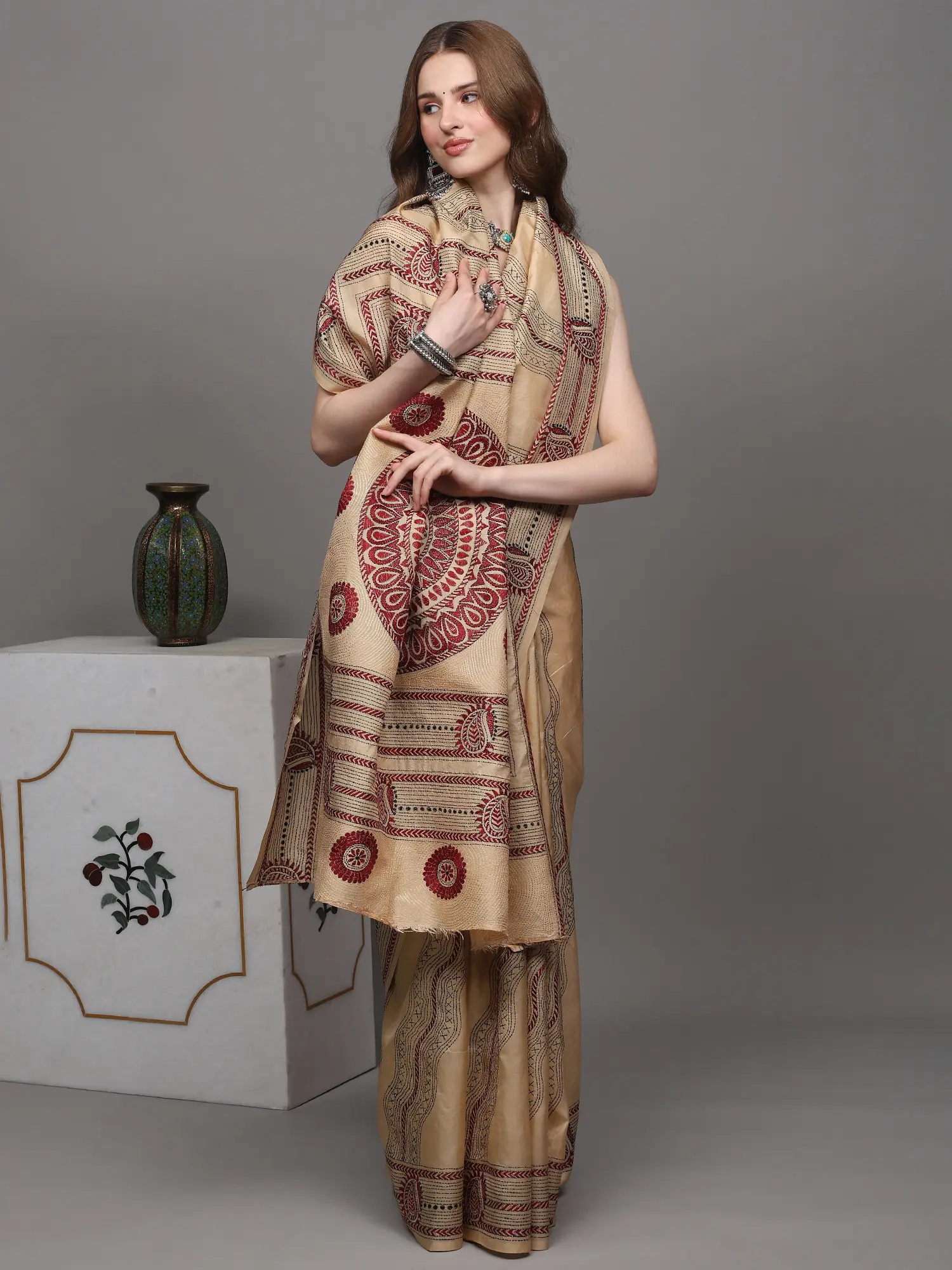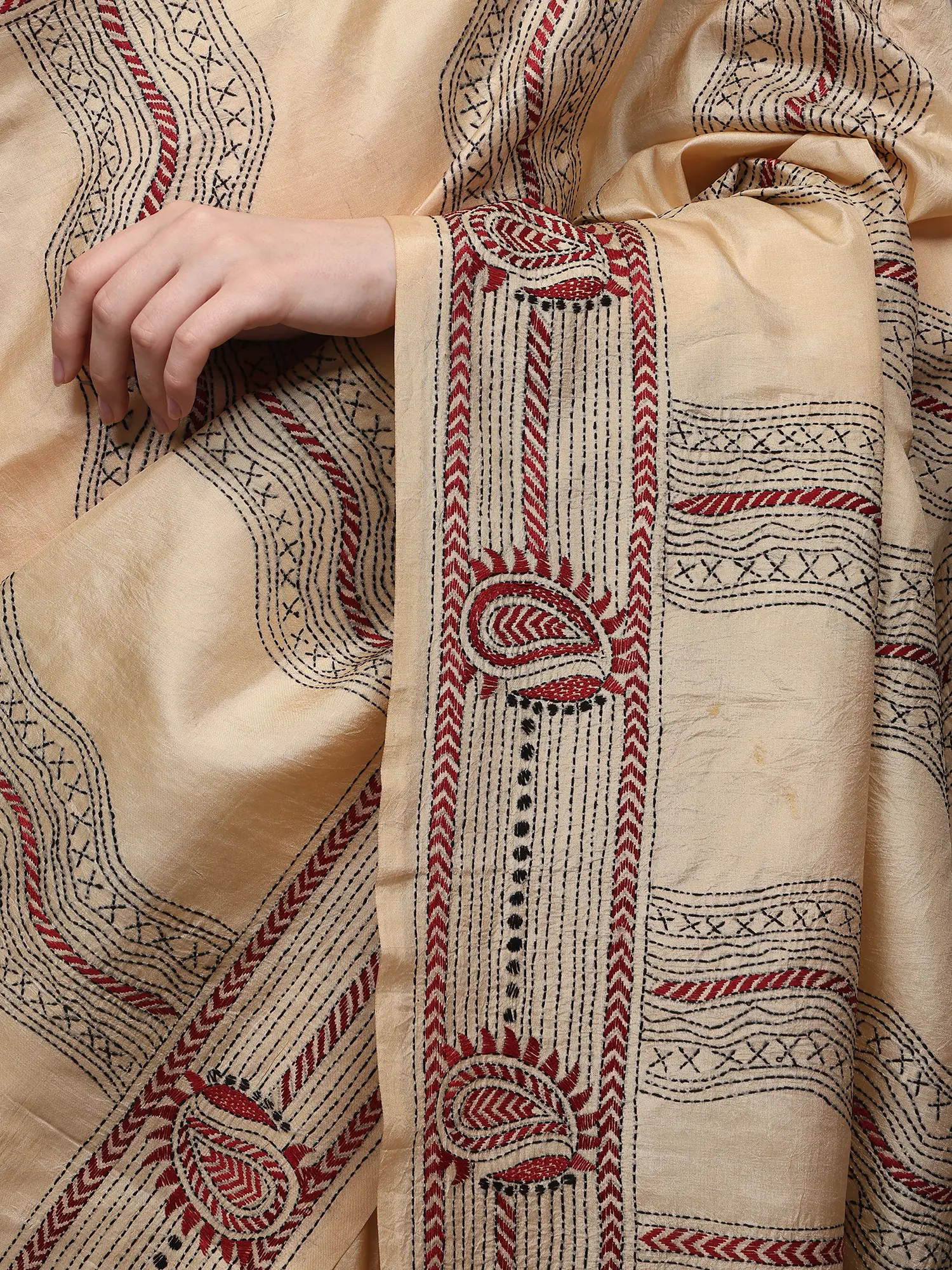 Rythmic-Red Sequins and Kantha Embroidered Crepe Saree with Printed Flowers