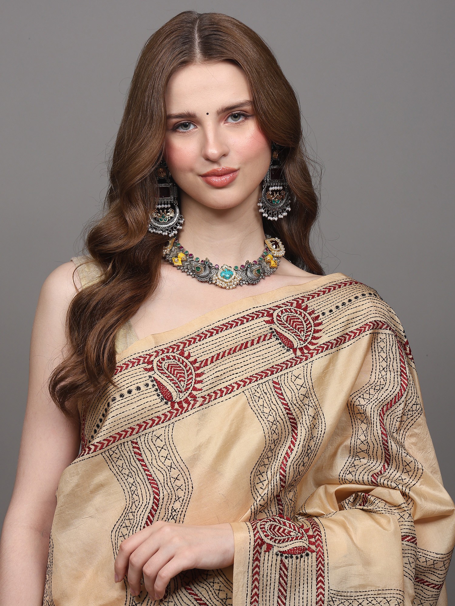 Lemon-Meringue Kantha Embroidered Crepe Saree with Floral Jaal Print and Sequins work