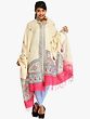 The generous dimensions of this dupatta ensure it can be draped in numerous ways, offering both warmth and style. Wear it traditionally over Indian attire, such as kurtis or lehengas, to accentuate their beauty. For a more contemporary look, it can be effortlessly styled with Western outfits, adding a unique artisanal touch to jeans and a simple top, or as an elegant wrap over a dress. The soft, off-white base of the Khadi cotton serves as a perfect canvas for the lively Madhubani prints, allowing them to truly stand out. The dupatta is finished with a vibrant, contrasting pink border, further enhanced by delicate fringes that add a playful movement and a final flourish of traditional craftsmanship. This piece is more than just an accessory; it's a wearable piece of art that connects you to the artistic legacy of India.