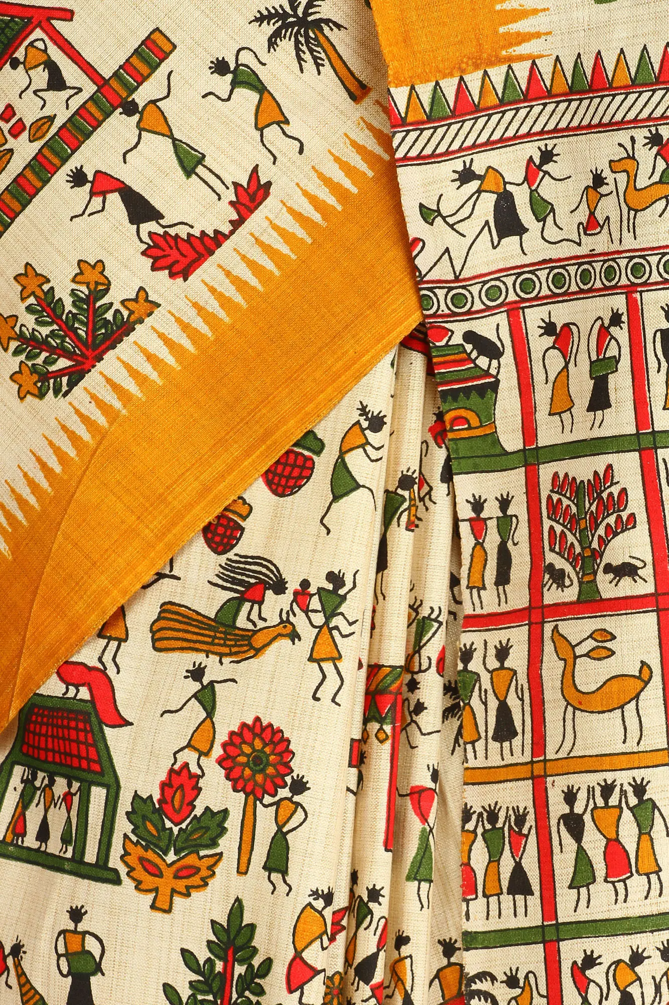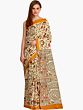 Cannoli-Cream Warli Folk Art Motifs Cotton Saree with Golden Border