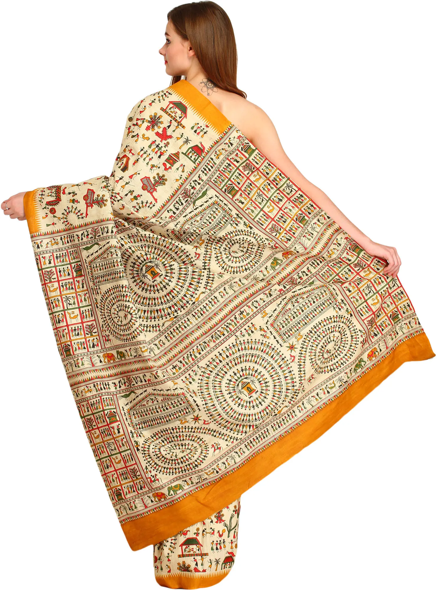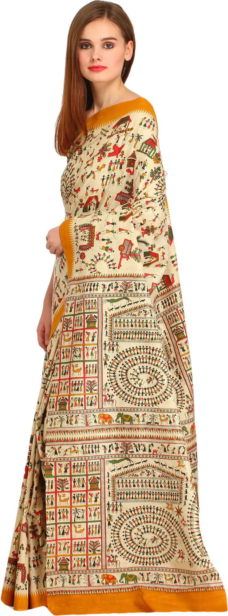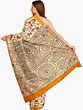 Almond-Oil Printed Sari from Bengal with Warli Folk Motifs All-Over and Temple Border