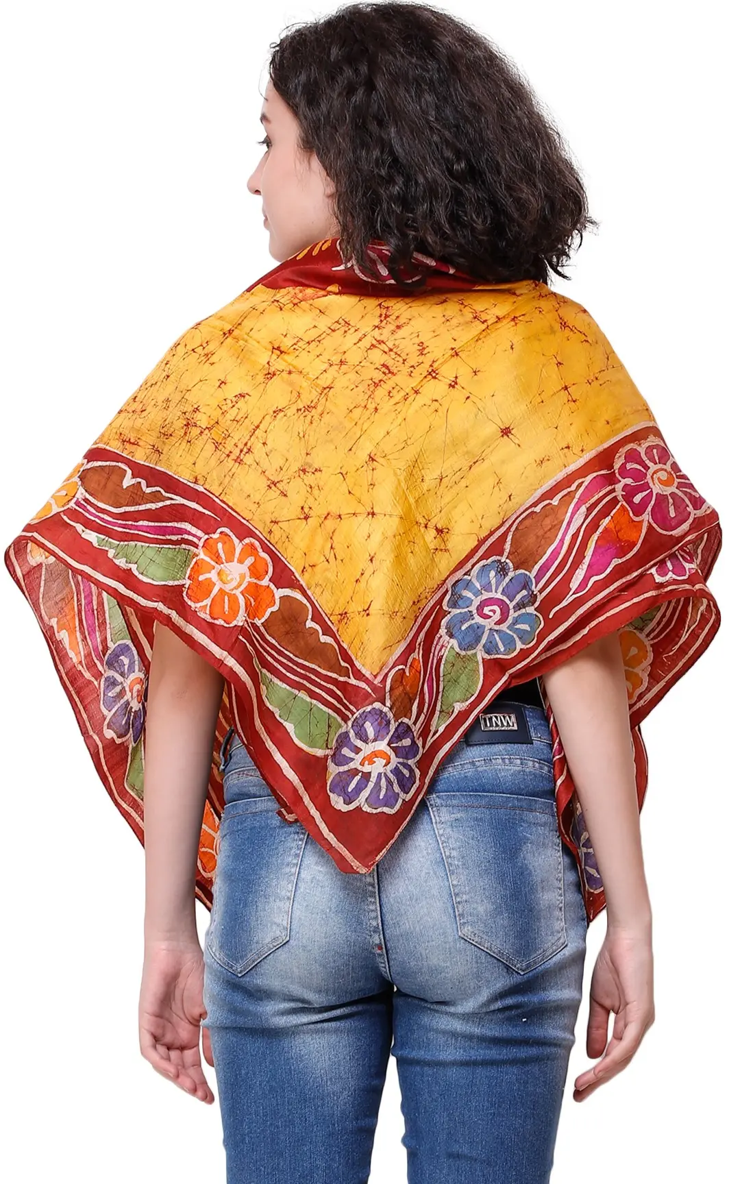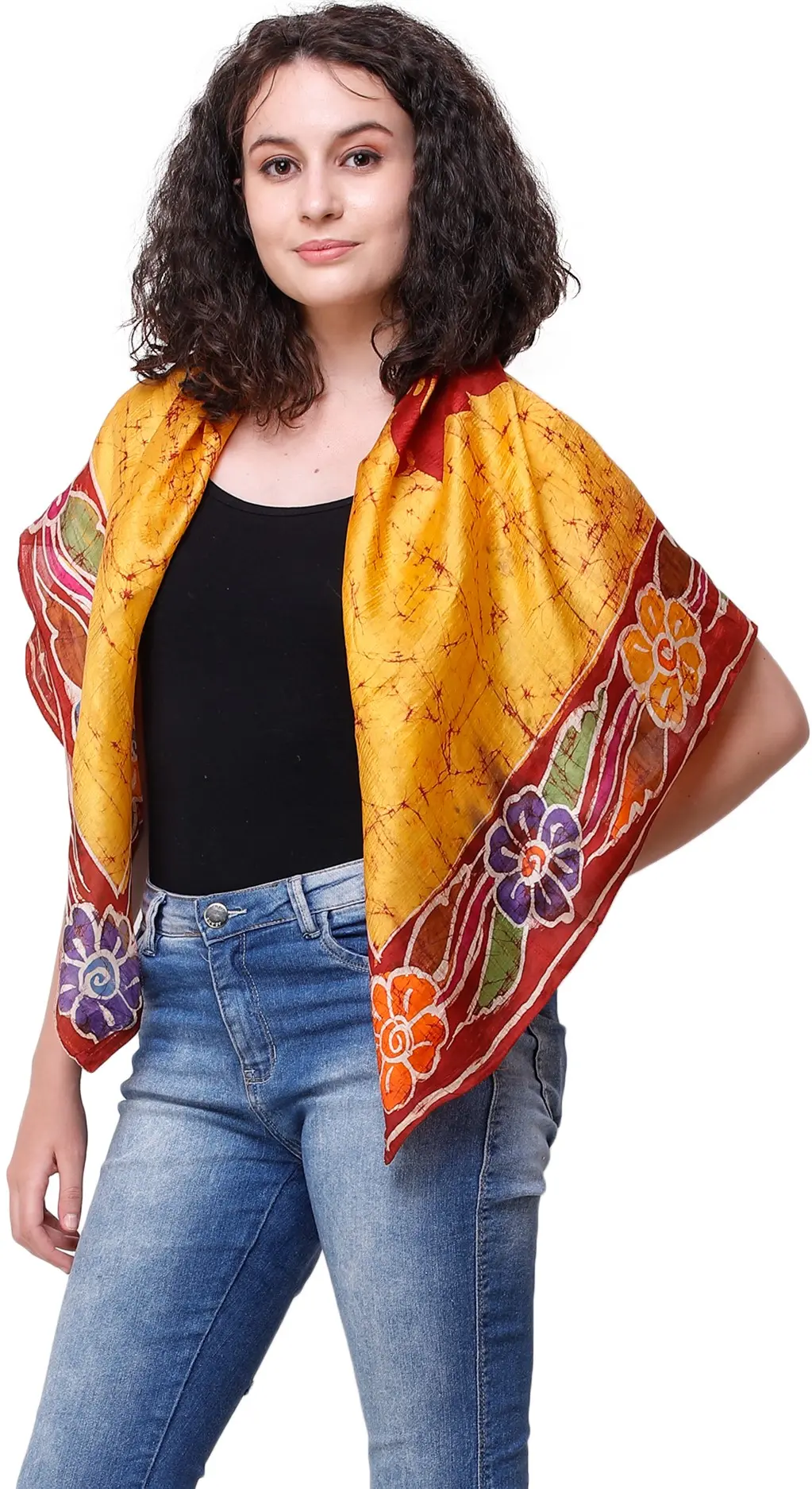 Immerse yourself in the vibrant artistry of Kolkata with this exquisite silk scarf, a true testament to traditional craft. Handcrafted using the time-honored batik tie-dye technique, each scarf tells a unique story woven from threads of pure silk. The rich amber hue forms a radiant canvas, upon which intricate floral motifs bloom in a celebration of nature's beauty. These delicate blossoms, rendered in a symphony of colors, are a signature of the skilled artisans who pour their passion into every piece.