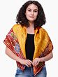 This silk scarf is designed to elevate any ensemble. Its striking color palette and captivating floral patterns make it an ideal companion for a variety of occasions. Drape it over a simple black dress for an evening out, pair it with jeans and a t-shirt for a touch of bohemian flair, or use it to add a splash of color to your professional attire. The rich amber and deep maroon border, adorned with colorful blooms, creates a striking contrast that draws the eye. It's a statement accessory that speaks volumes about your appreciation for craftsmanship and unique style.