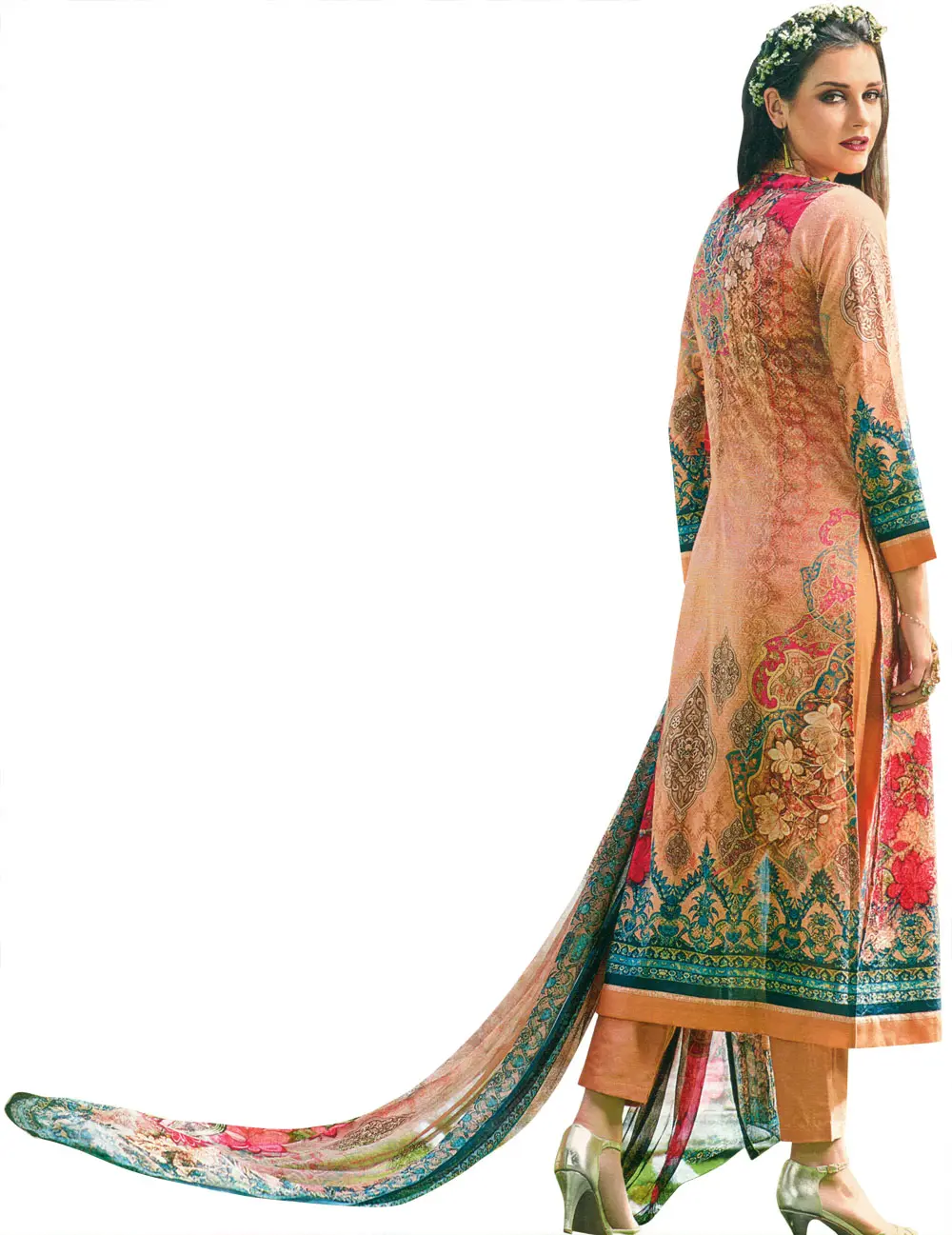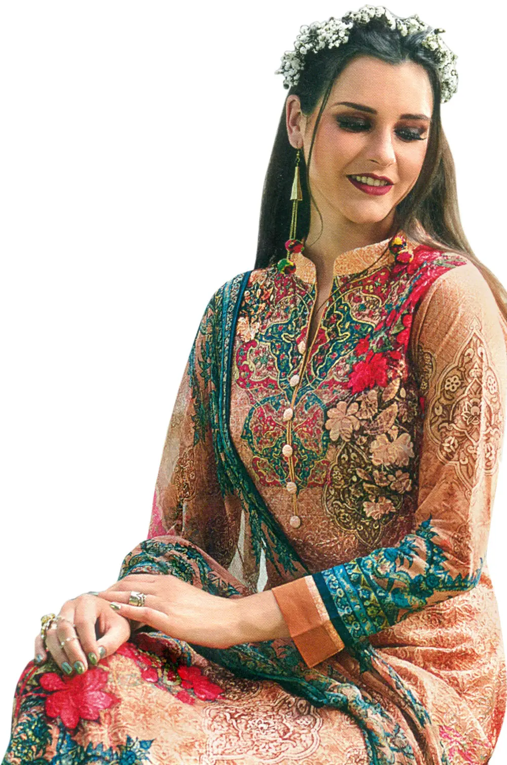 Discover a stunning ensemble that blends traditional charm with contemporary allure. This exquisite salwar kameez suit is designed to make a statement, exuding grace and sophistication with every detail. The rich amber-light hue serves as a captivating canvas for an intricate all-over floral print, creating a tapestry of colors that is both eye-catching and refined.