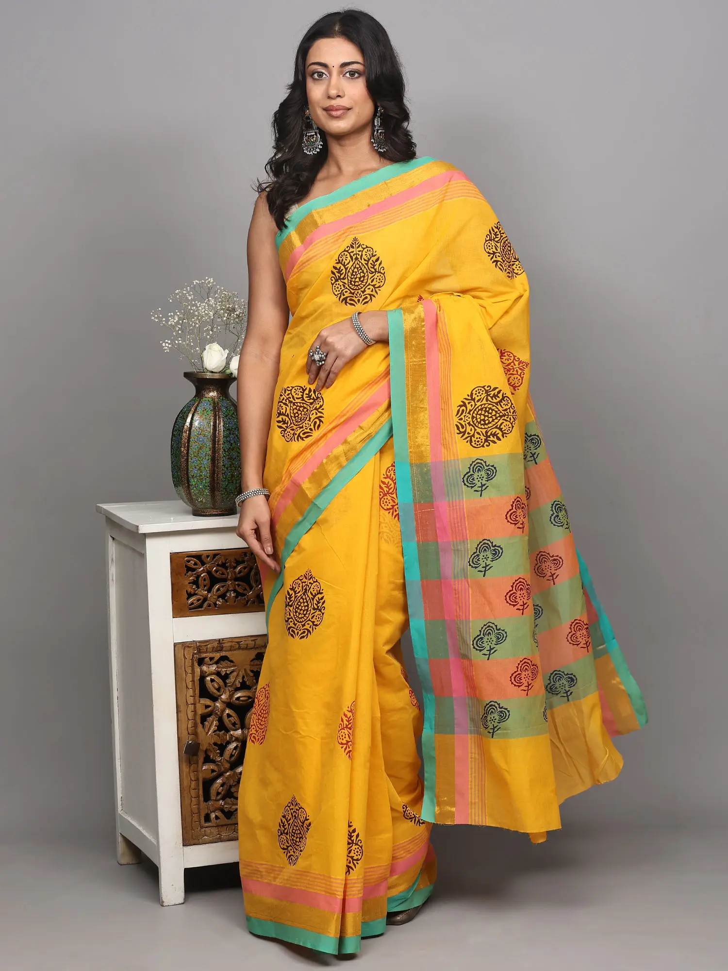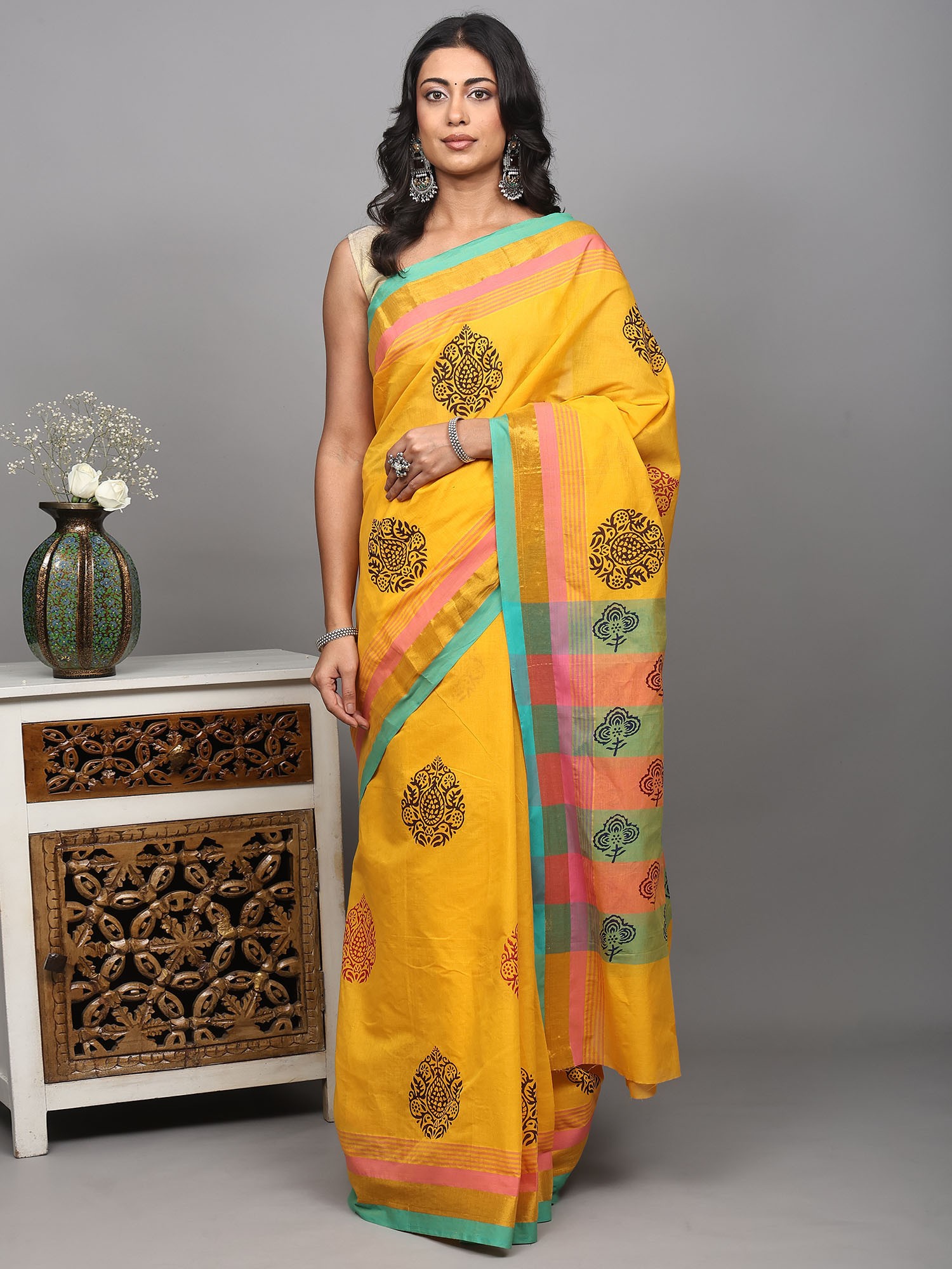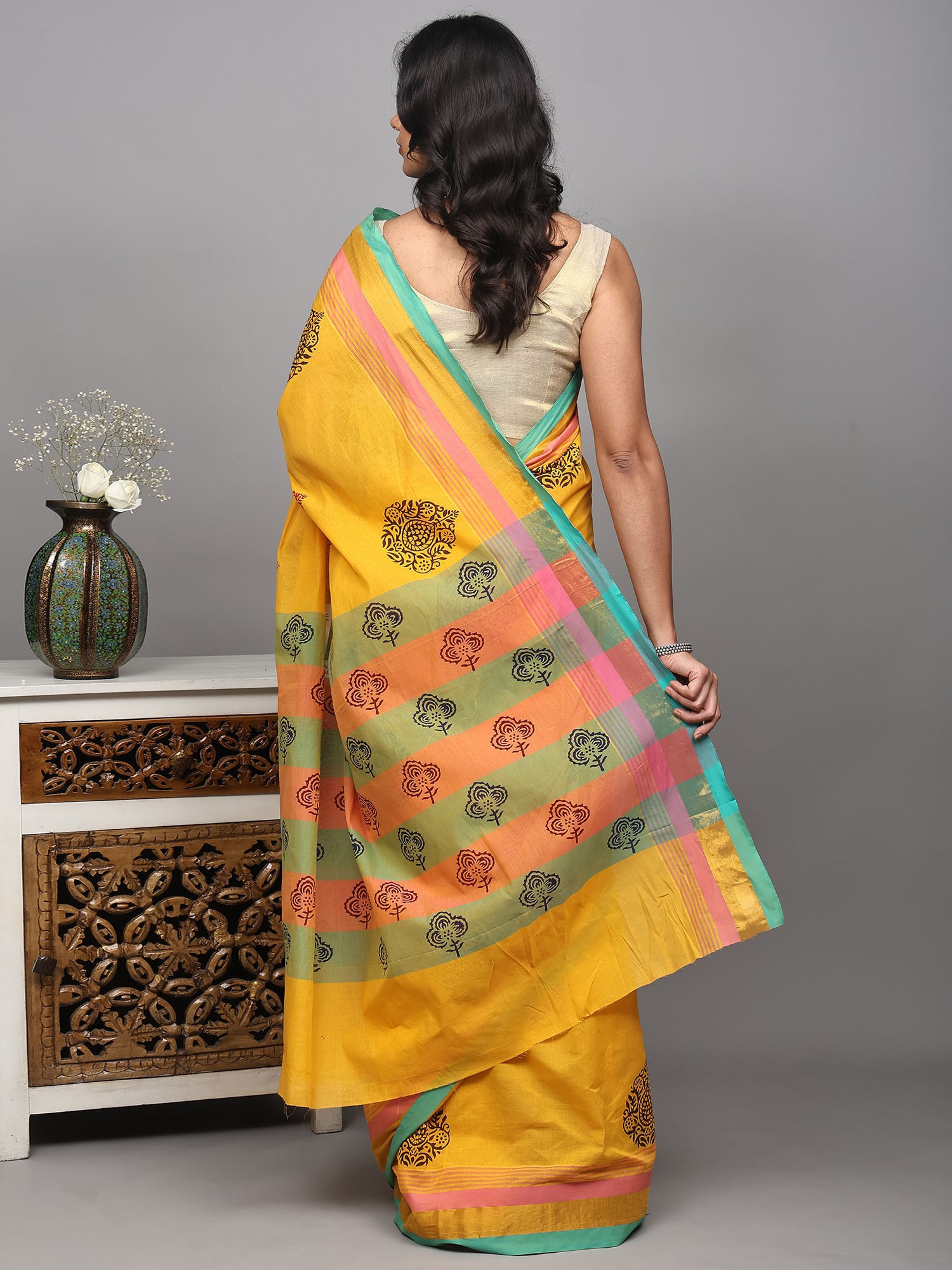 Cotton Saree with Block Printed Floral Motifs and Zari Border from Tamil Nadu