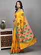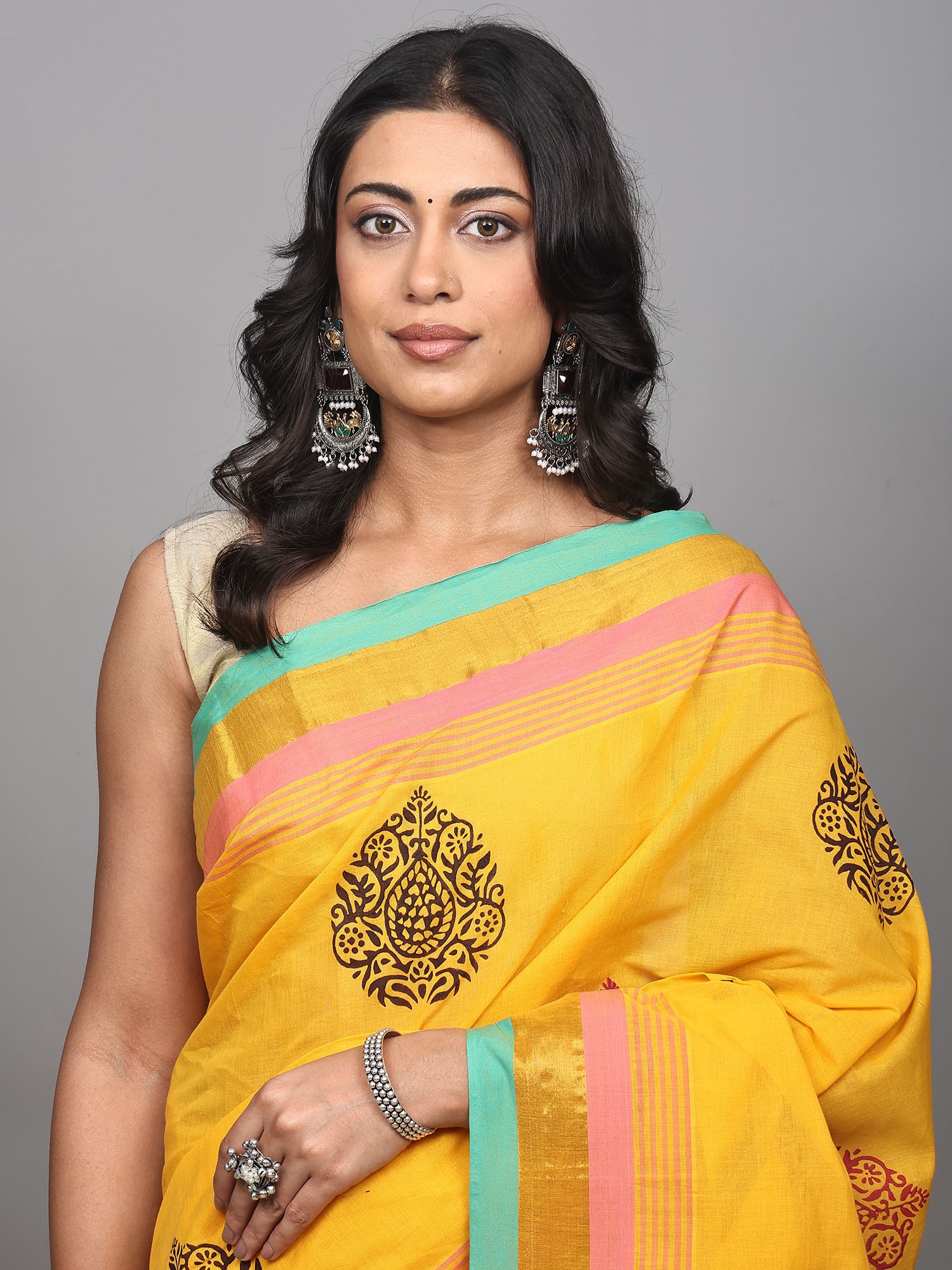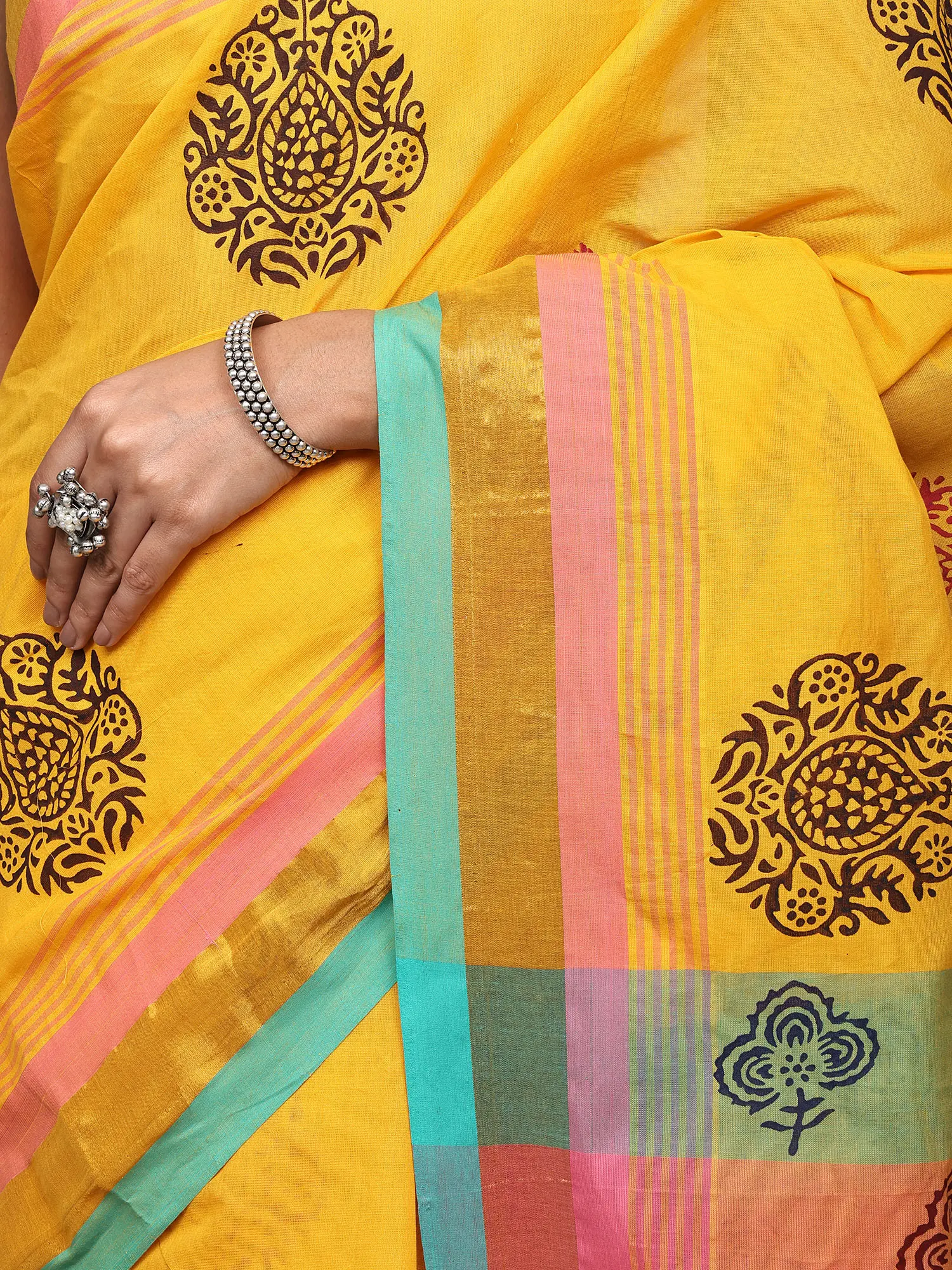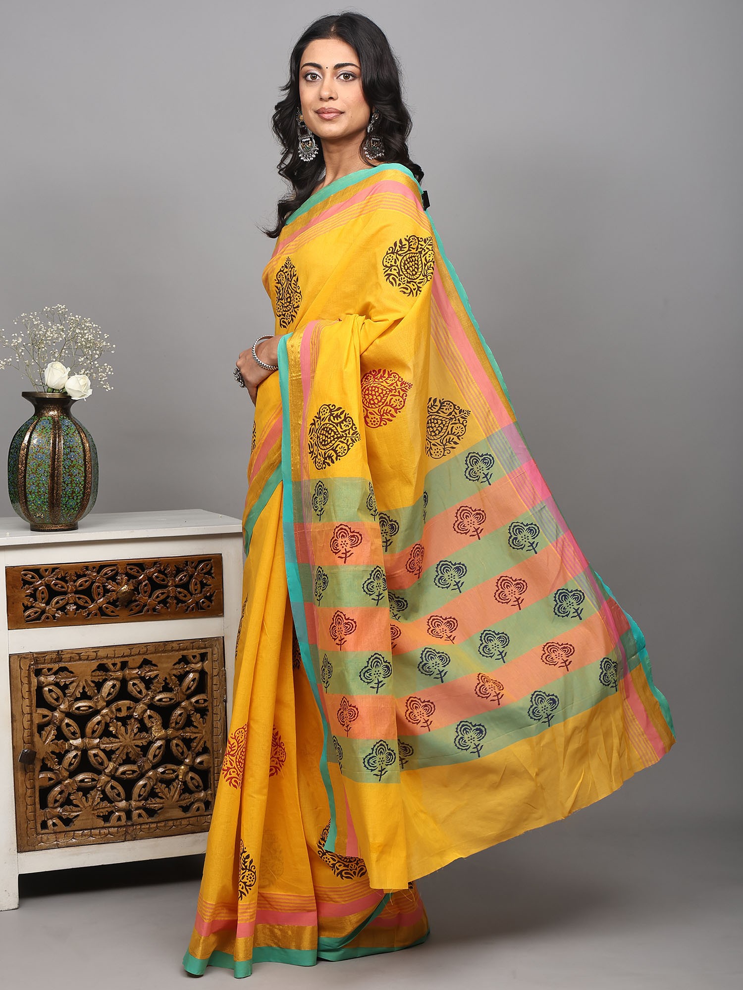 Cotton Saree with Block Printed Floral Motifs and Zari Border from Tamil Nadu