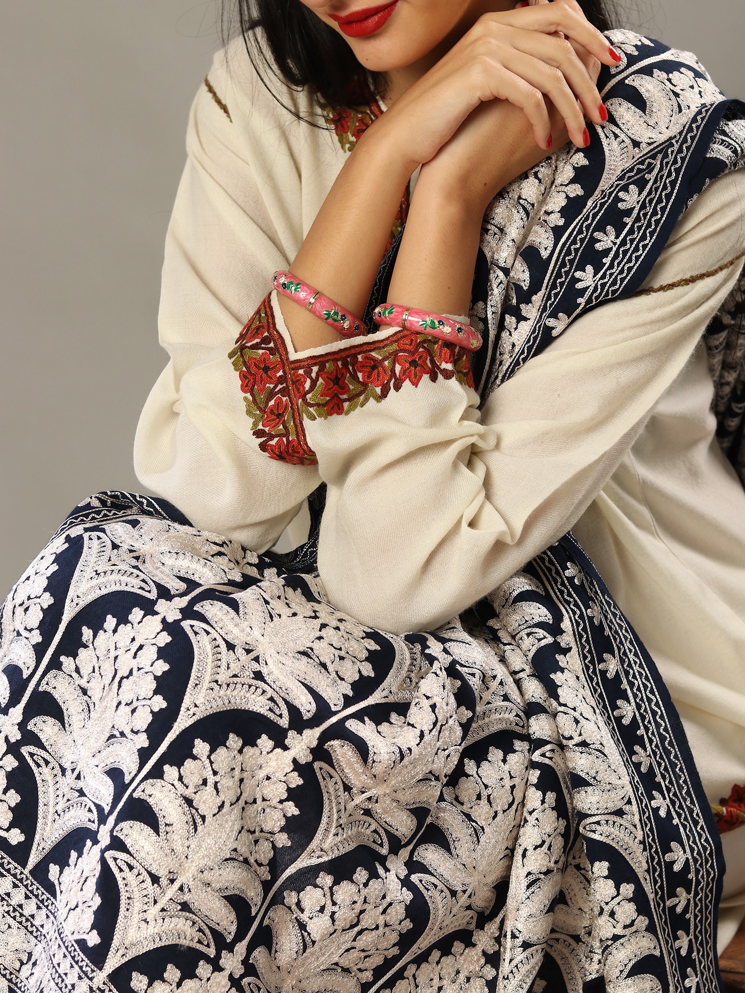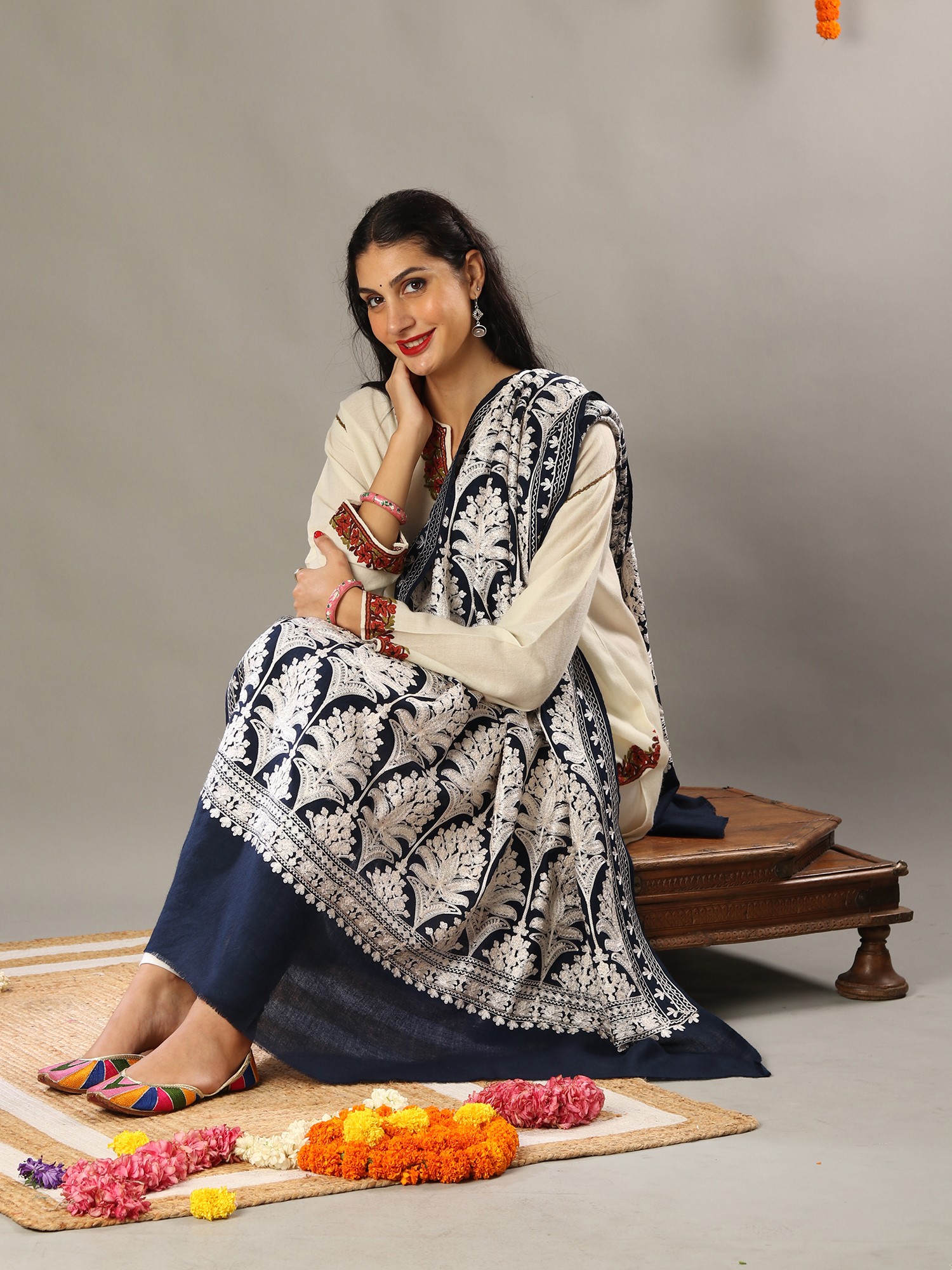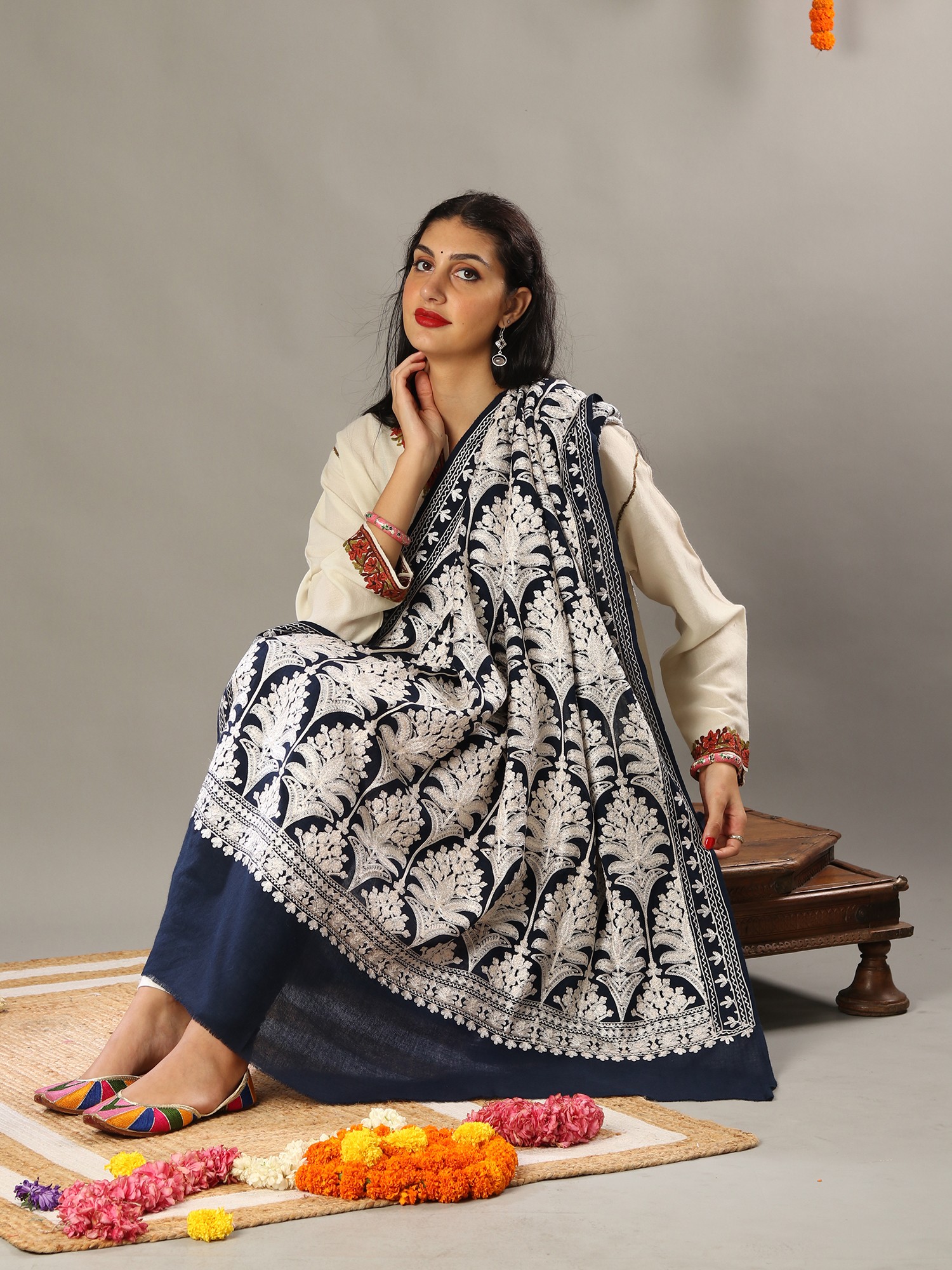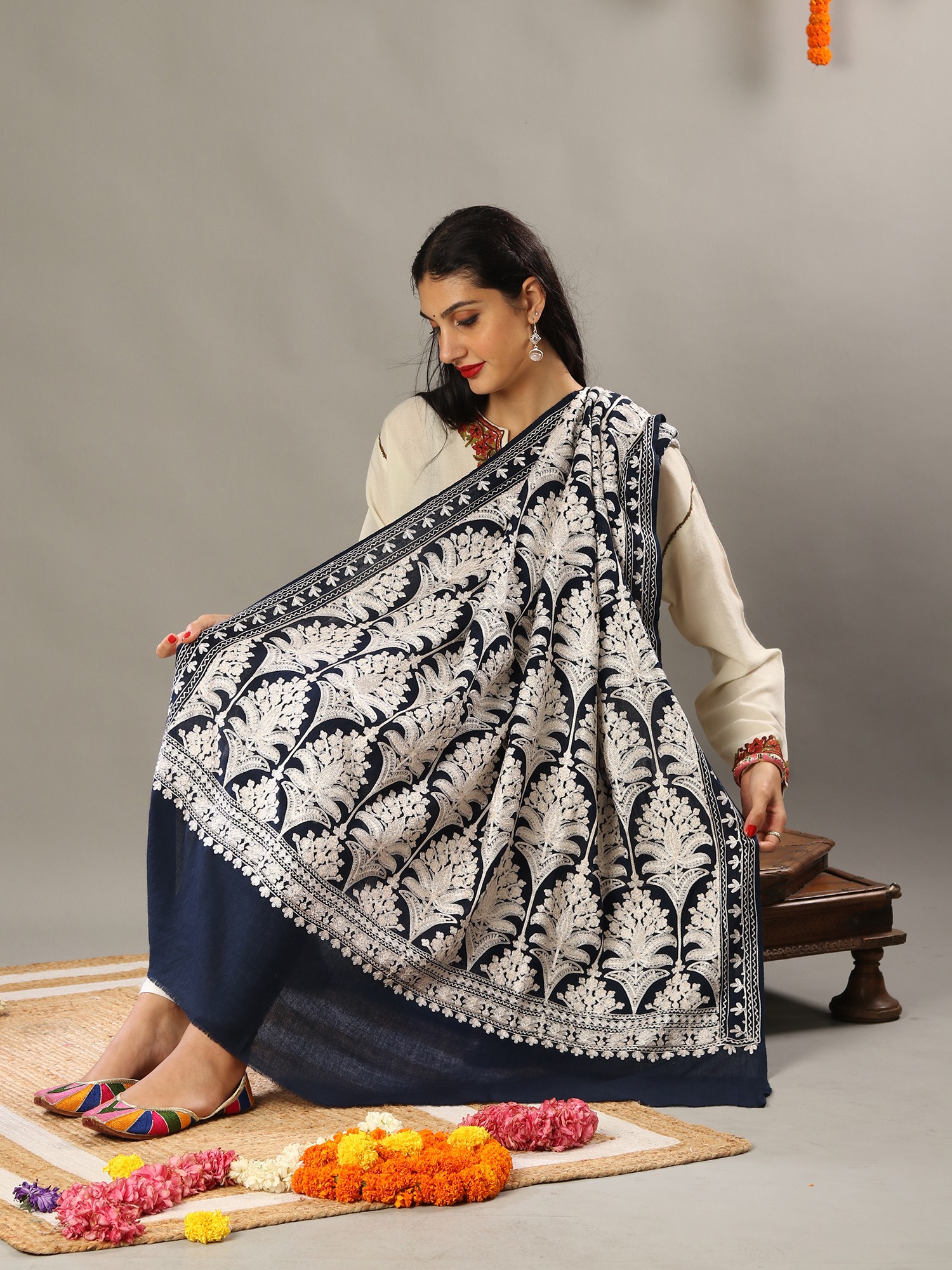 Amritsari Chain Stitch Satin Aari Embroidered Mughal Motif Pure Wool Shawl