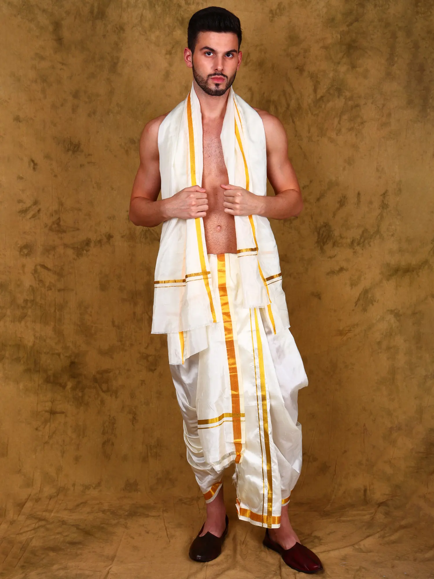 Dhoti and Angavastram Set with Wide Golden Border (Ready to Wear)