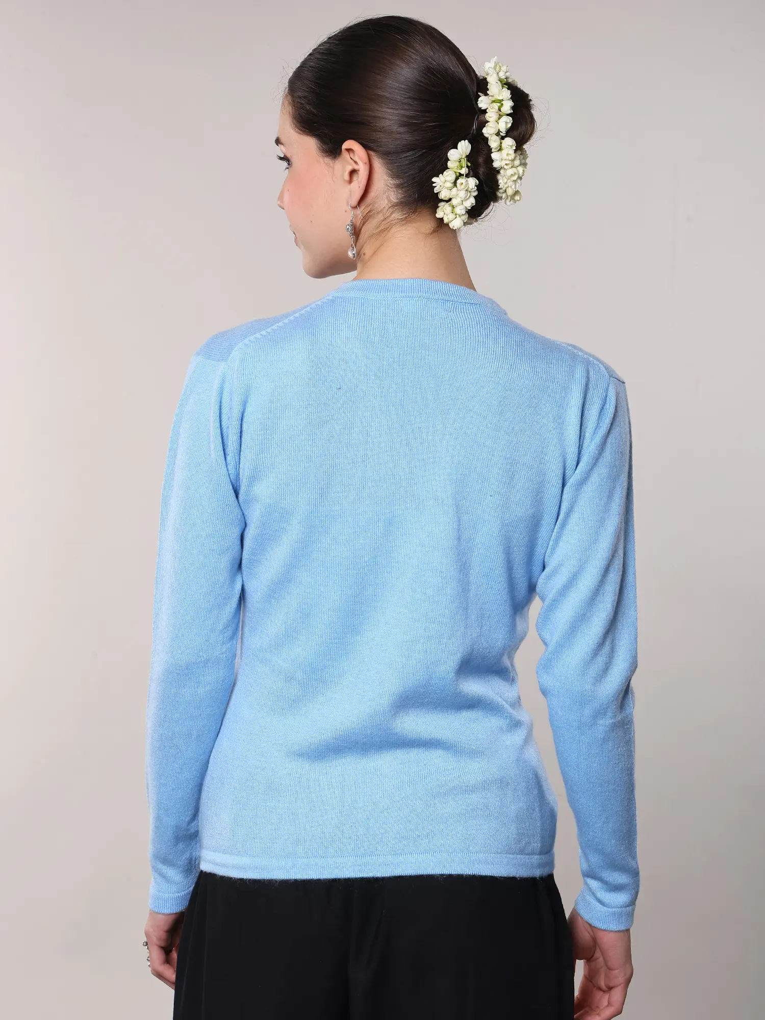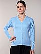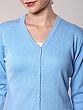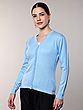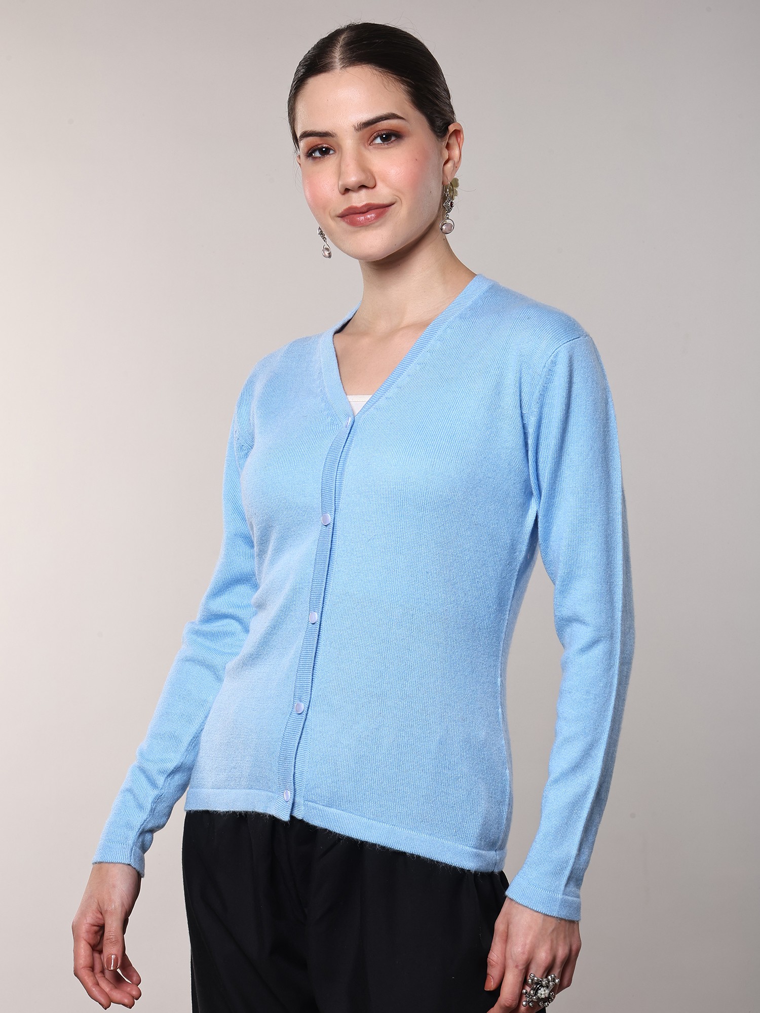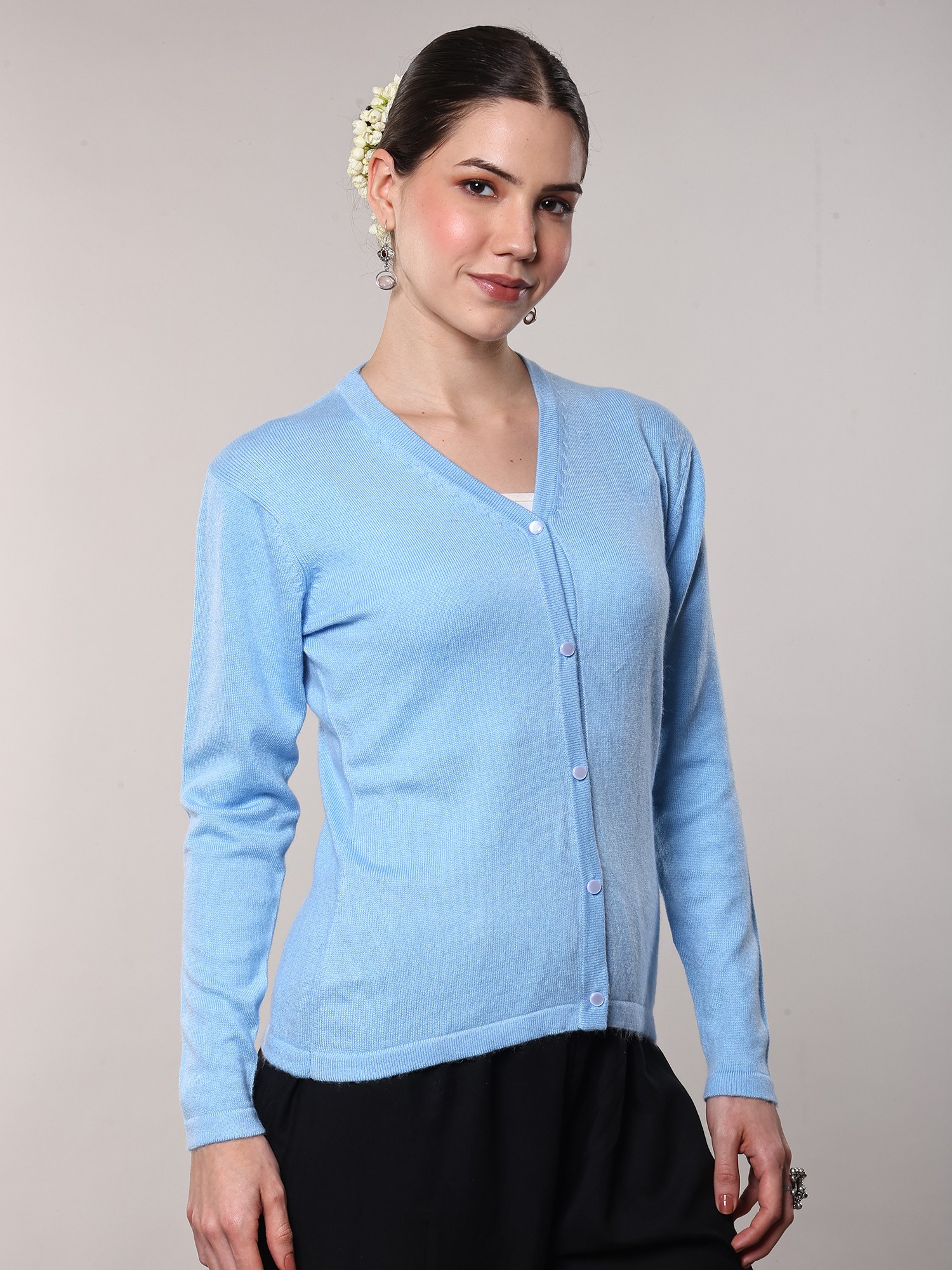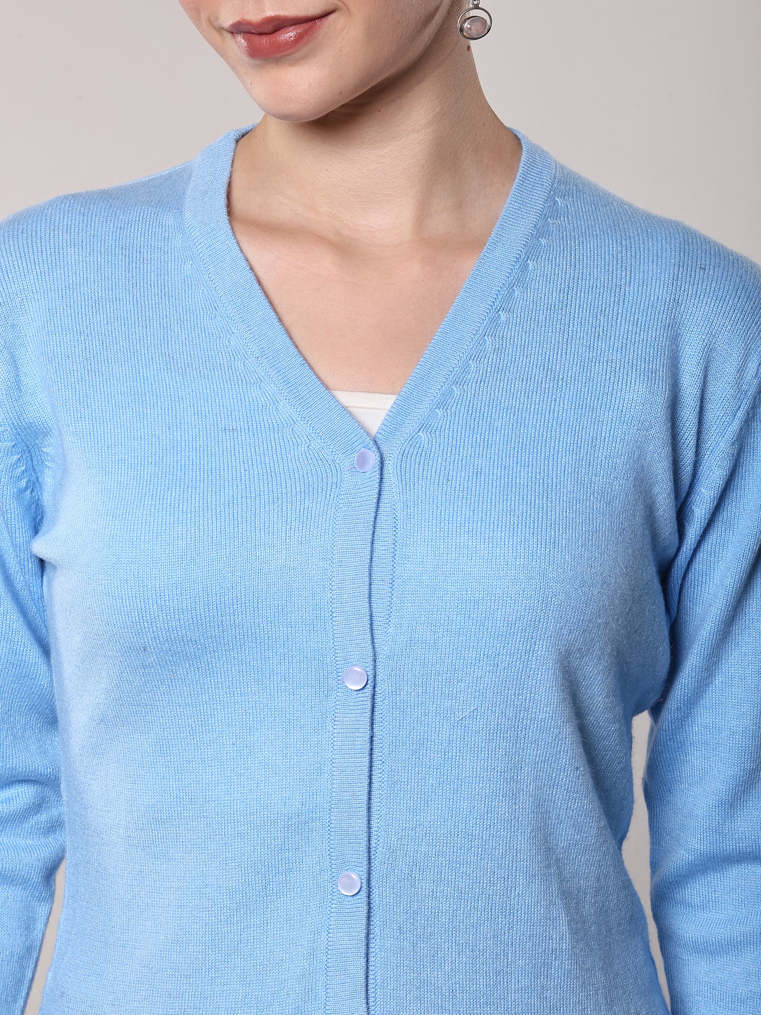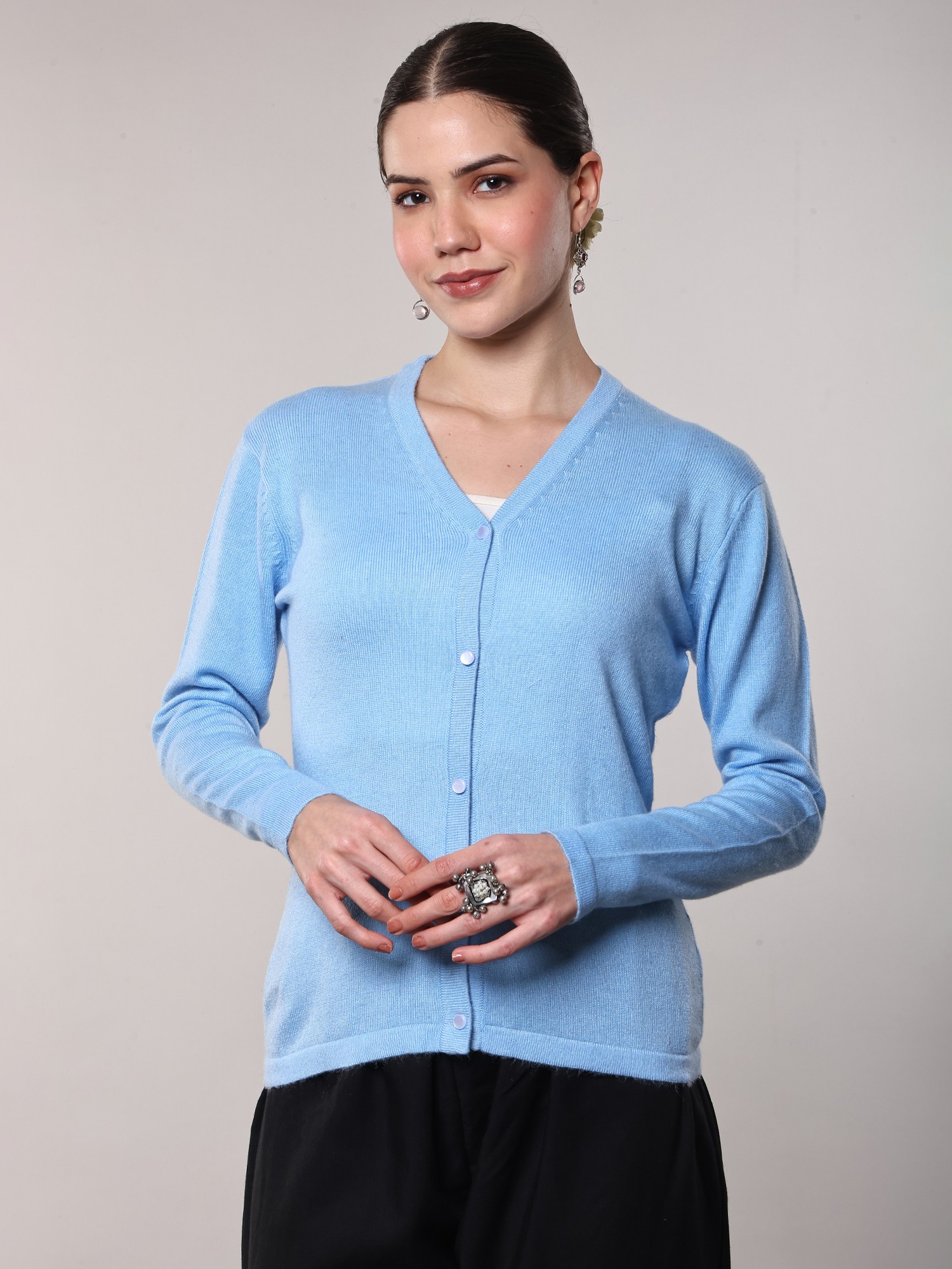 This cardigan’s simple yet sophisticated design makes it incredibly versatile. Wear it open over a t-shirt or a camisole for a relaxed, casual look. Button it up and pair it with a skirt or tailored trousers for a more refined ensemble. It's an ideal layering piece for office wear, adding a touch of warmth and professionalism to your work attire. For cooler evenings, it provides just the right amount of coziness without feeling bulky. The soft blue hue is a charming and versatile color that complements a wide range of other shades, making it easy to integrate into your existing wardrobe. Experiment with different accessories to personalize your look and showcase your individual style.