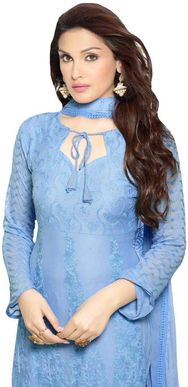 The kameez features a beautifully designed neckline, a subtle keyhole opening accentuated by delicate tie-ups with tassels, adding a touch of feminine charm and allowing for adjustable styling. The long sleeves are also finished with the same exquisite embroidery, mirroring the intricate detailing of the main body of the kameez. The silhouette is designed to flatter, with a graceful flow that moves elegantly with every step. The accompanying chiffon dupatta is equally adorned with matching Aari embroidery and a delicate crochet border, framing the garment with a final touch of artisanal beauty. The ensemble is completed with comfortable churidar bottoms, ensuring a perfect fit and a cohesive, polished look. This Angel-Falls Salwar Kameez is more than just an outfit; it's an heirloom in the making, a testament to the enduring beauty of traditional Indian textile art. It's the perfect choice for weddings, festivals, parties, or any event where you desire to radiate elegance and grace.