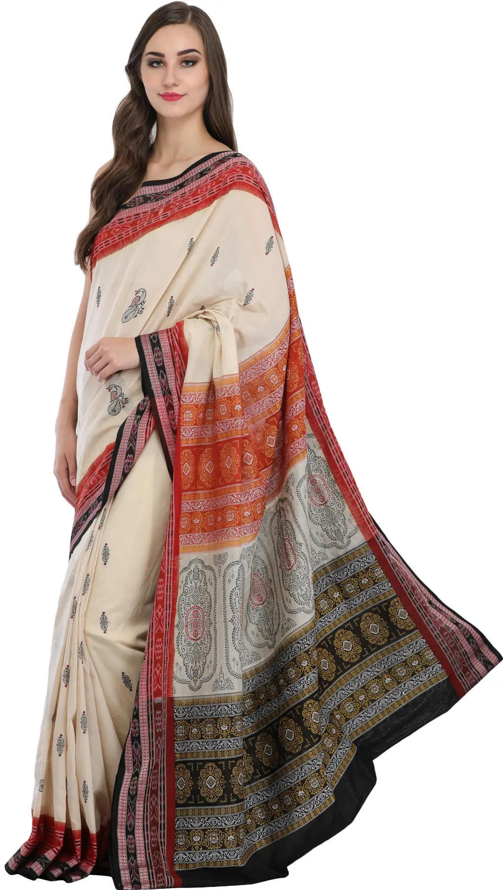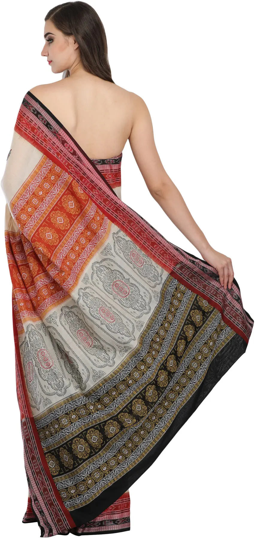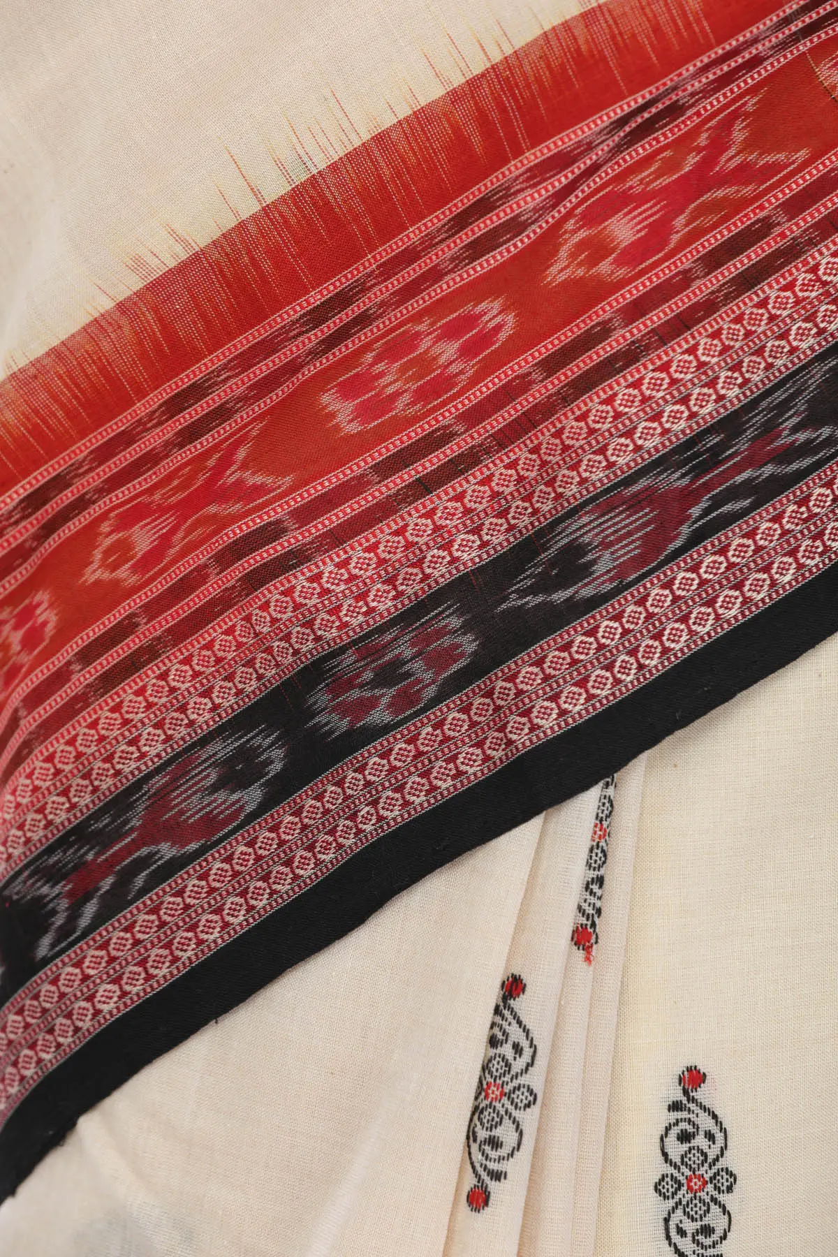 Cactus-Flower Pure Cotton Ikat Handloom Saree with Woven Fish Wide Border and Lady Figure Motifs from Sambhalpur