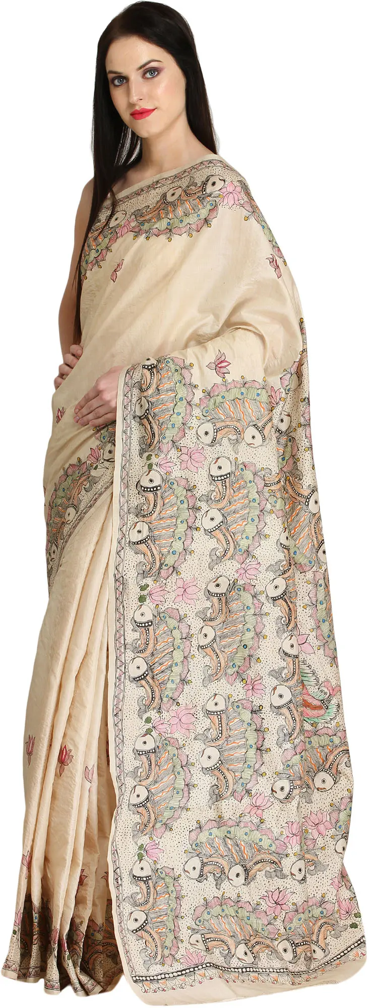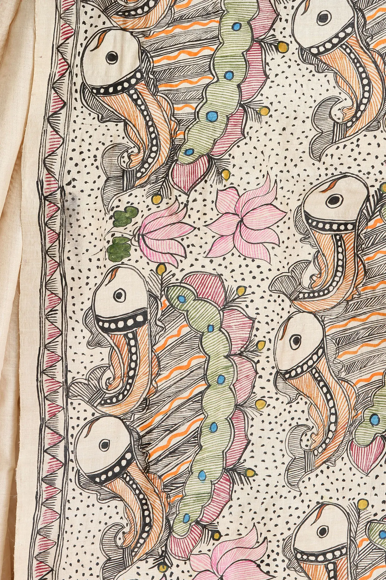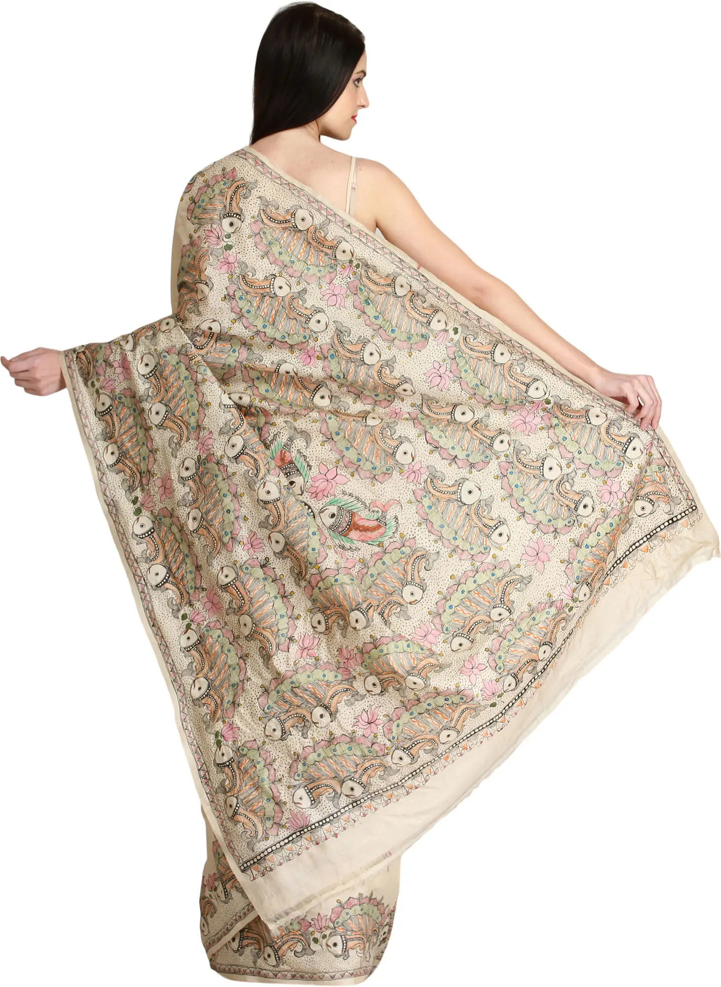 Antique-White Madhubani Hand-Painted Sari from Bihar with Auspicious Fishes