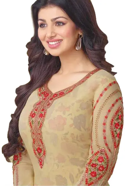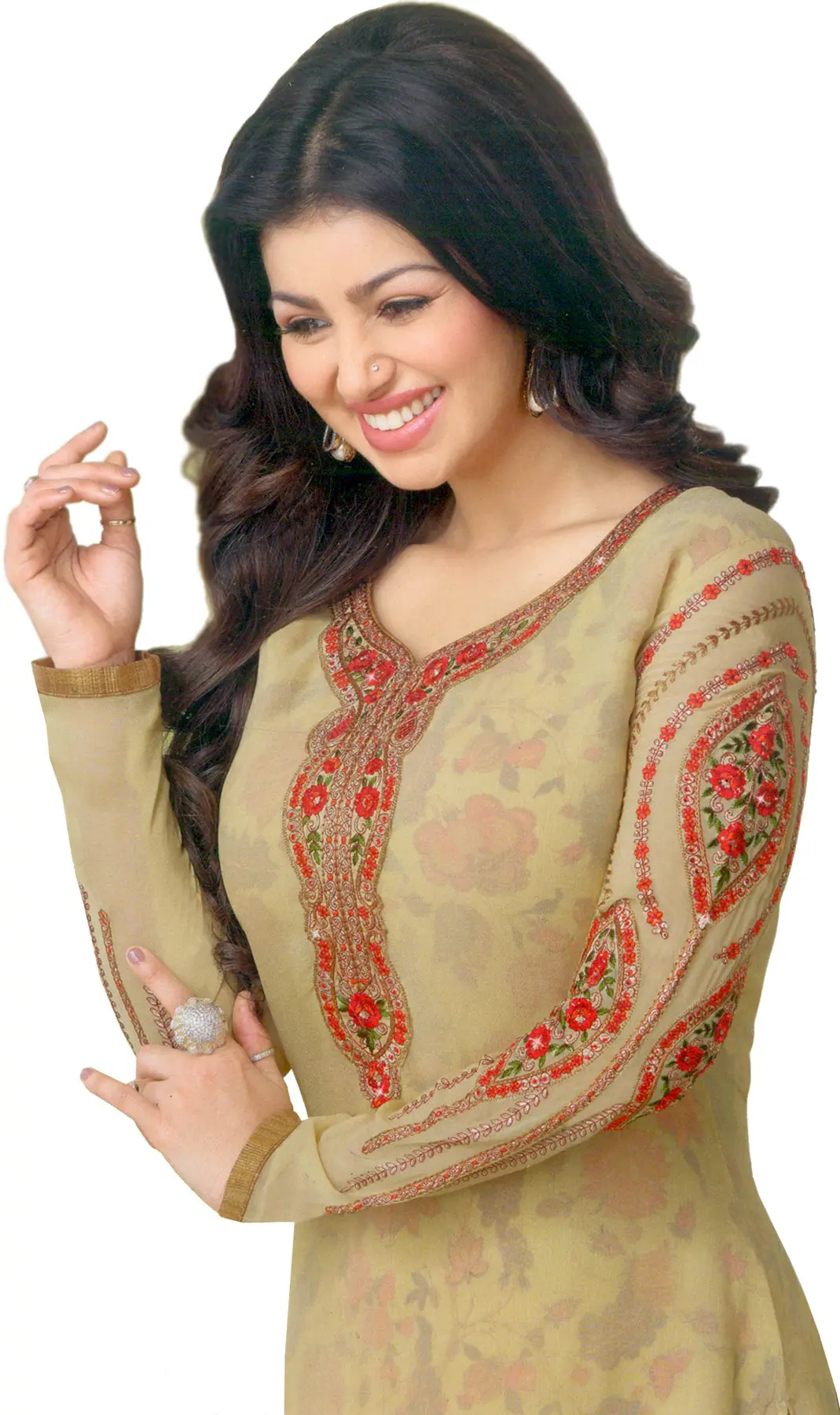 Step into a world of understated elegance with this exquisite georgette kameez suit, designed to make you feel effortlessly beautiful. The soft apricot-gelato hue serves as a delicate canvas for a subtle, all-over floral print in muted tones, evoking a sense of romantic grace. This ensemble is perfect for those who appreciate a sophisticated yet comfortable style, lending itself beautifully to a variety of occasions, from casual gatherings to more formal events. The neckline is a true highlight, featuring intricate embroidery in vibrant shades of red and green. This detailed work forms a captivating motif, drawing the eye and adding a touch of regal flair to the garment. The same meticulous embroidery graces the sleeves, creating a cohesive and polished look. The long sleeves are elegantly finished, ensuring a refined silhouette.