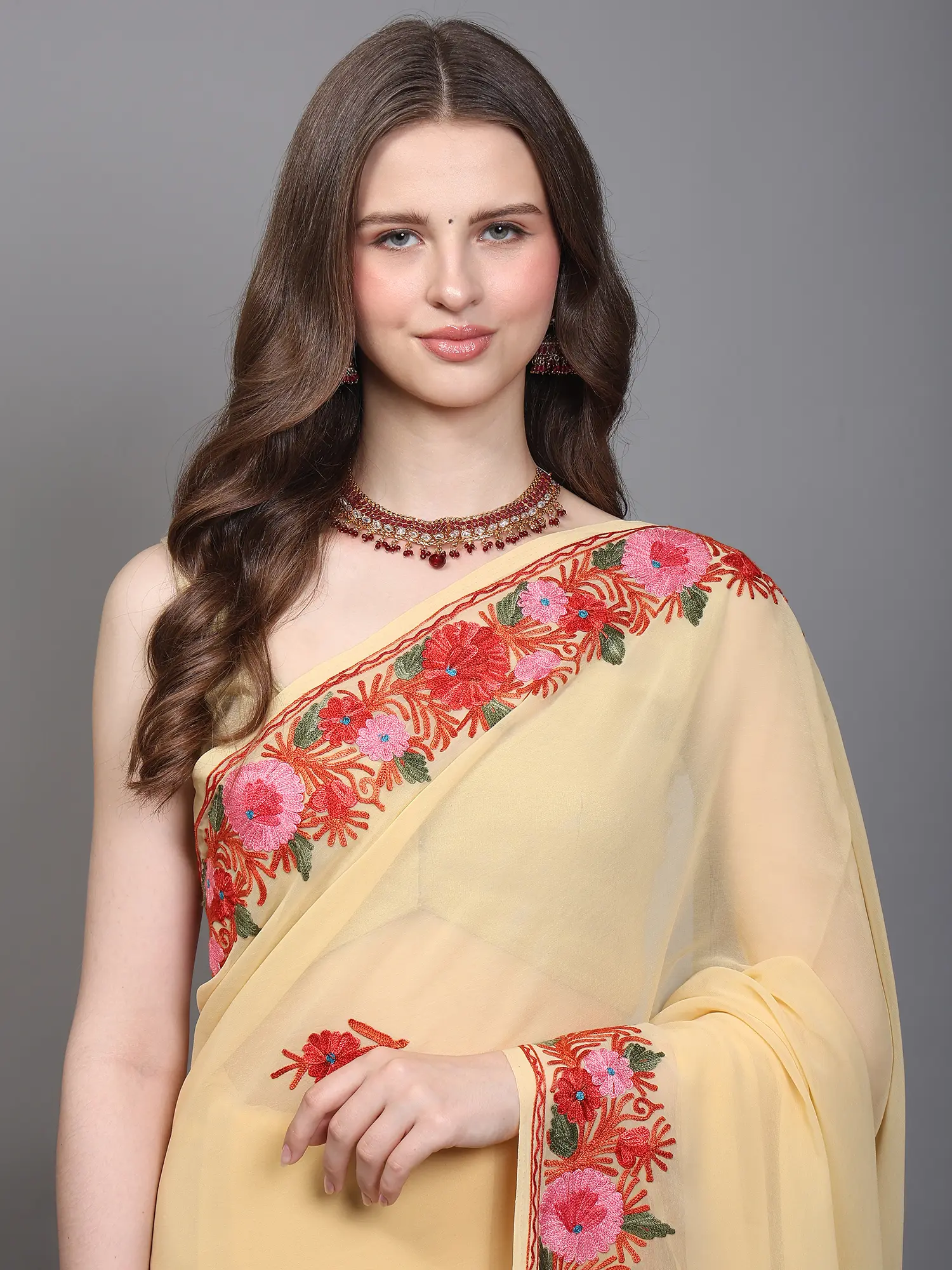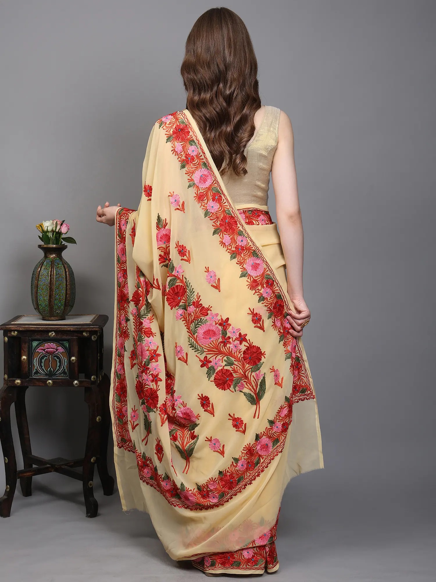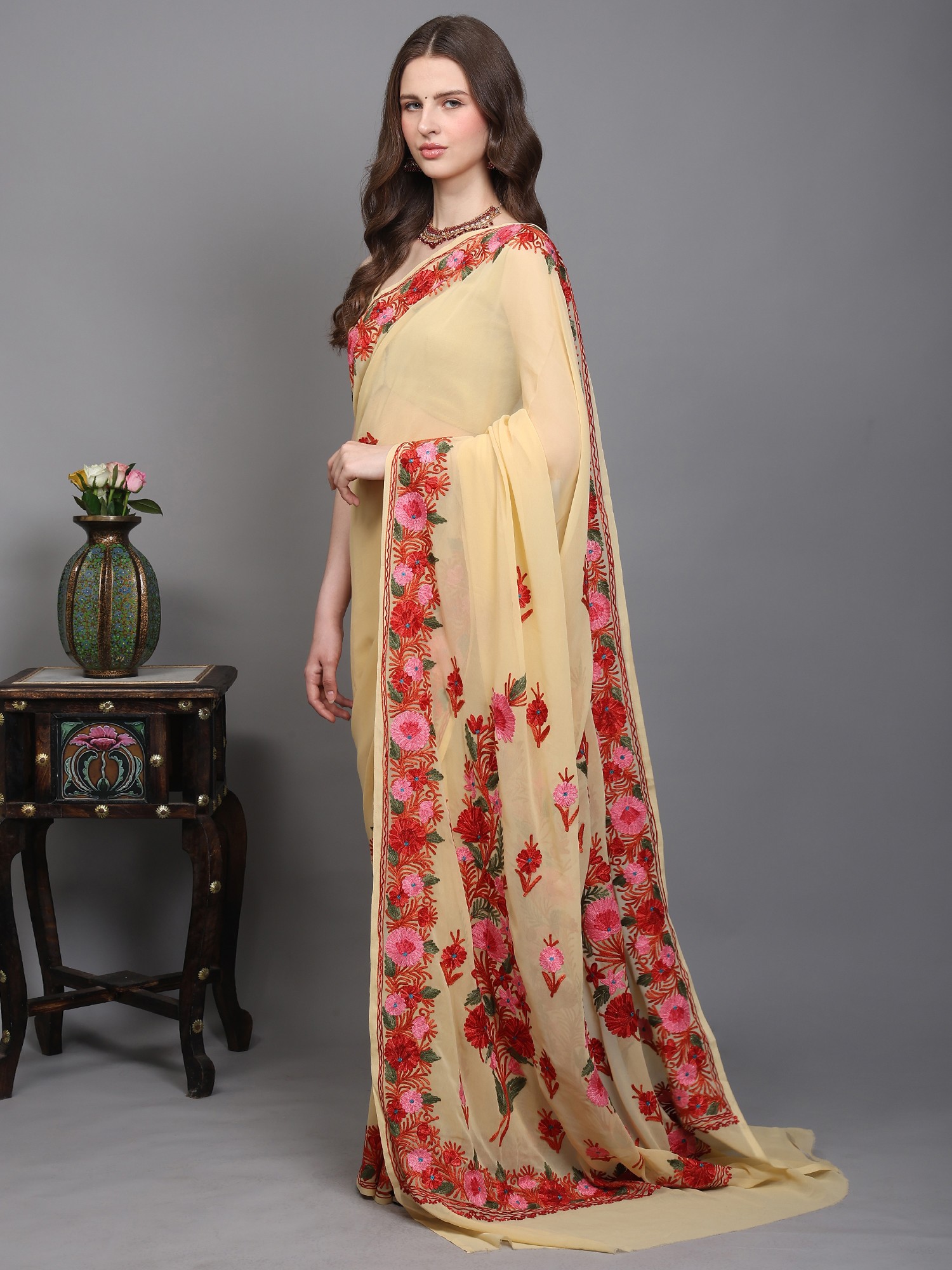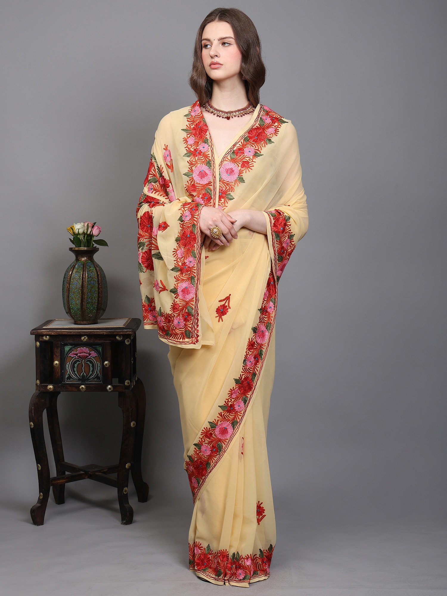 Macaw-Green Floral Aari Embroidered Georgette Saree from Kashmir