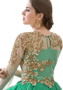 This Anarkali suit is more than just an outfit; it's a statement of timeless glamour and refined taste. The harmonious blend of the refreshing aqua-green color, the intricate zari embroidery, and the flattering Anarkali cut ensures you will turn heads and capture hearts. It is an ideal choice for brides seeking a unique and memorable ensemble for their wedding ceremonies, receptions, or other significant pre-wedding festivities. Pair this magnificent Anarkali with statement ethnic jewelry and elegant heels to complete your bridal look. Its versatile design also makes it suitable for other grand occasions where you wish to make a lasting impression. Embrace the exquisite craftsmanship and luxurious feel of this designer Anarkali suit and radiate confidence and beauty.