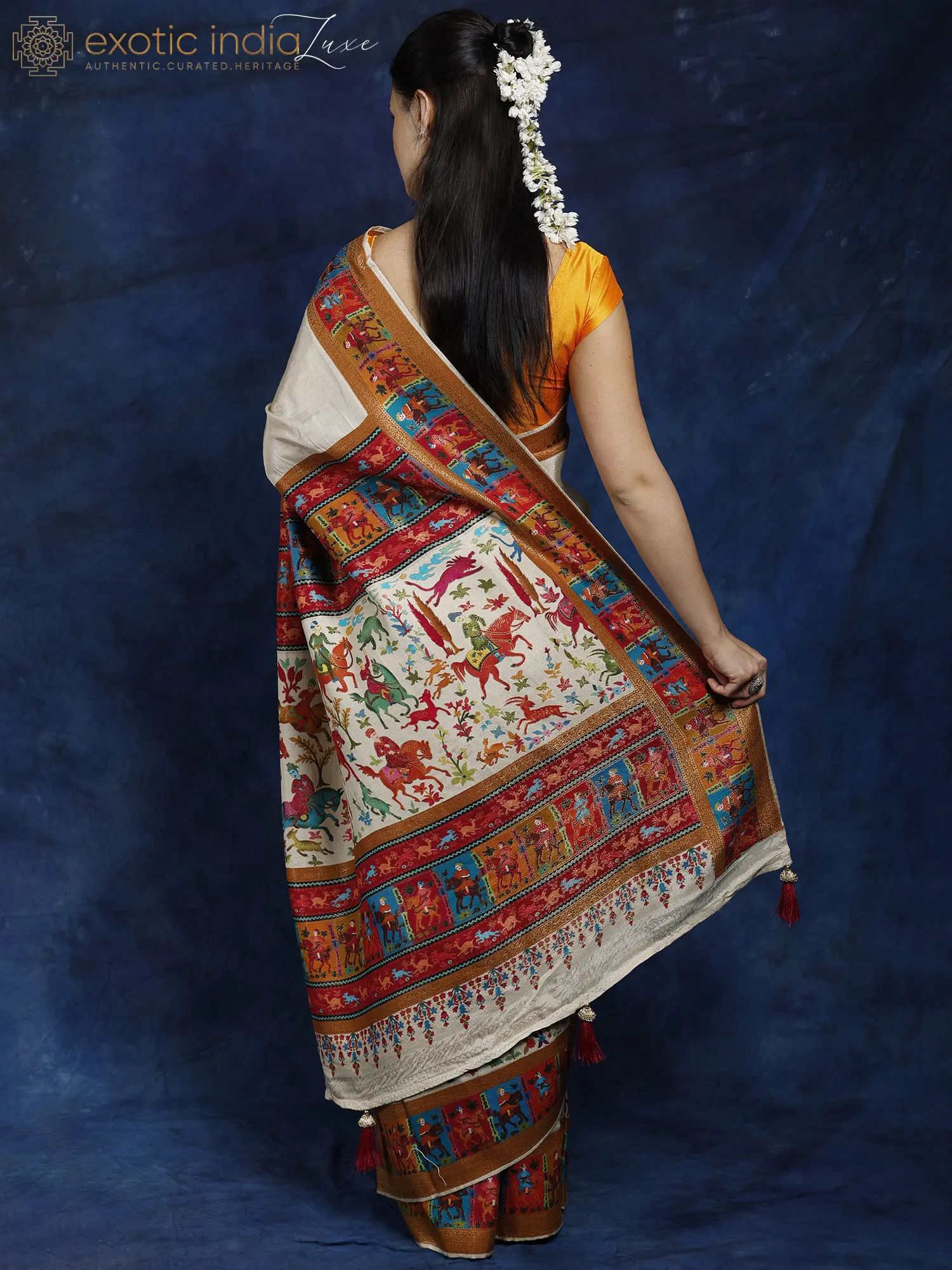 The subtle cream hue of the Crepe Silk serves as a perfect canvas for the vibrant narrative woven into its borders. Deep blues, fiery reds, earthy browns, and subtle greens come together to create a captivating visual symphony. Notice the meticulous detail in the depiction of horses, their musculature defined, and the riders, each with distinct attire and expressions. These scenes evoke a sense of grandeur and a bygone era, making this saree a truly captivating statement piece.