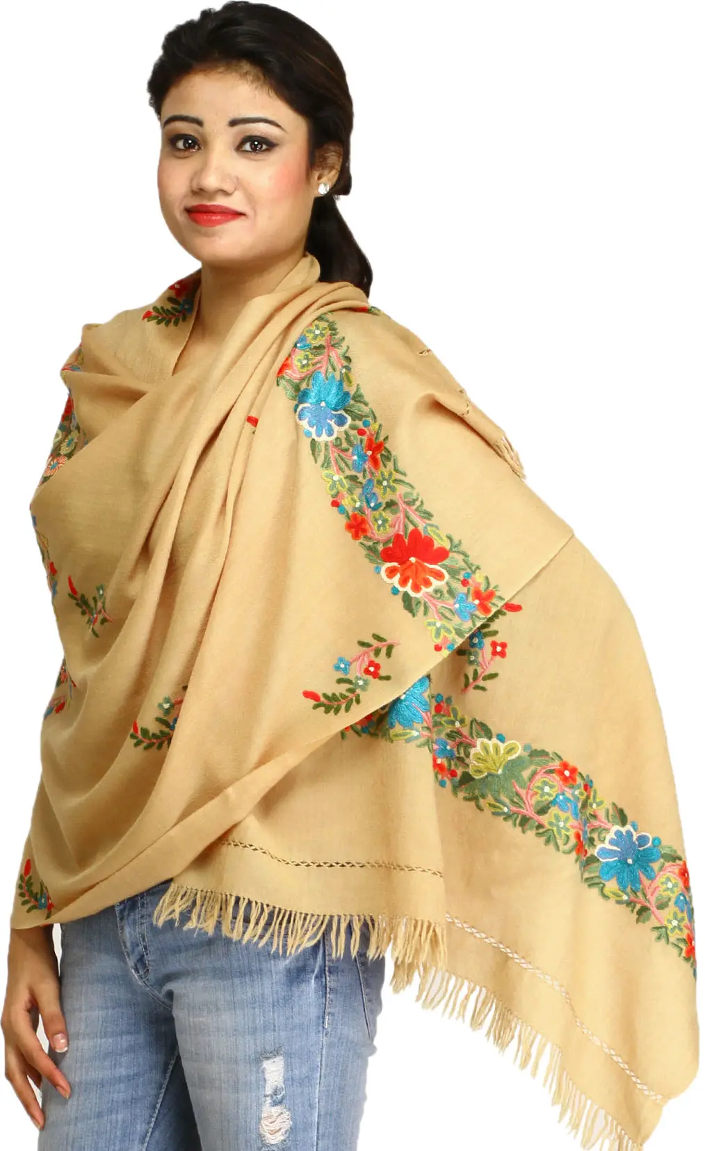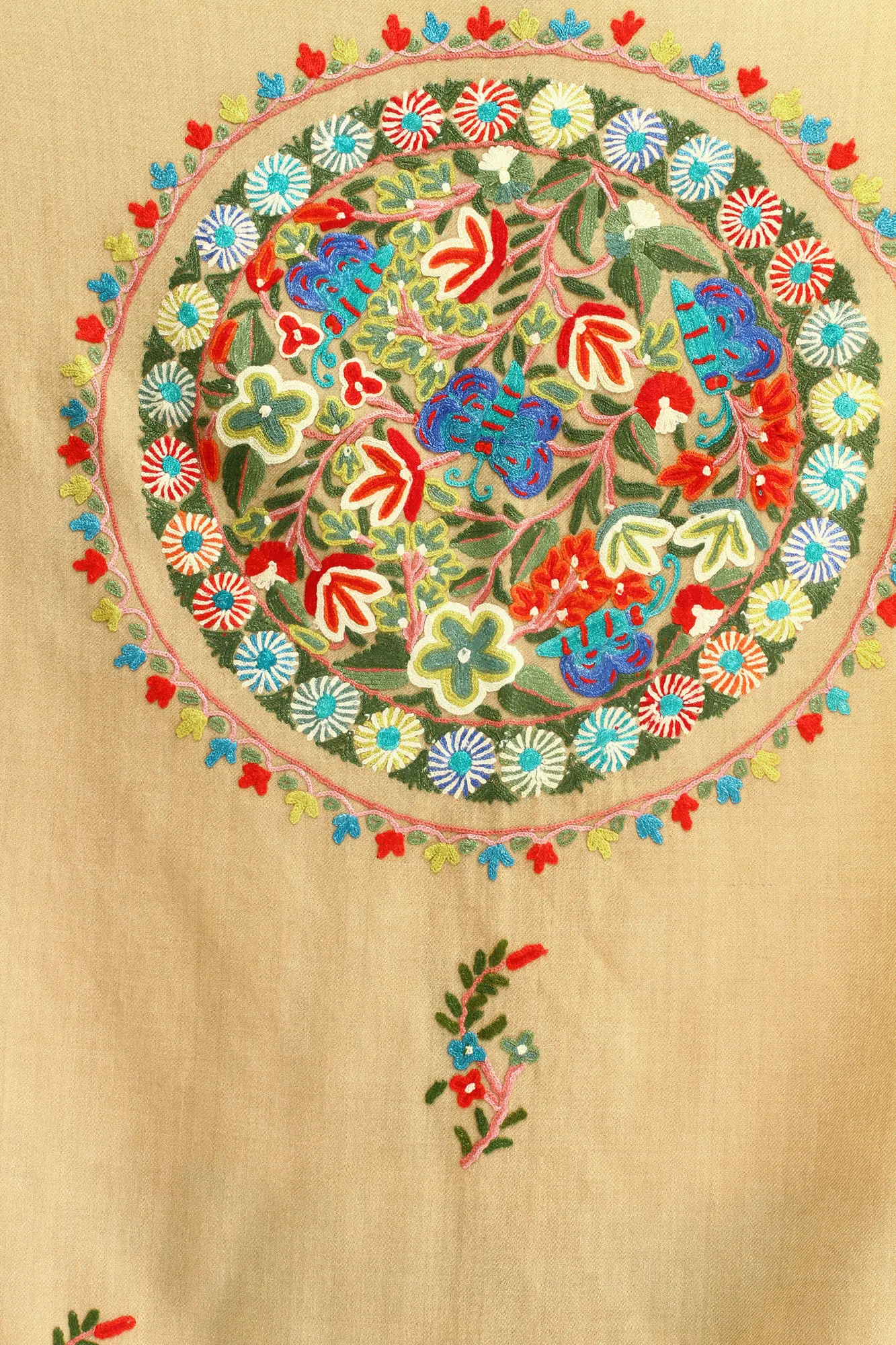 Take a deep dive into the intricate beauty of our Ari Kashmiri Chakra Stole. Kashmiri artisans have painstakingly hand-embroidered delicate floral patterns and whimsical butterflies onto this stole, showcasing the region's centuries-old embroidery traditions. The colors chosen reflect the rich, natural landscapes of Kashmir. The captivating Chakra design has a deep-rooted history and remains relevant in today's fashion world, exuding elegance and timelessness. Wearing this stole is like draping yourself in art, celebrating the heritage of the Kashmir Valley while staying in vogue.
