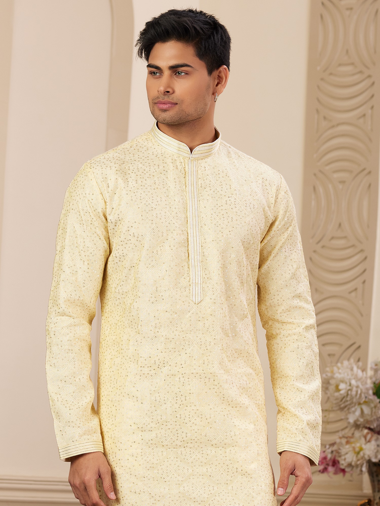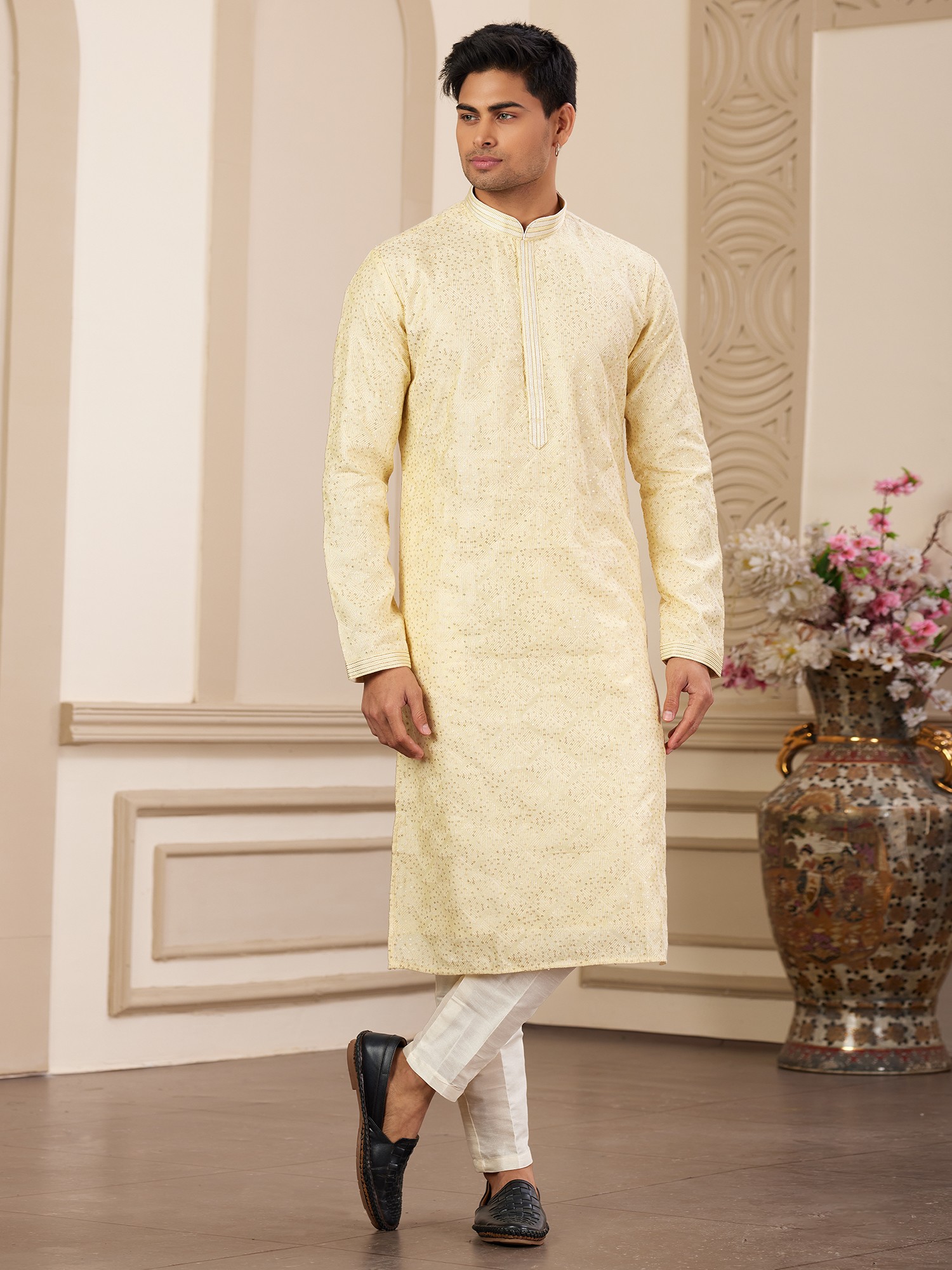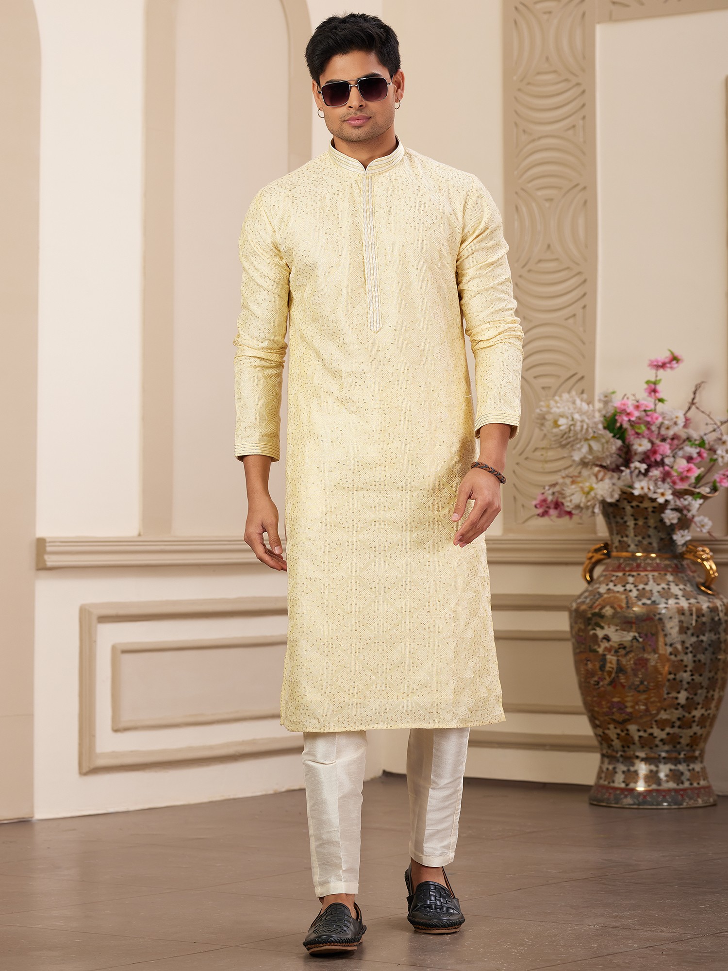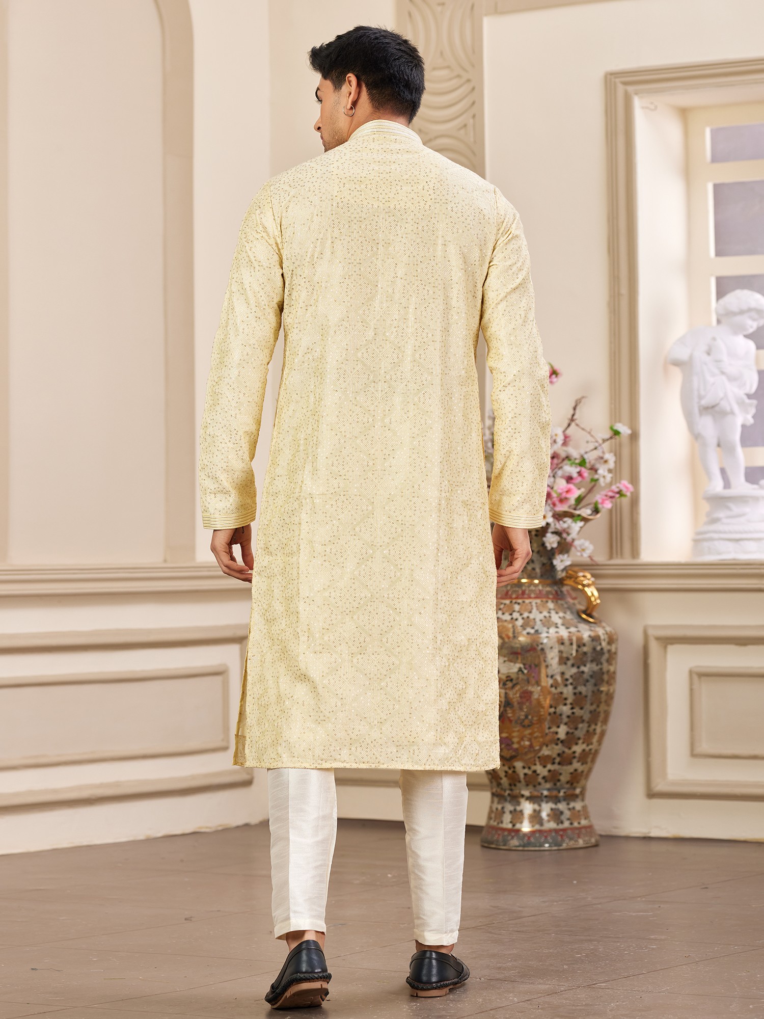 Stylish All Over Sequins Work And Mandarin Collar Casual Wear Art Banarasi Silk Kurta Pajama Set