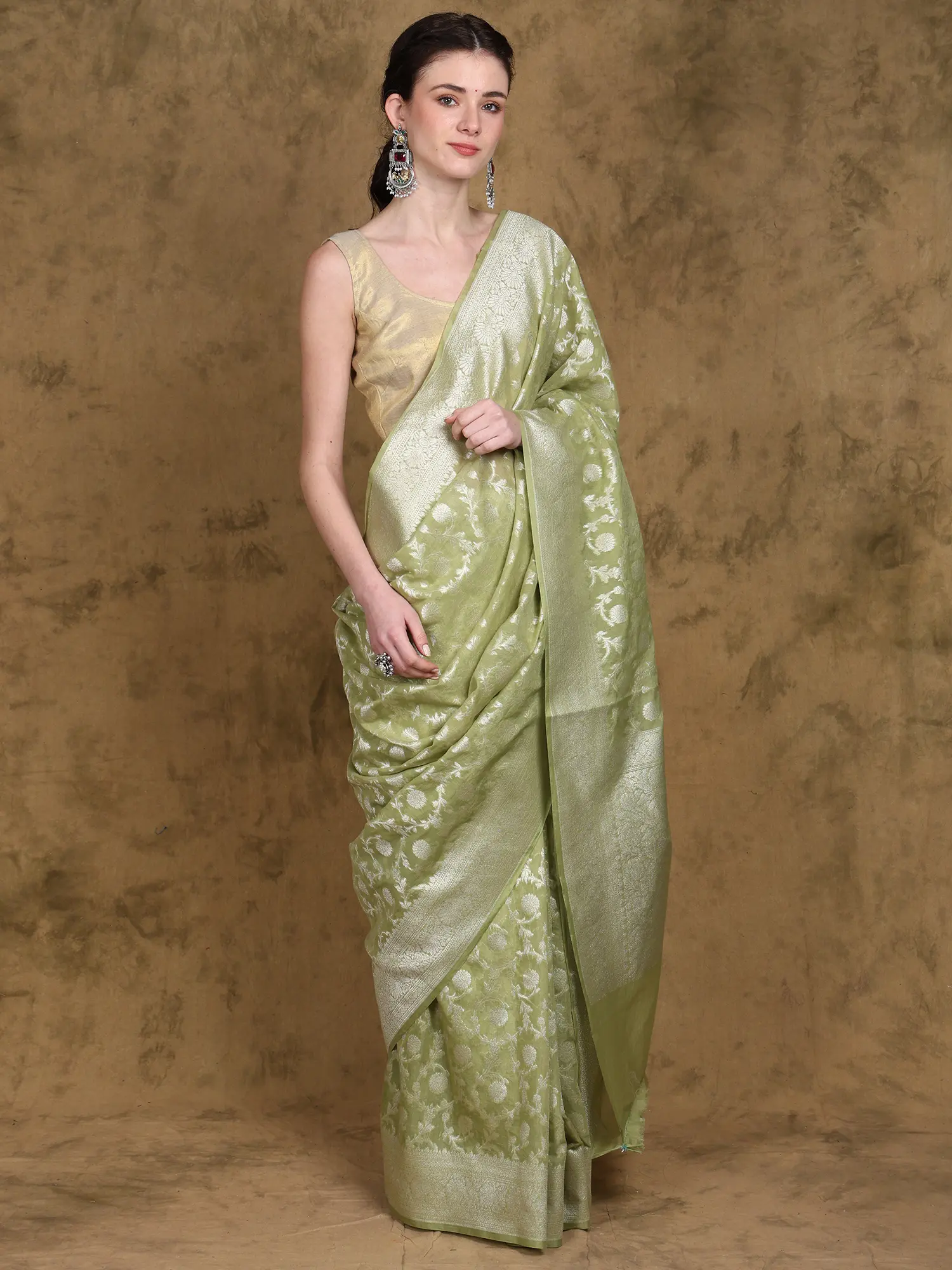 Beach-Glass Pure Silk Banarasi Saree with Zari Brocaded Floral Butta and Paisley Border