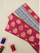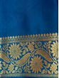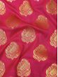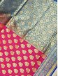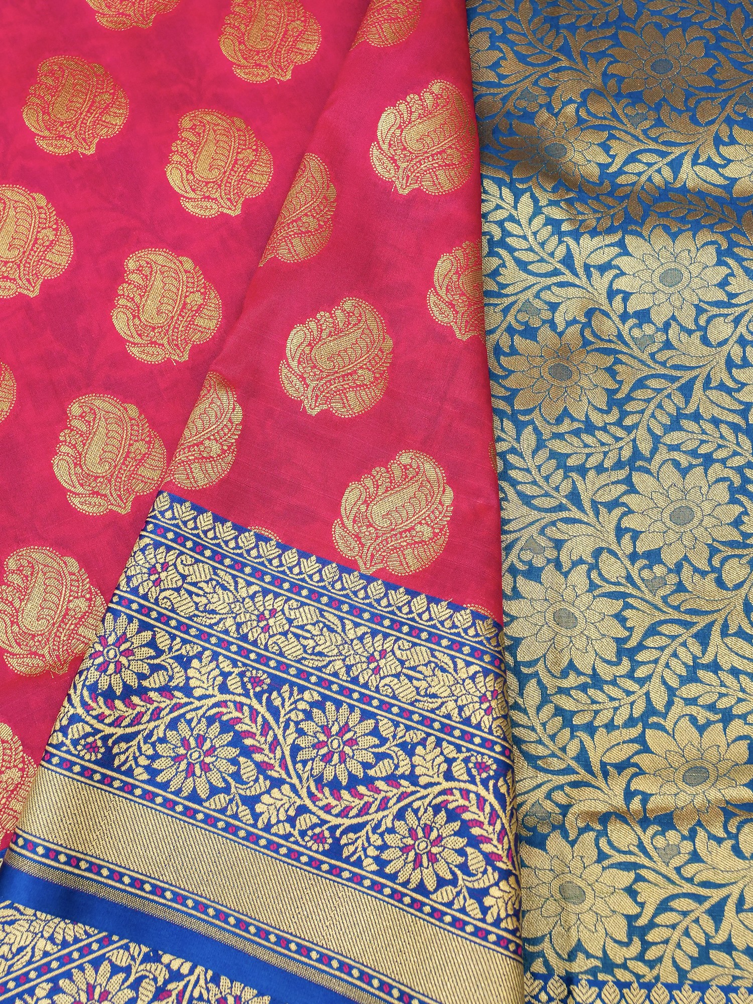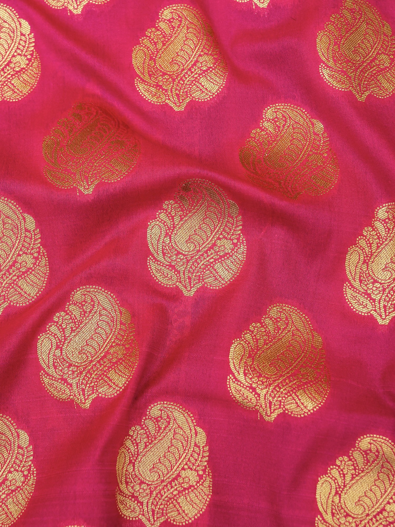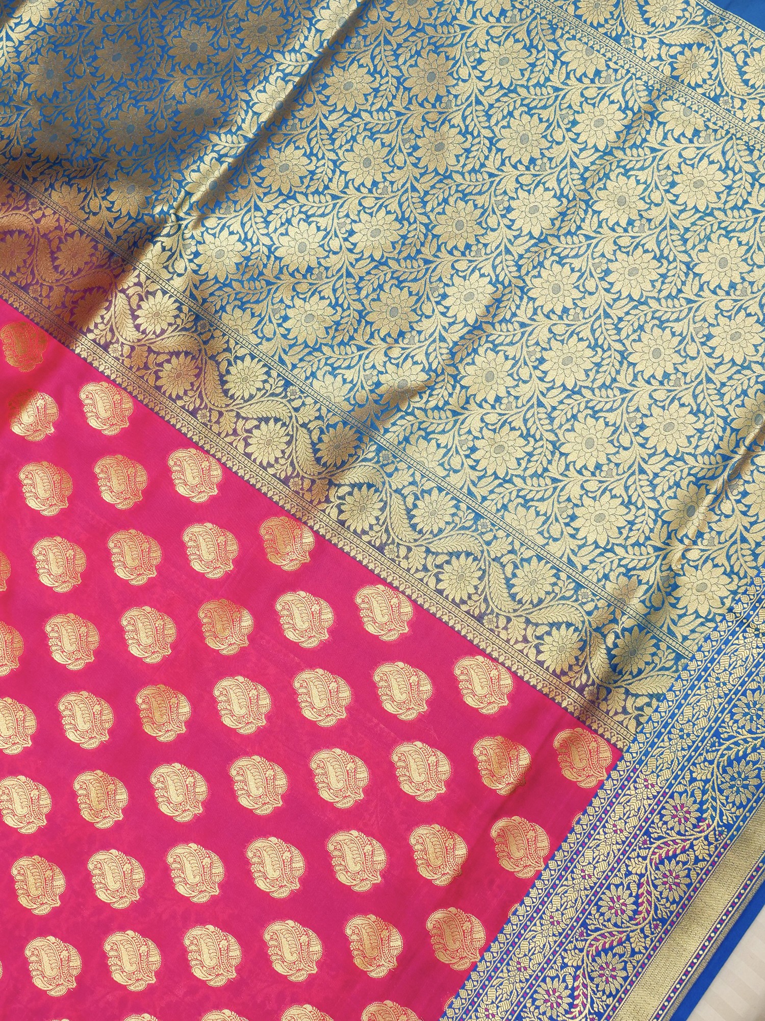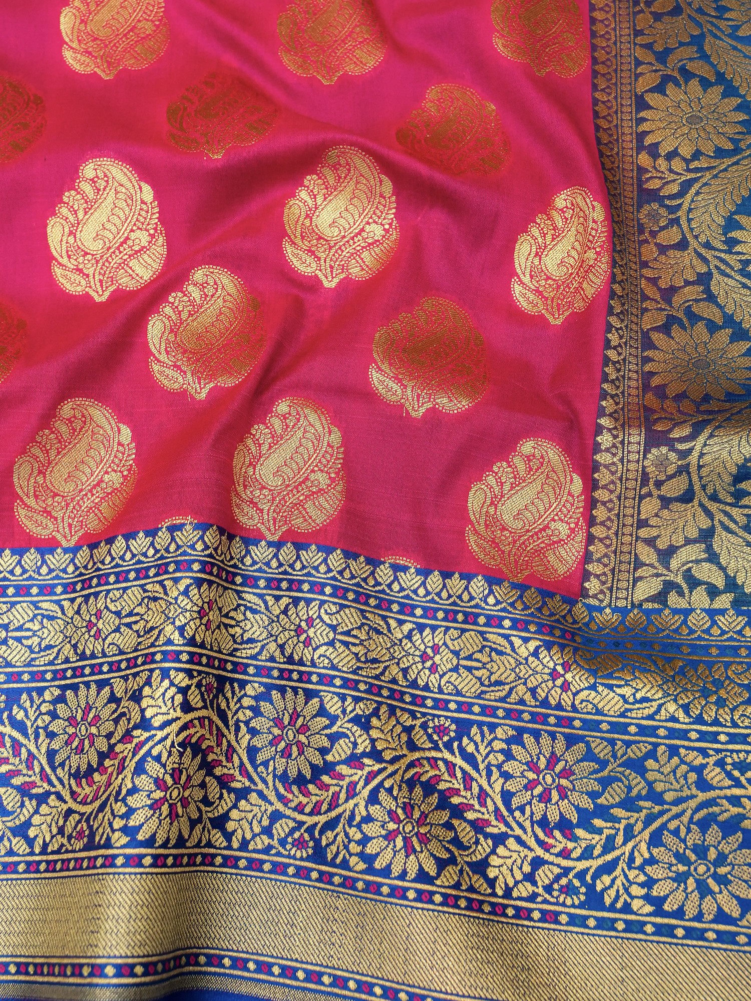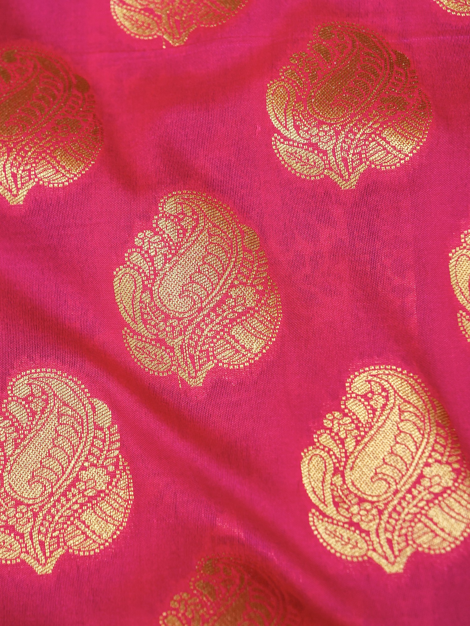 The field of the saree is stunningly decorated with a mango Buta pattern created with golden threads that contrast with the silken backdrop.