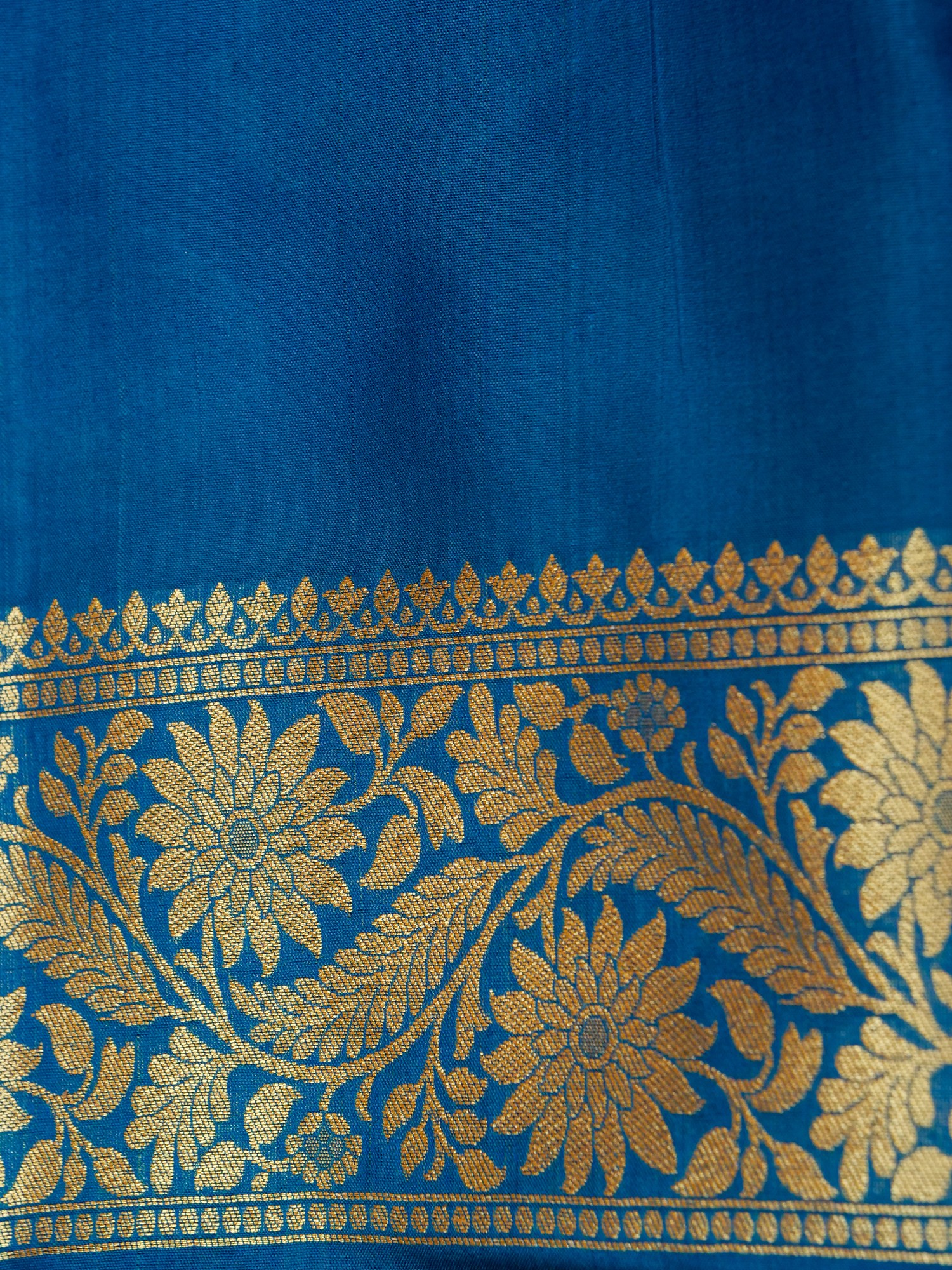 The saree's border has a contrasting color beautified by flowing diasey vines created with golden and silk threads that give the saree an intricate element.