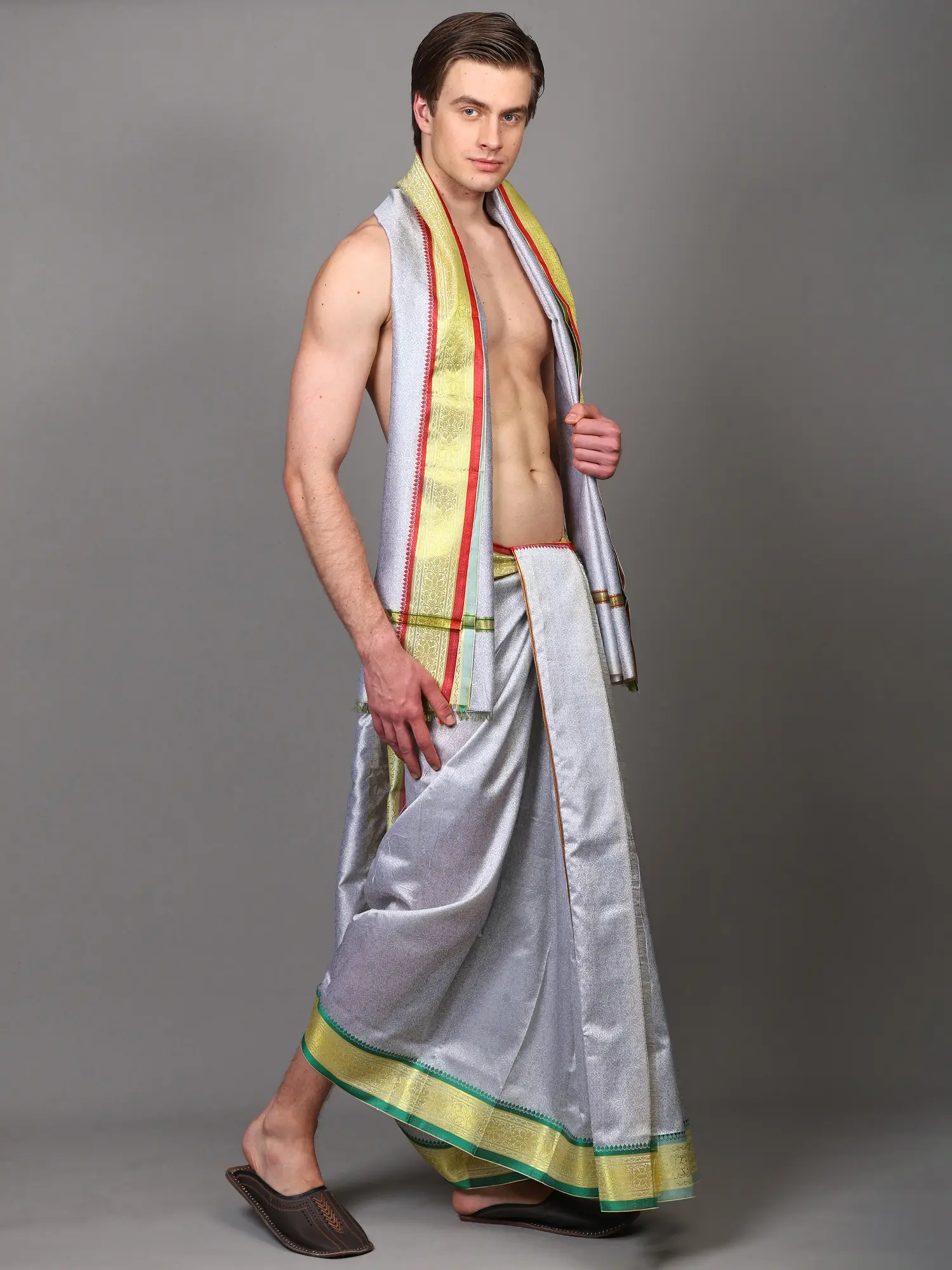 This Art Silk Dhoti and Angavastram set is designed for the modern man who appreciates tradition and style. The generous dimensions of the dhoti ensure a comfortable and adaptable drape, allowing for freedom of movement. The accompanying Angavastram adds a layer of refined grace. Whether you are participating in a traditional ritual, attending a wedding, or celebrating a cultural festival, this ensemble will ensure you stand out with understated panache and impeccable taste. It's a perfect choice for those seeking to connect with their roots while exuding an aura of sophistication and grace.