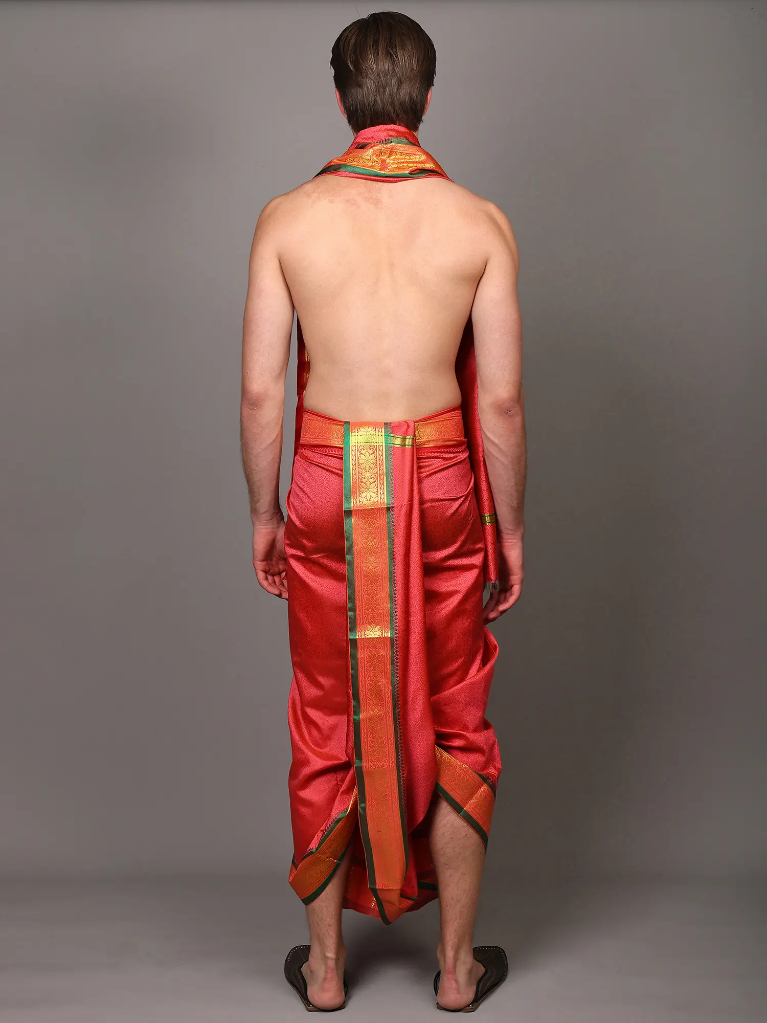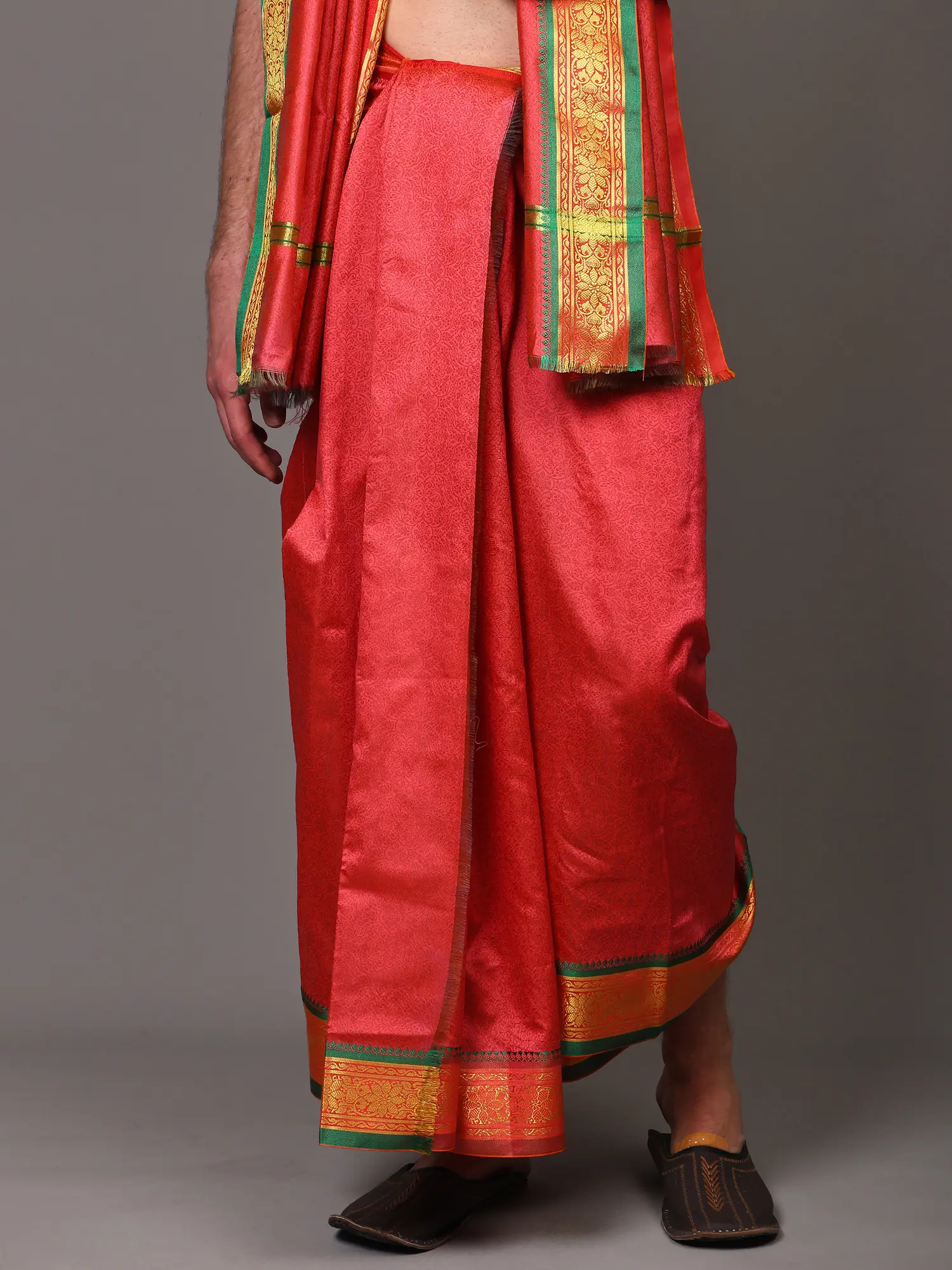 The vibrant, sun-kissed orange of the dhoti and angavastram evokes warmth and auspiciousness. Adding a regal touch, the ensemble features a striking Zari woven temple border. The intricate Zari work, with its metallic threads, creates a dazzling contrast against the rich orange, forming traditional temple motifs that speak of heritage and divinity. The border is further accentuated by a complementary green trim, adding a touch of sophistication and visual depth. The Angavastram, draped elegantly over the shoulders, completes the ensemble, creating a harmonious and eye-catching silhouette.