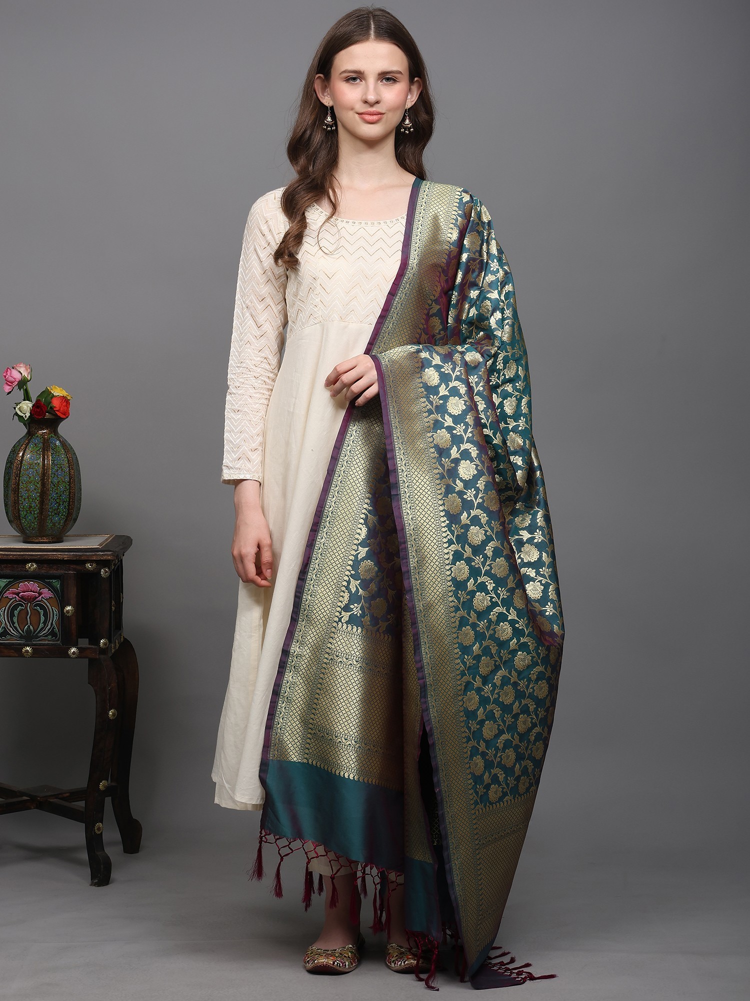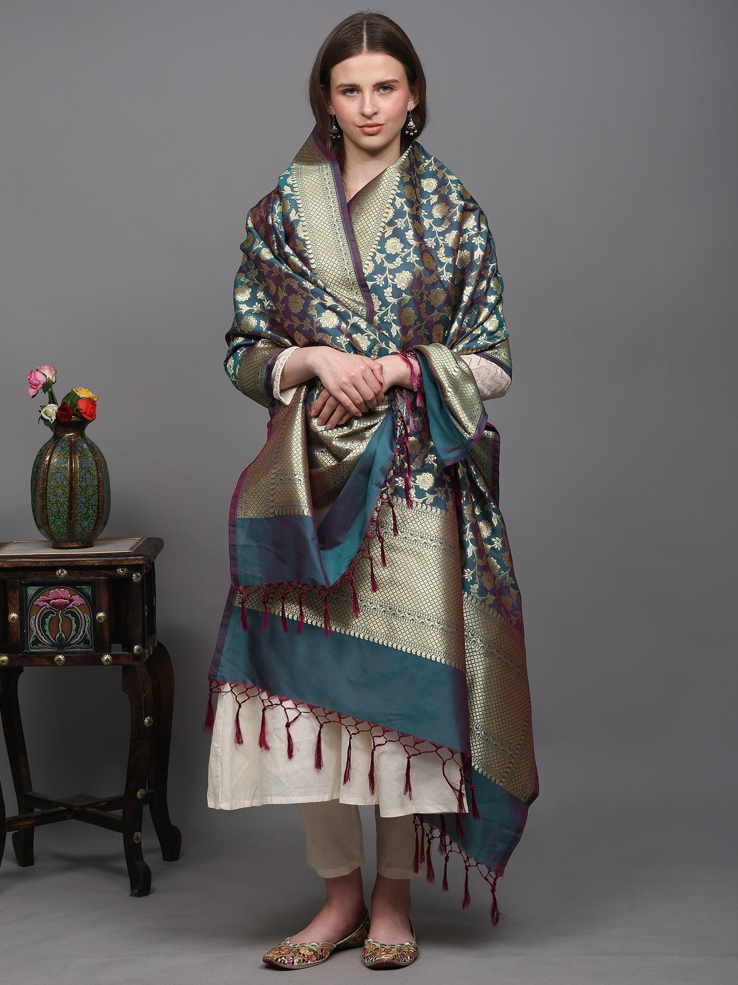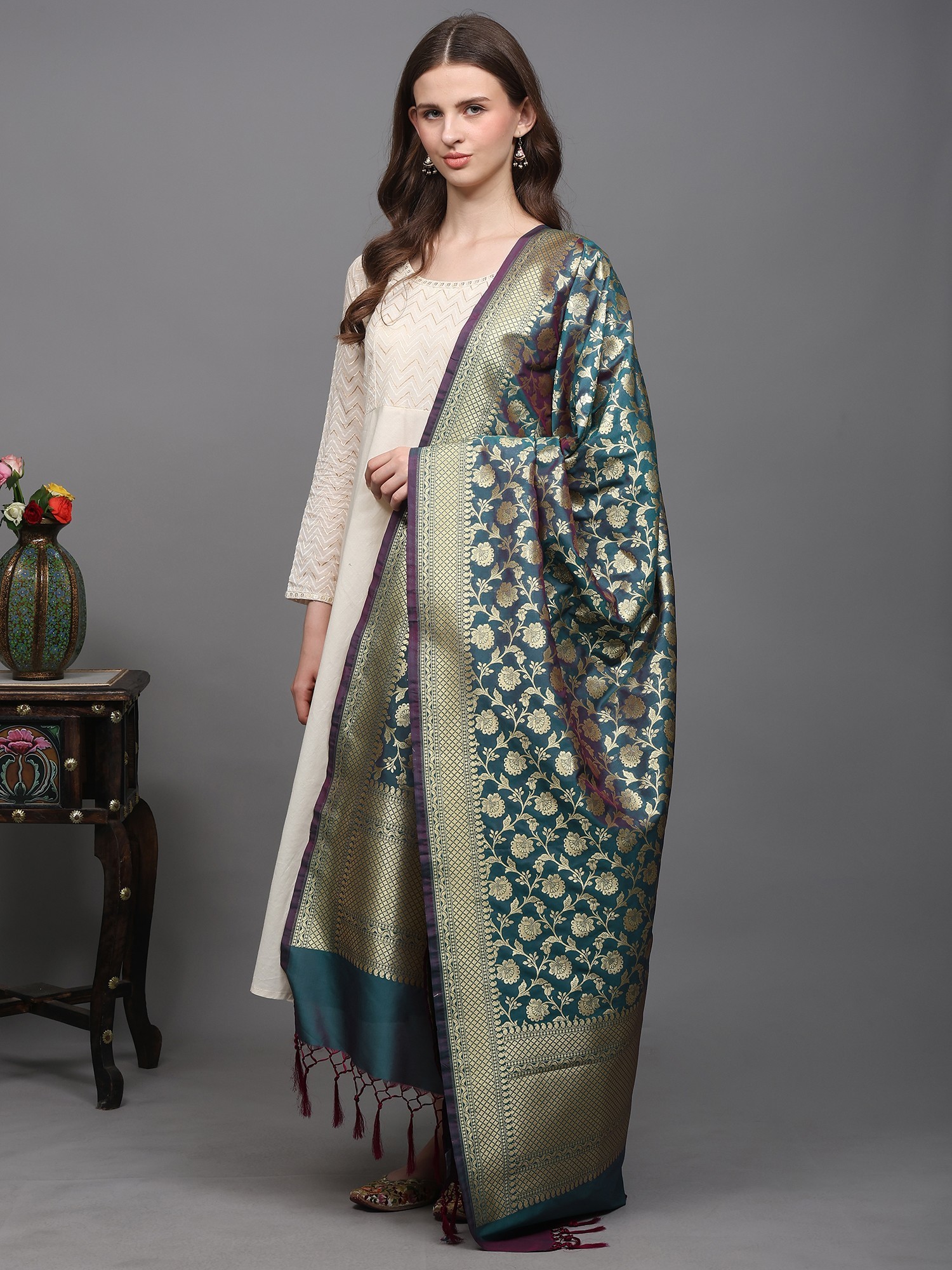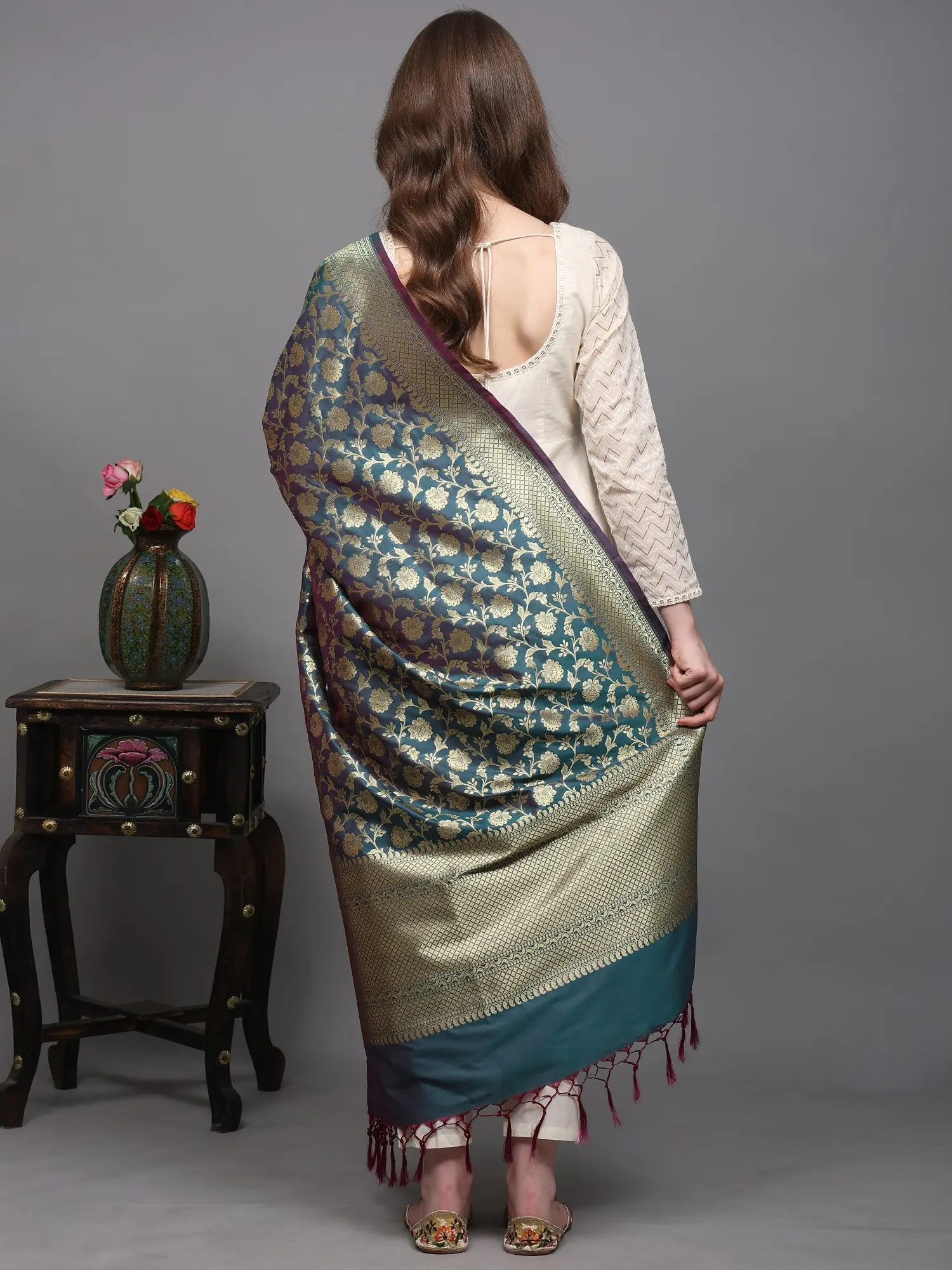 Banarasi Art Silk Dupatta with Zari Woven Golden Floral Bootis and Contrast Border