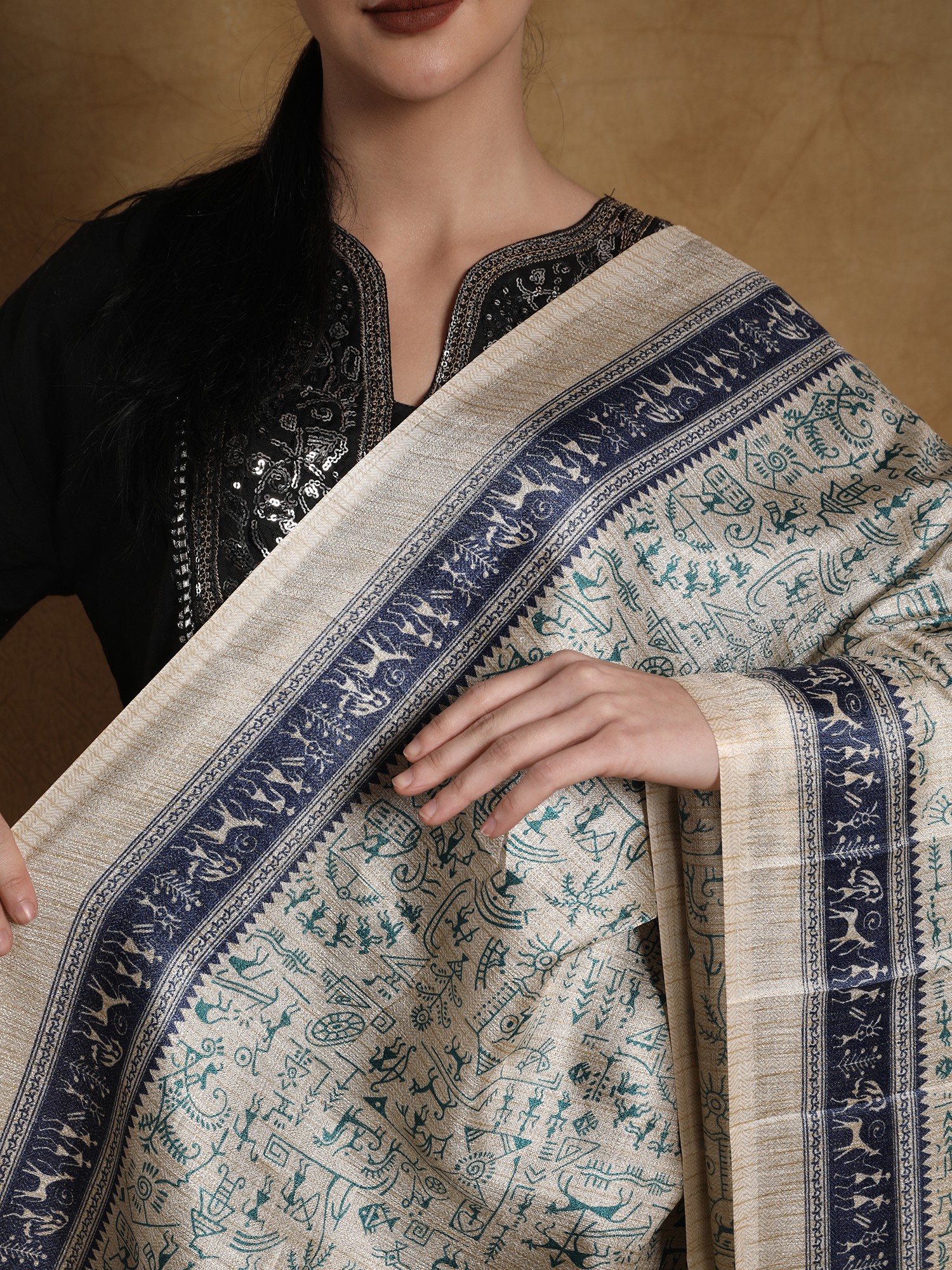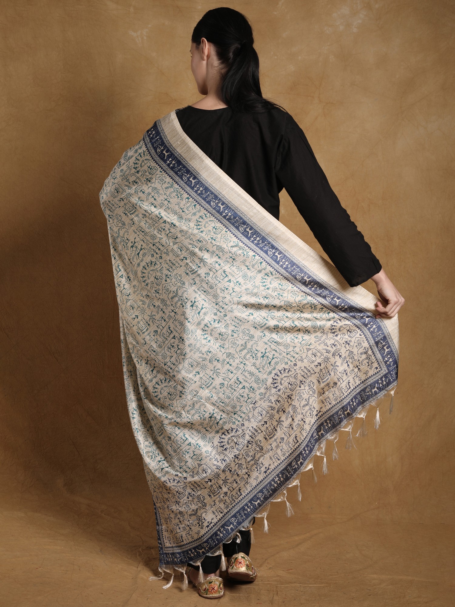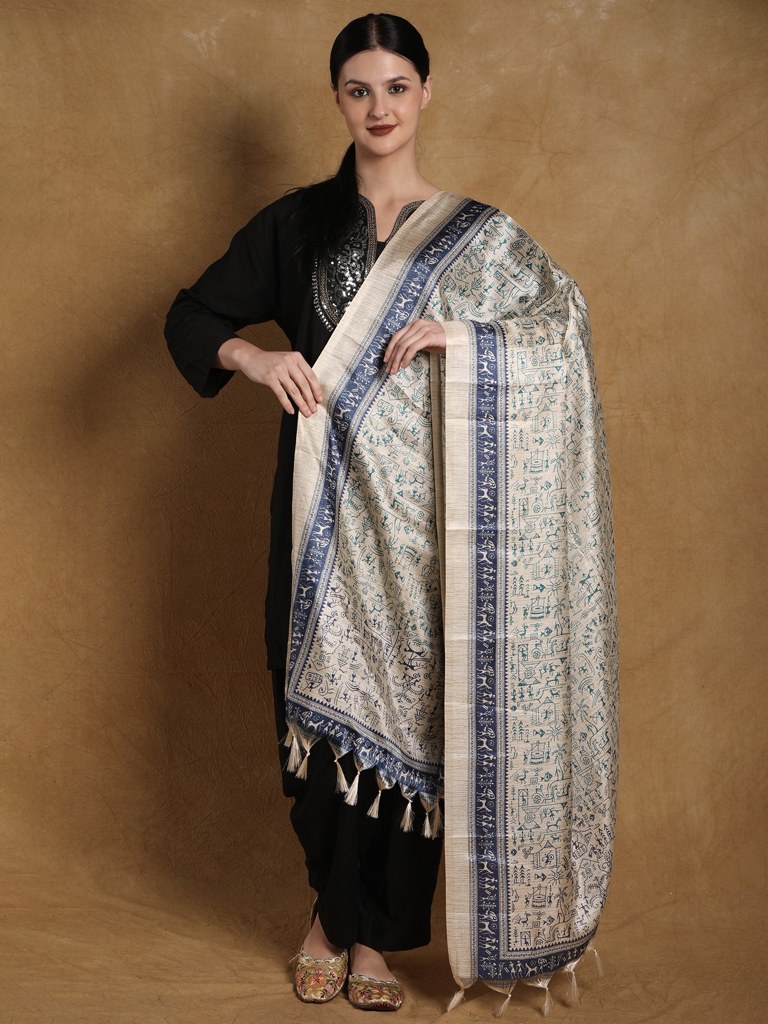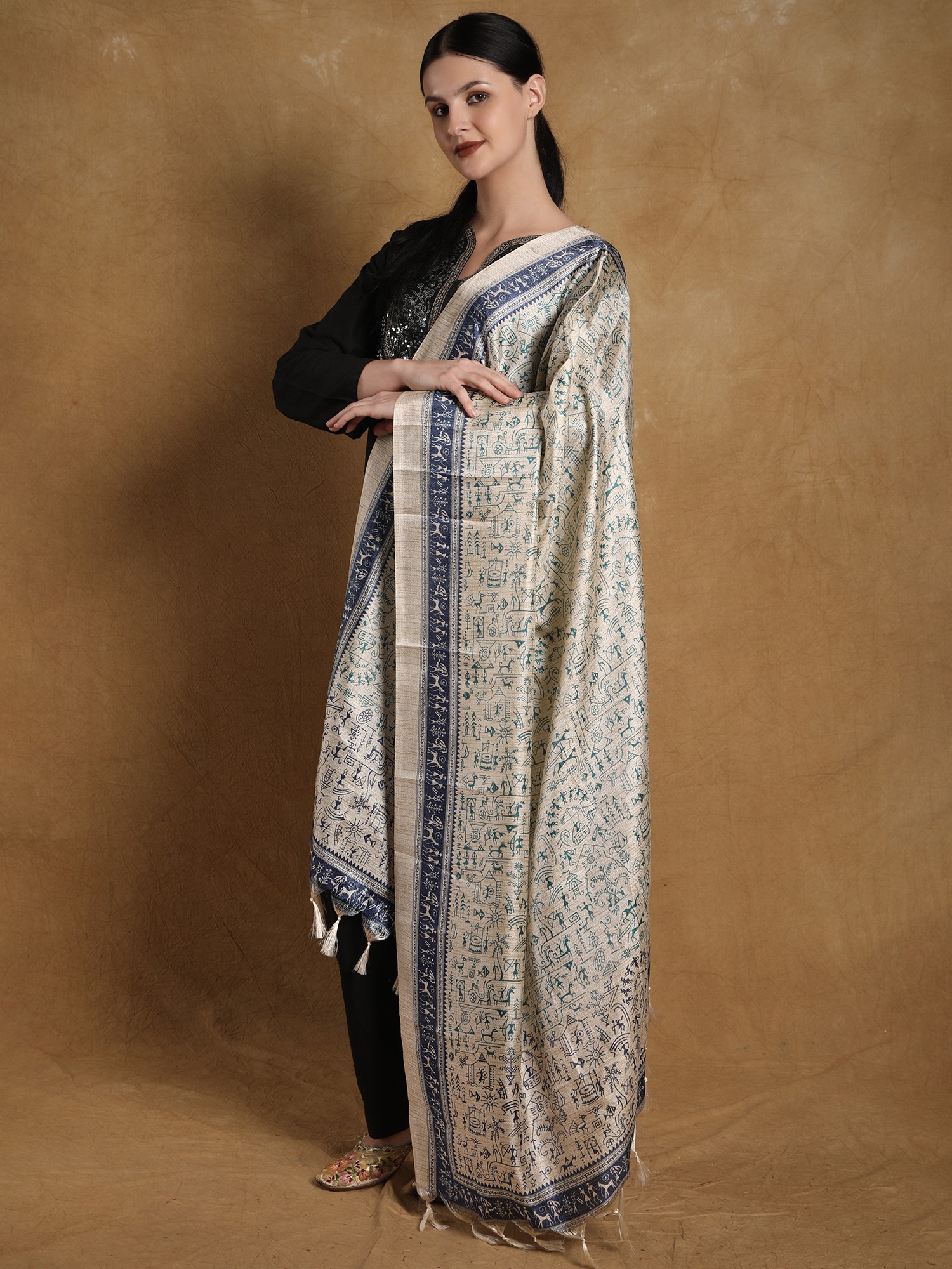 The art of Warli is a story of humankind- the day-to-day life and the great adventures of survival, bundled together with simple yet intriguing motifs that are loved by art enthusiasts all over the world. The magical world of Warli is recreated on the gentle canvas of art silk in this printed dupatta, an elegant piece of clothing for your ethnic looks. Traditional Warli images intricately fill the field of the dupatta, giving you a gem from the treasures of India’s folk culture.