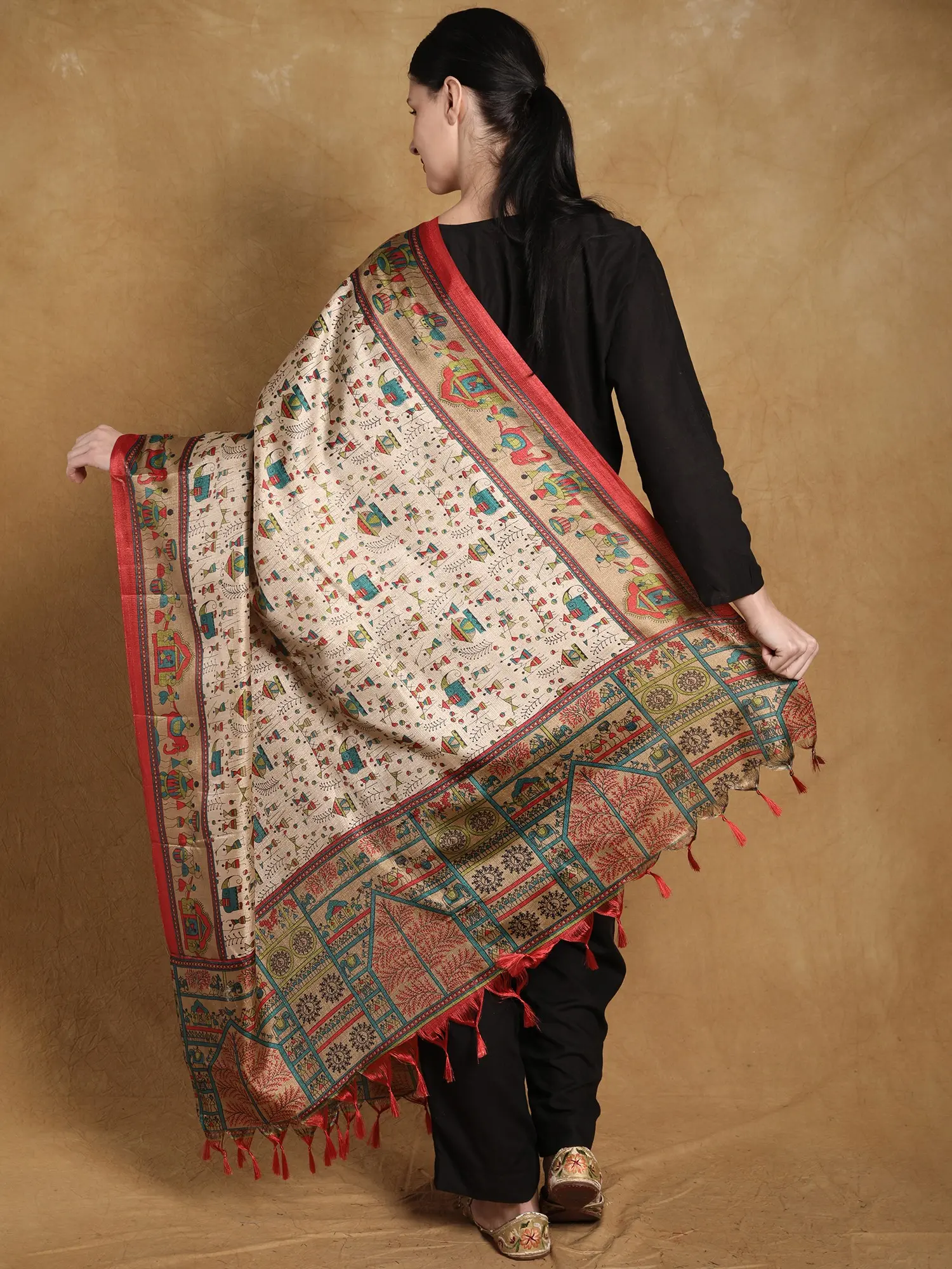 This dupatta is more than just an accessory; it's a wearable piece of art. The classic Warli motifs, characterized by their simplicity and symbolic representations of human beings, animals, and nature, are rendered in a vibrant palette. You'll find charming figures engaged in daily activities, surrounded by depictions of houses, trees, and celestial bodies, all woven together to tell a story of community and rural existence. The borders of the dupatta feature a complementary design, enhancing the overall aesthetic and adding a touch of regal sophistication. The rich, earthy tones of the base fabric serve as a perfect canvas for the lively artwork, ensuring that every detail stands out.