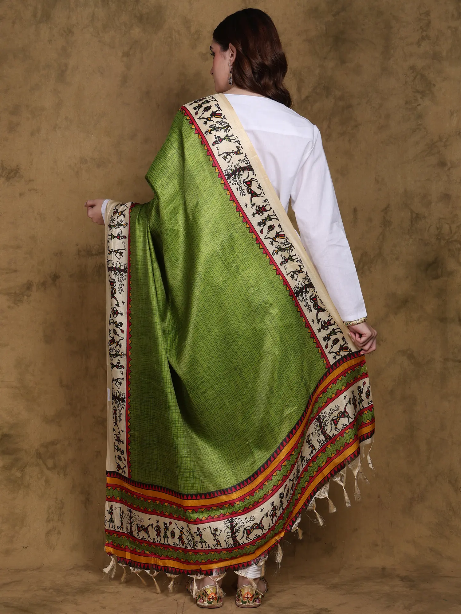 The Warli art print is a captivating element that sets this dupatta apart. This ancient tribal art form from India is known for its simplistic yet expressive depiction of nature and daily life. The charming figures and motifs, rendered in earthy tones of cream, black, and red, bring a unique cultural heritage to this modern accessory. The intricate detail work showcases the skill and artistry behind this traditional craft, making it a true heirloom piece.