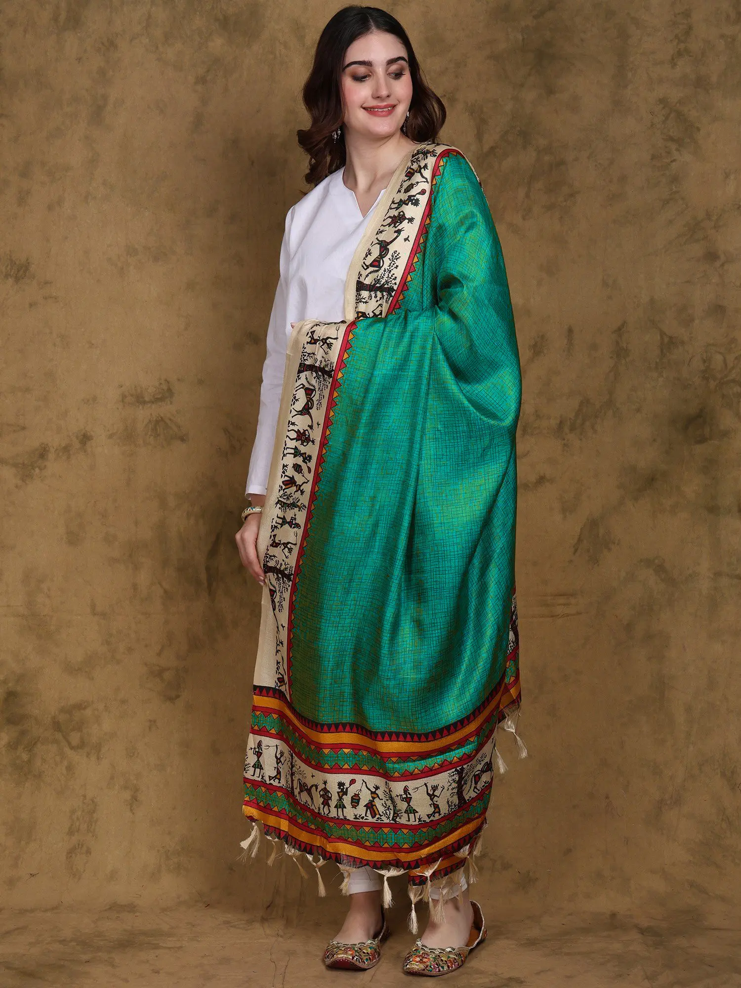 Art Silk Dupatta with Printed Warli Folk Art Motifs