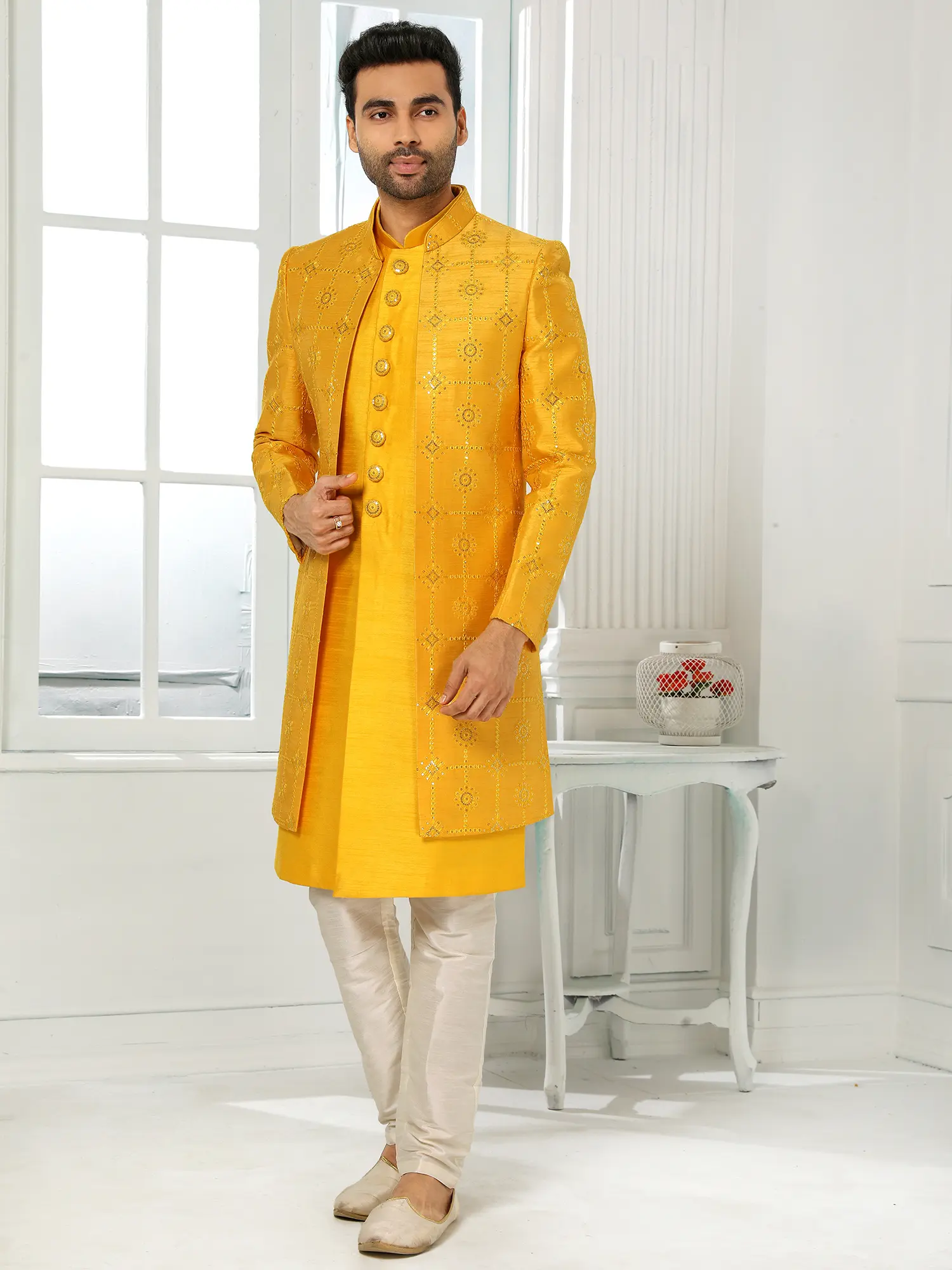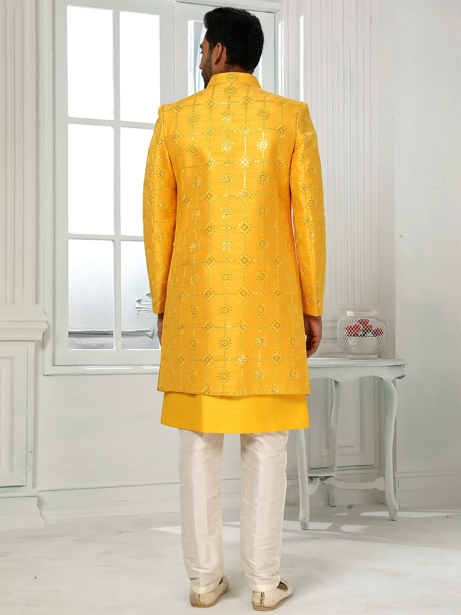 Embroidered Art Silk Three Piece Indo Jacket Set With Aligarhi Pant Offers A Luxurious Ethnic Look For Wedding