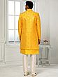 The ensemble features a vibrant kurta, providing a striking base, complemented by an exquisitely embroidered jacket that adds a layer of distinguished sophistication. The jacket's open front and tailored silhouette offer a modern Indo-Western aesthetic, while the Aligadhi pants ensure both comfort and a polished finish. The rich hue of the art silk, particularly in this delightful shade, is perfect for radiating warmth and celebratory spirit. You'll note the thoughtful placement of each embroidered motif, designed to draw the eye and highlight the garment’s premium construction.