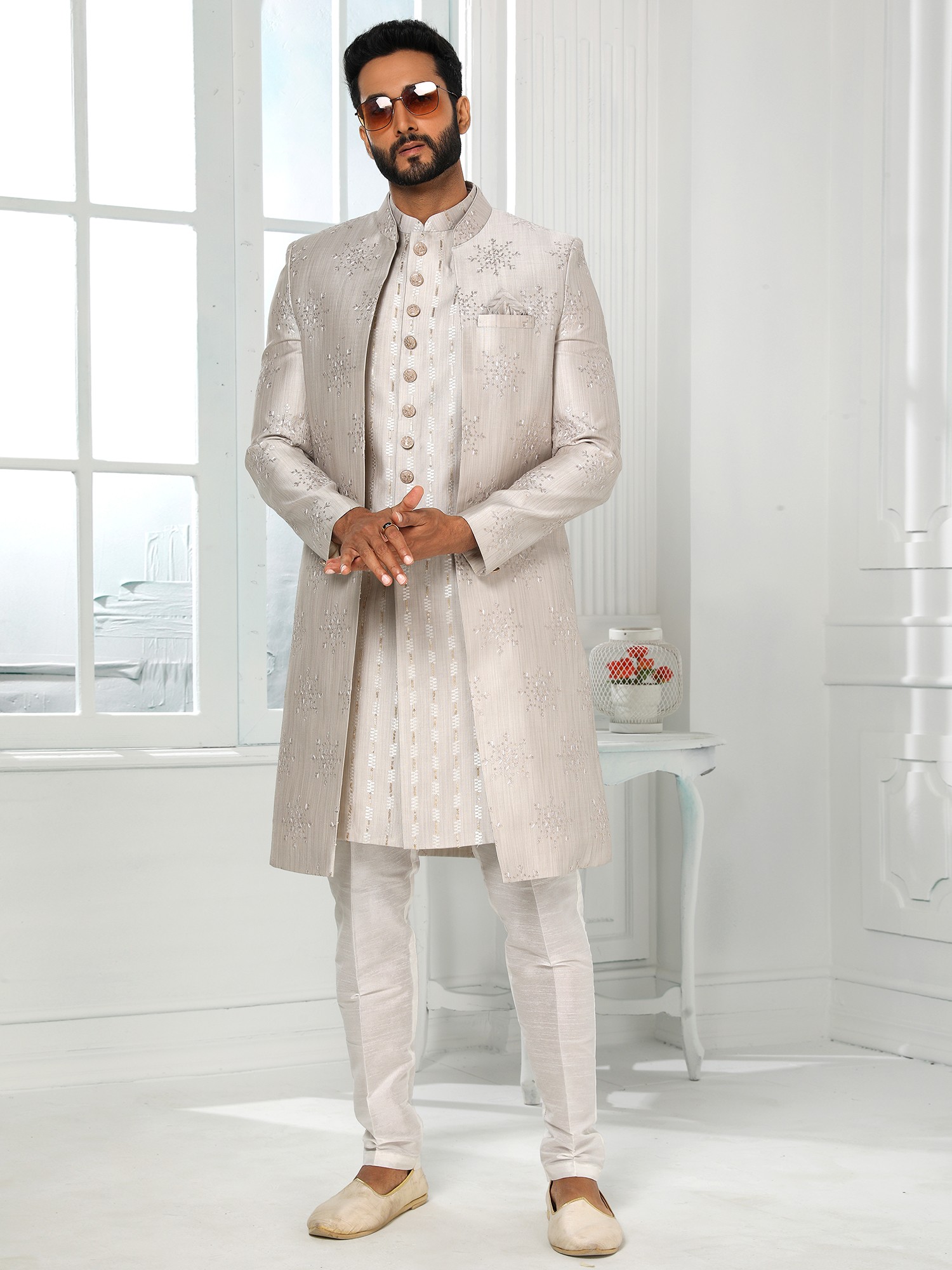 Embroidered Art Silk Three Piece Indo Jacket Set With Aligarhi Pant Offers A Luxurious Ethnic Look For Wedding