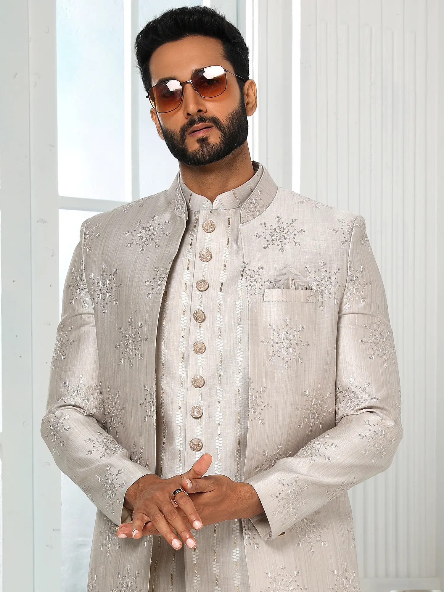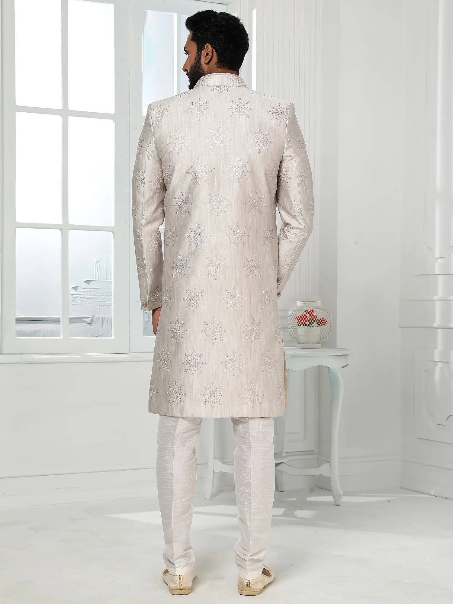 Art Silk Shimmer Sequins Three Piece Indo Jacket Set With Aligarhi Pant Crafts A Premium Ethnic Ensemble For Groom