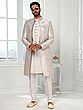 Luxurious Printed Thread Work Art Silk Indo Jacket Set With Aligarhi Pant For Wedding Groom Wear