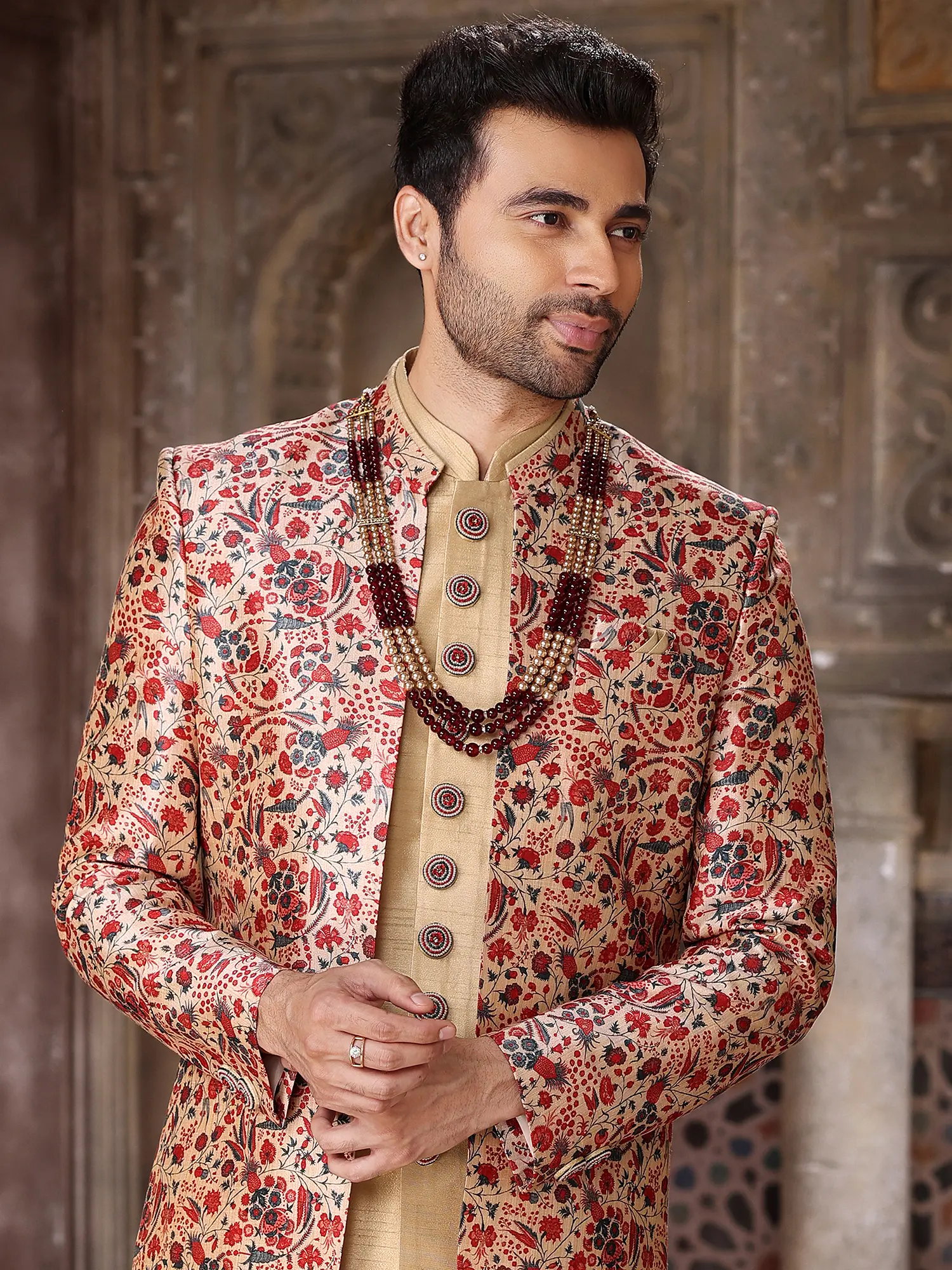 Elegant Art Silk Brocade Three Piece Indo Jacket Set With Aligarhi Pant Dazzles Grooms With Timeless Wedding Luxury