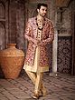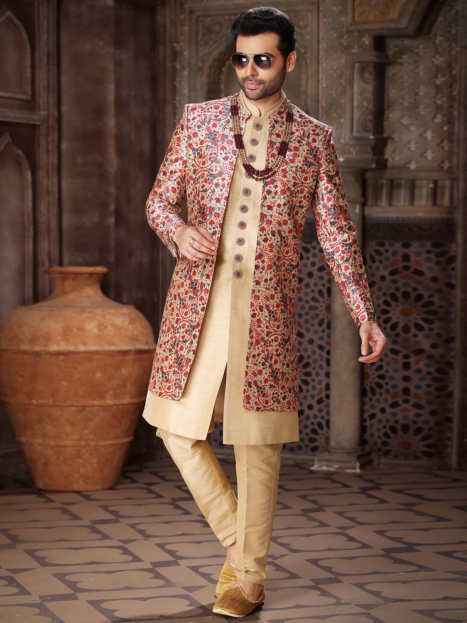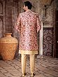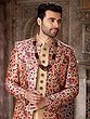 Luxurious Printed Thread Work Art Silk Indo Jacket Set With Aligarhi Pant For Wedding Groom Wear