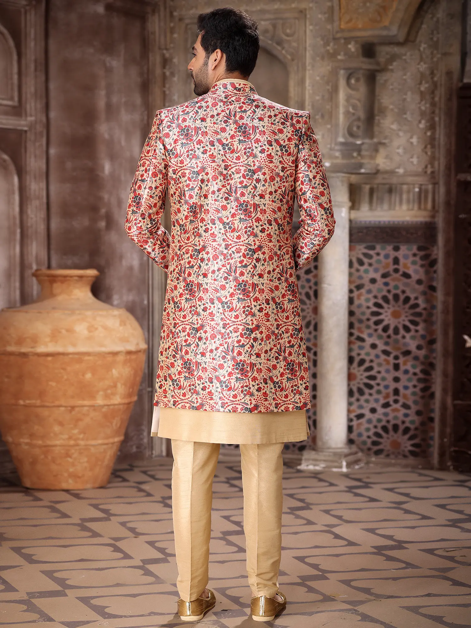 The rich art silk provides a lustrous canvas for the captivating prints and delicate thread work, creating a visual symphony of color and texture. The coordinated ensemble includes a gracefully cut Indo-jacket that layers effortlessly over a complementary kurta and tailored Aligarhi pants. This thoughtful design not only enhances the aesthetic appeal but also offers a comfortable and distinguished fit, ensuring you move with ease and grace.