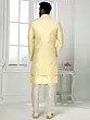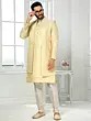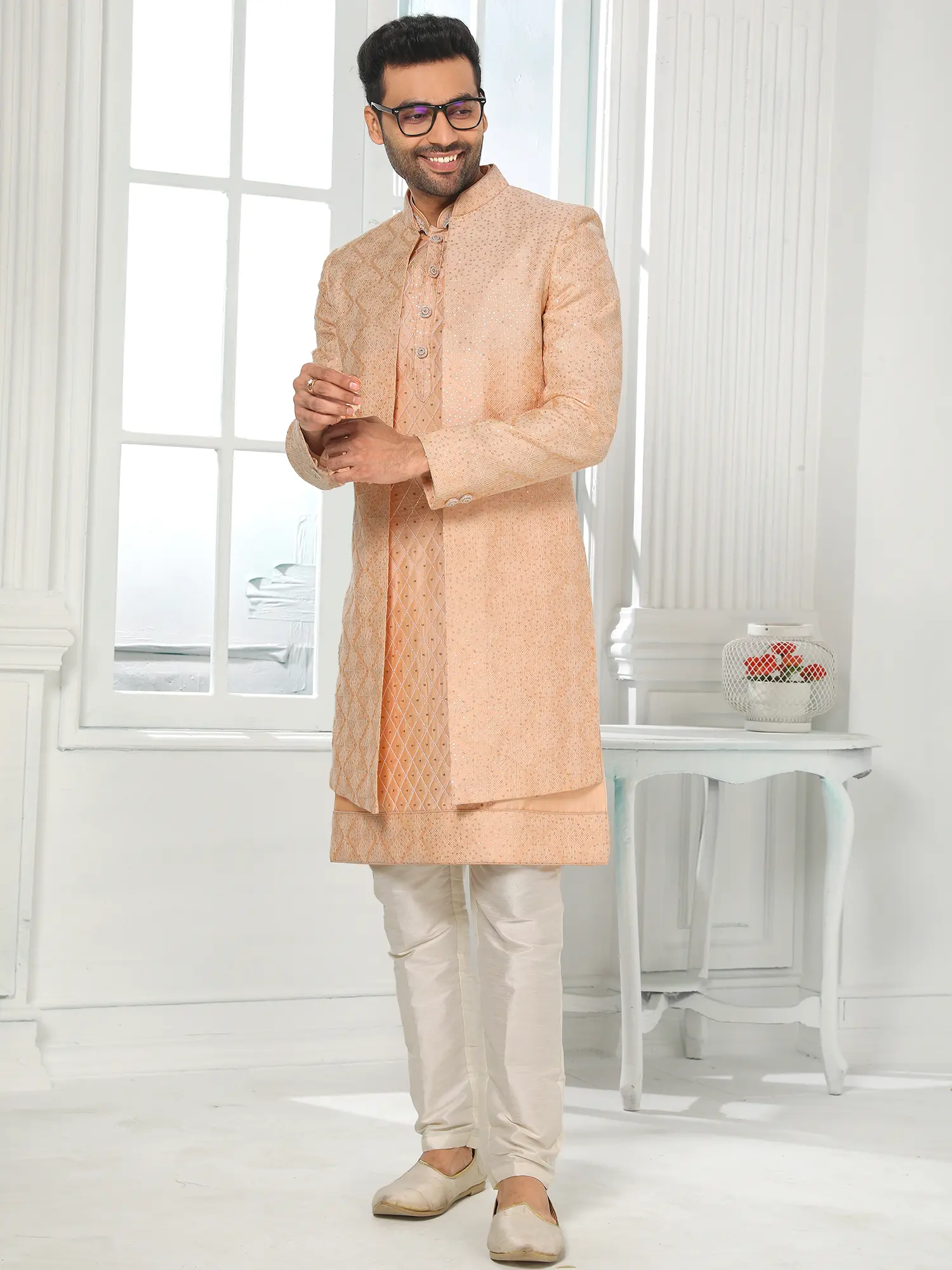 The soft, luminous hue provides a sophisticated canvas for the delicate, all-over embellishments that catch the light with every movement. This ensemble features a contemporary jacket layered over a finely patterned kurta, complemented by Aligadhi pants that offer a relaxed yet polished finish. The subtle diamond motif and intricate stitching create a tapestry of understated luxury, perfect for festive gatherings.