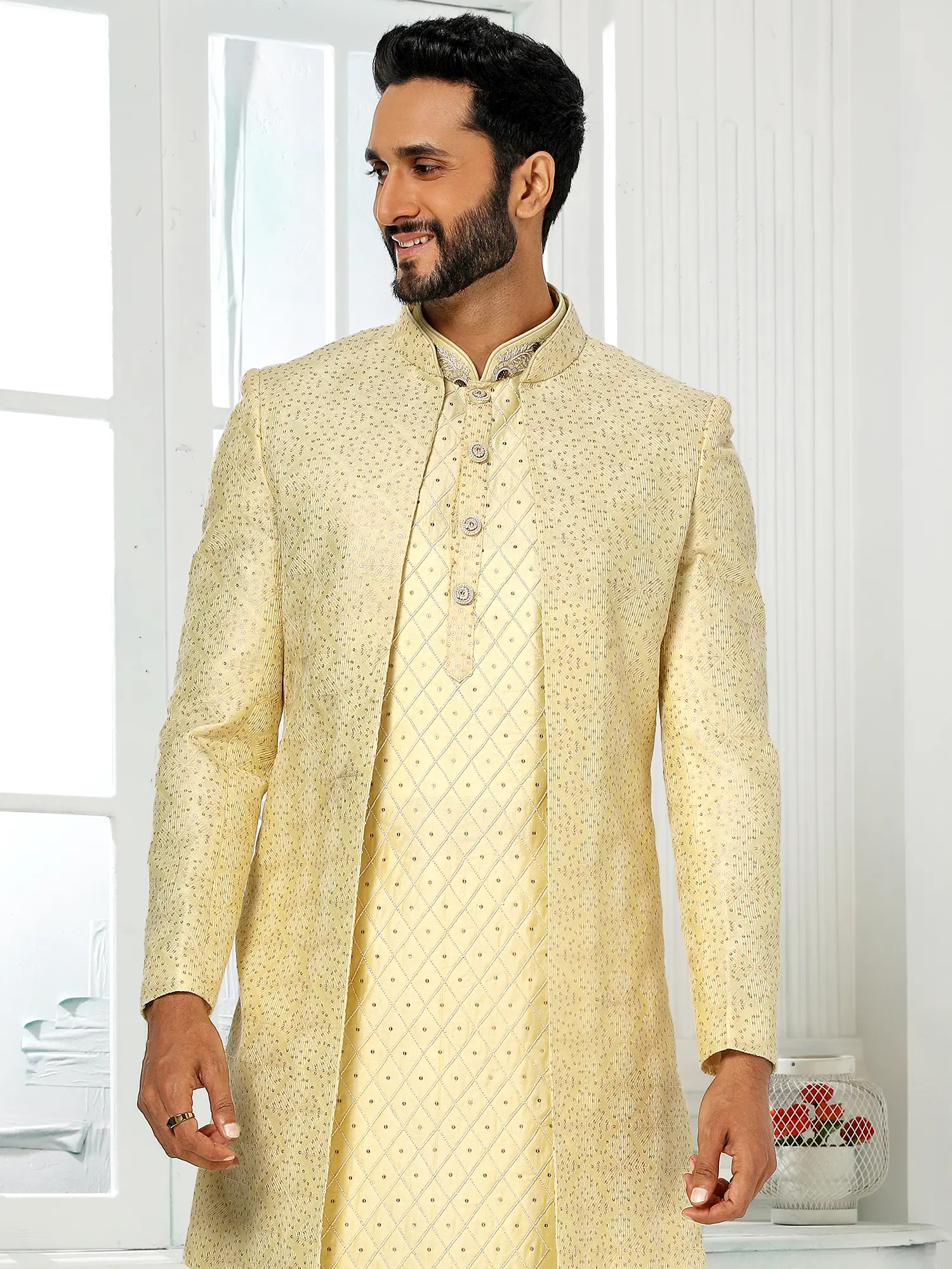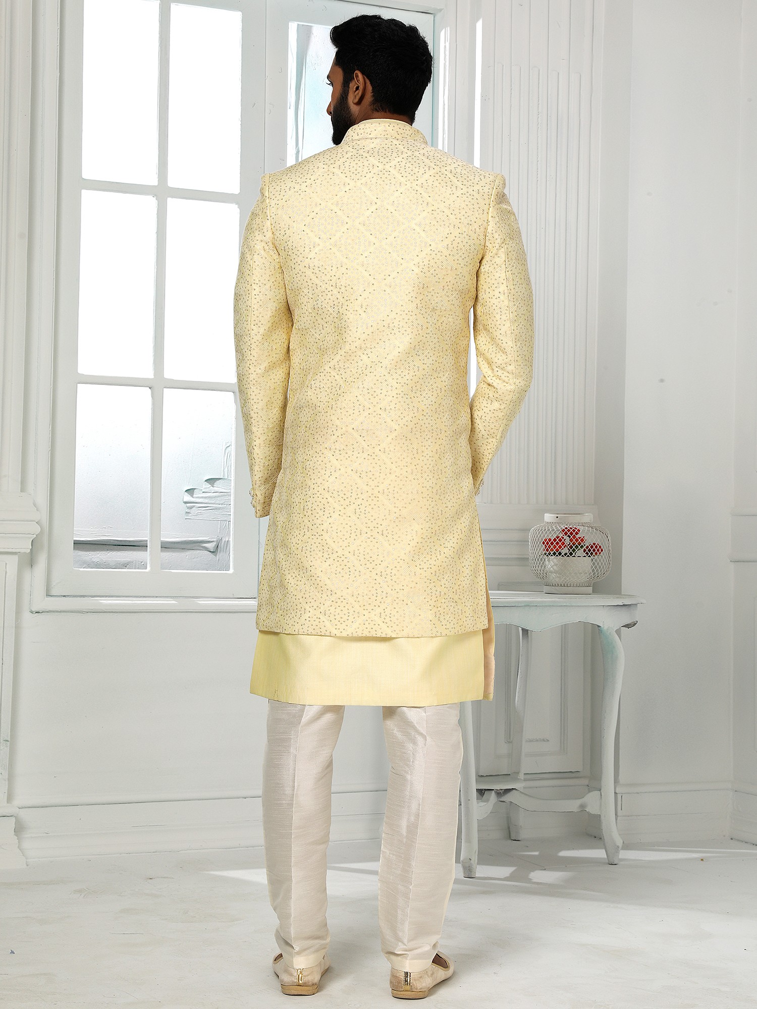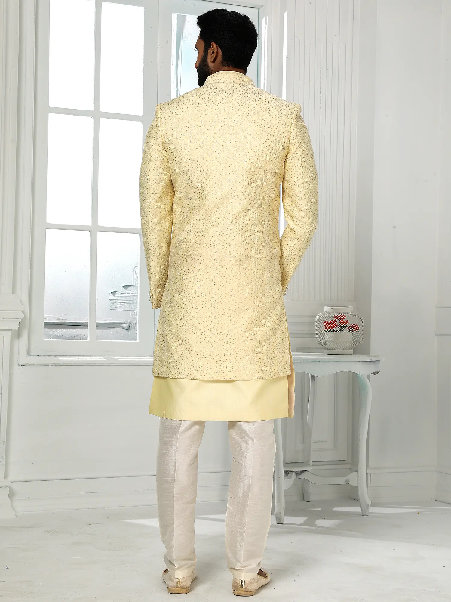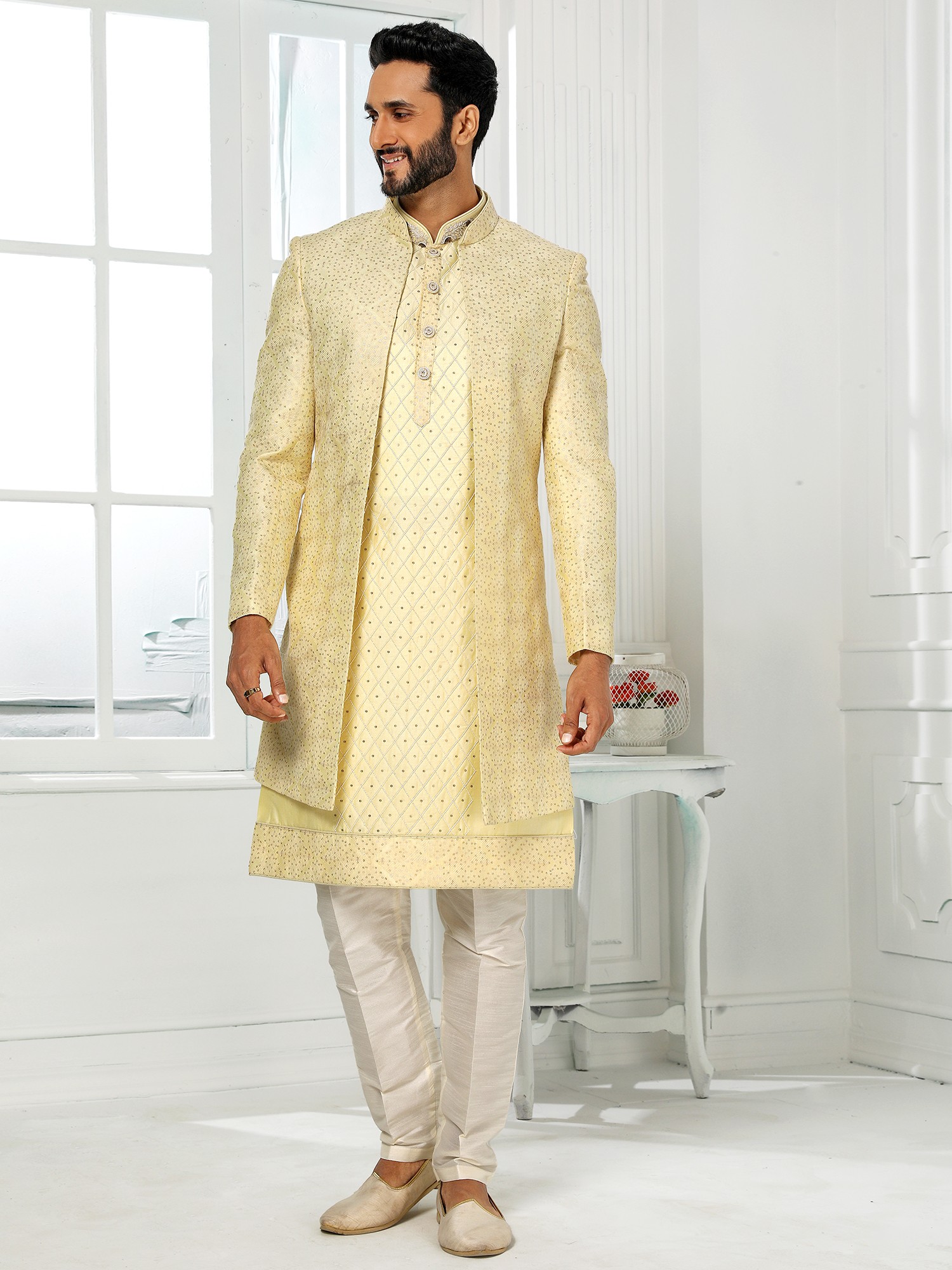 Art Silk Shimmer Sequins Three Piece Indo Jacket Set With Aligarhi Pant Crafts A Premium Ethnic Ensemble For Groom