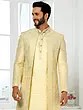 Elegant Art Silk Brocade Three Piece Indo Jacket Set With Aligarhi Pant Dazzles Grooms With Timeless Wedding Luxury