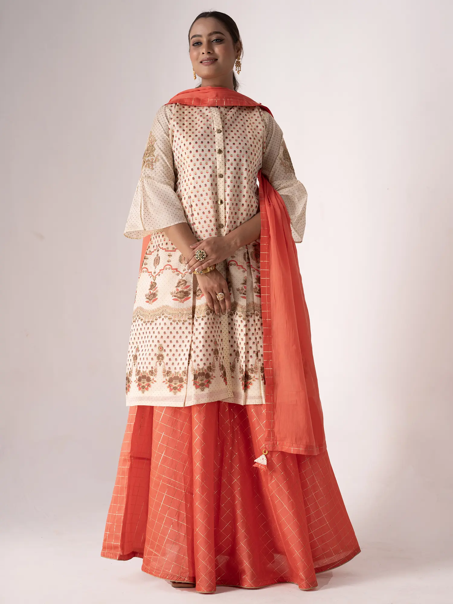 Completing this sophisticated set is a stunning designer palazzo and a coordinating tassels dupatta. The palazzo, in a vibrant coral shade, boasts a subtle yet striking checkered pattern woven with fine gold threads. This geometric design adds a modern twist to the traditional flowy silhouette, creating a dynamic contrast with the embroidered kurta. The ample fabric of the palazzo ensures graceful movement, making it comfortable for any occasion. The accompanying dupatta is the crowning glory of this ensemble. In a matching vibrant coral, its sheer art silk fabric offers a delicate and ethereal quality. The edges are finished with a subtle, elegant border, and the tassels at the corners add a playful yet sophisticated touch, a delightful detail that completes the look with a flourish. This ensemble is more than just clothing; it is an expression of refined taste, a statement of personal style that honors tradition while embracing modern elegance. Perfect for celebrations, weddings, or any occasion where you wish to make a memorable impression, this outfit promises to turn heads with its understated luxury and impeccable design.