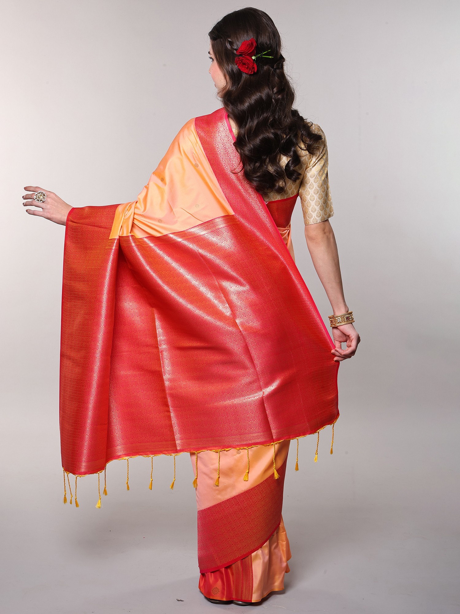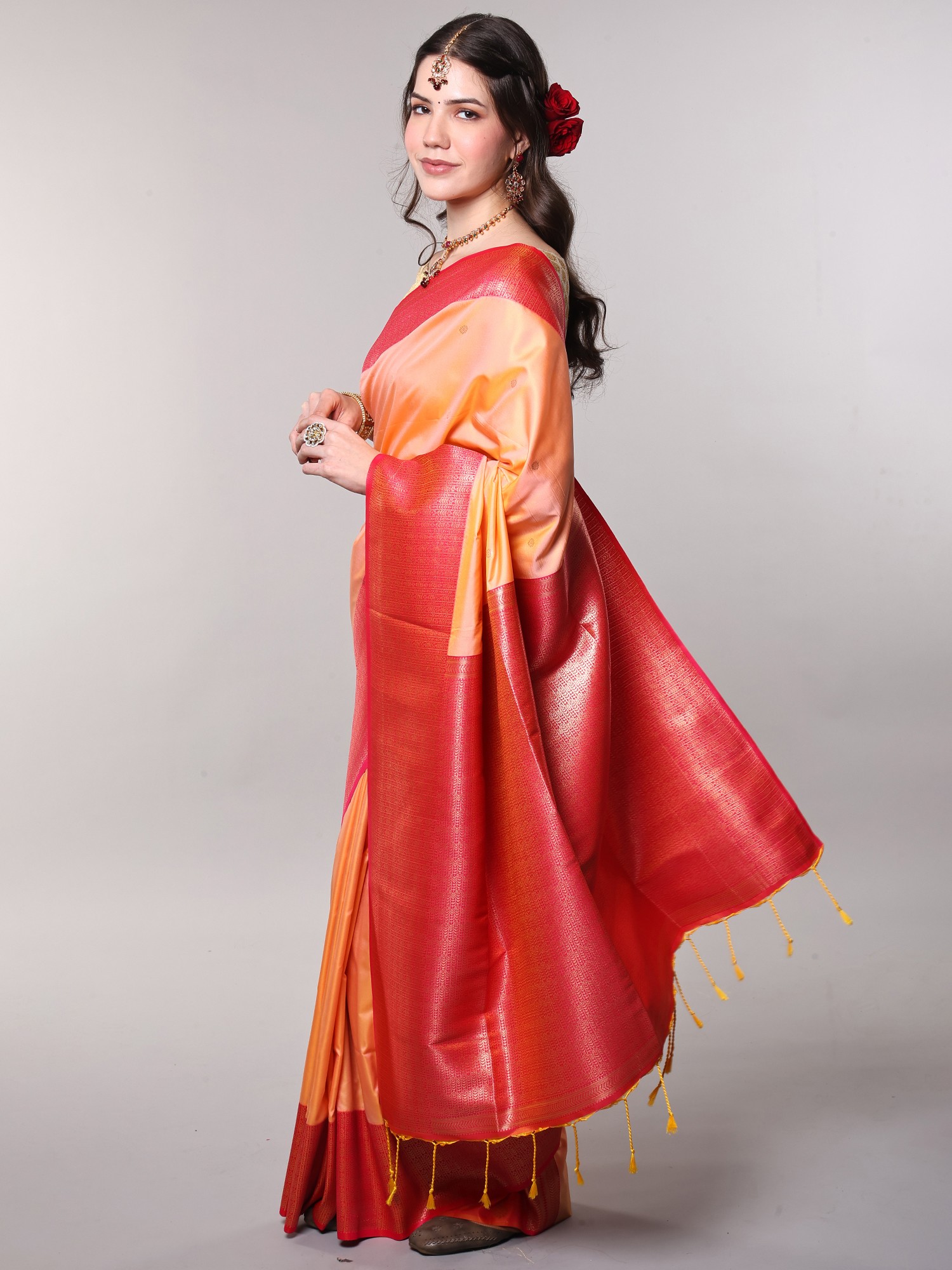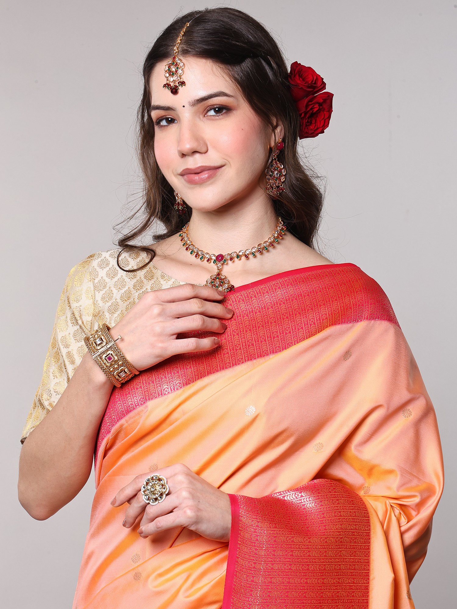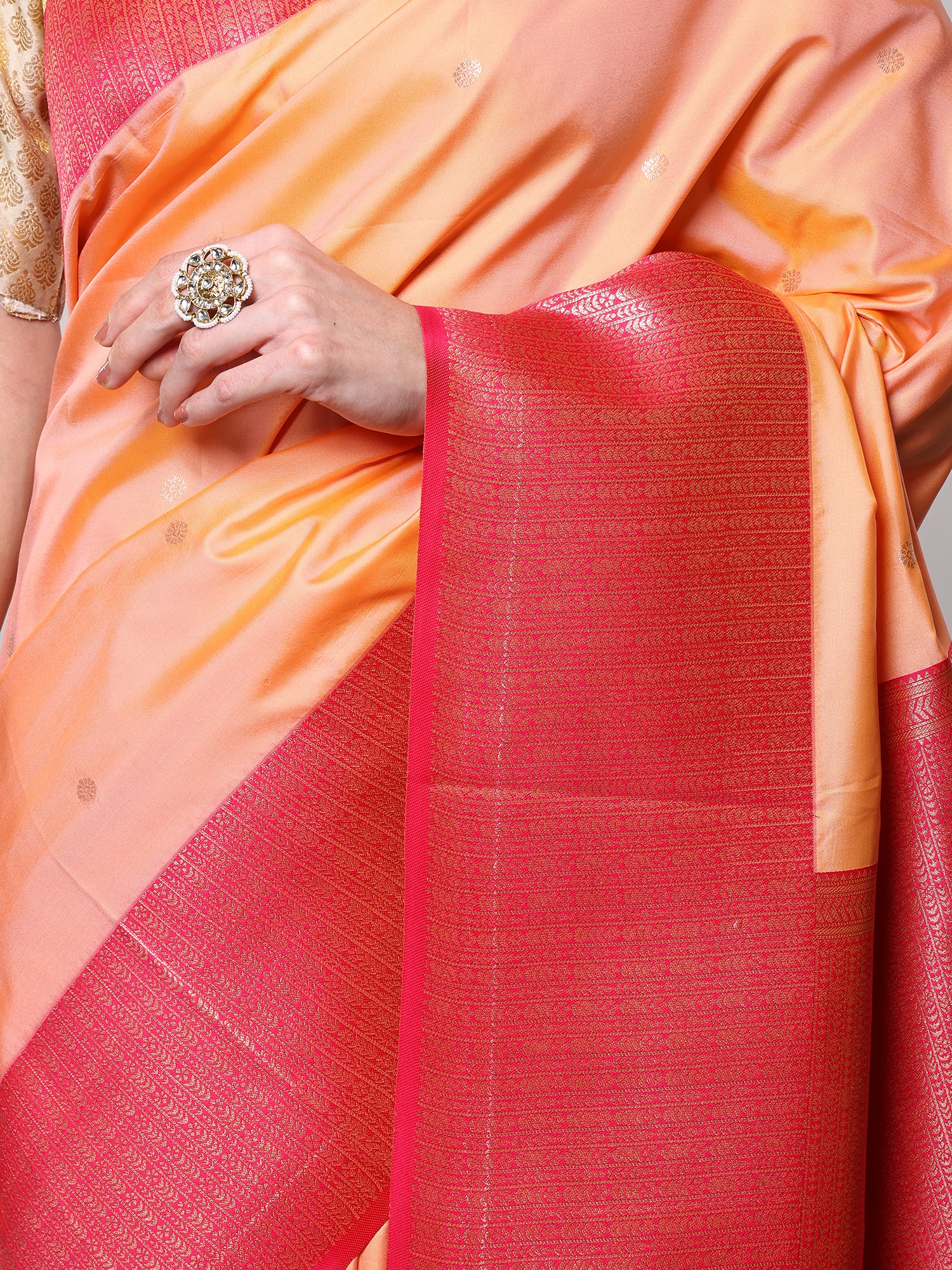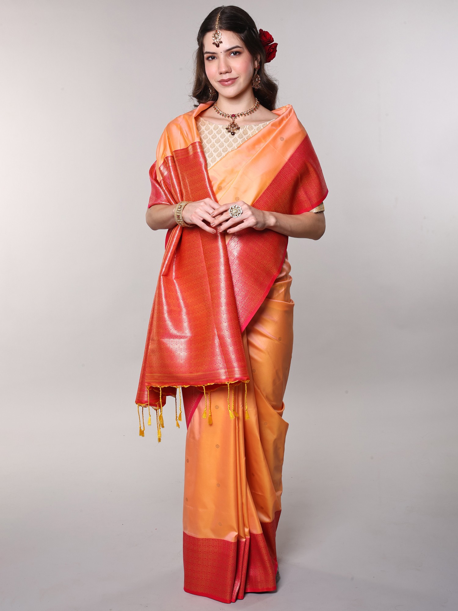 Drape yourself in elegance with this exquisite art silk saree, a testament to the rich weaving heritage of Bangalore. The saree unfolds in a captivating gradient of warm peach and soft coral, creating a visually stunning effect that is both sophisticated and vibrant. This alluring color palette is reminiscent of a sunset, promising to add a touch of radiant charm to any occasion. The body of the saree is adorned with delicate, scattered golden bootis, small woven motifs that catch the light and add a subtle shimmer. These intricate details are woven with precision, offering a classic appeal that never goes out of style. The art silk fabric itself possesses a luxurious sheen and a smooth, graceful drape, ensuring you feel as opulent as you look.