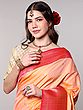 Complementing the soft hues of the body is a striking wide border, a bold statement of traditional craftsmanship. This border is meticulously woven with rich zari, a lustrous thread that gleams with a regal golden hue. The expansive width of the border commands attention, framing the saree with an aura of grandeur and opulence. The zari weave is intricate, displaying traditional patterns that speak volumes of the artisan's skill and dedication. This detailed work not only enhances the saree's beauty but also adds a significant element of luxury and tradition. The contrast between the flowing silk and the structured, shimmering border creates a dynamic and breathtaking visual.