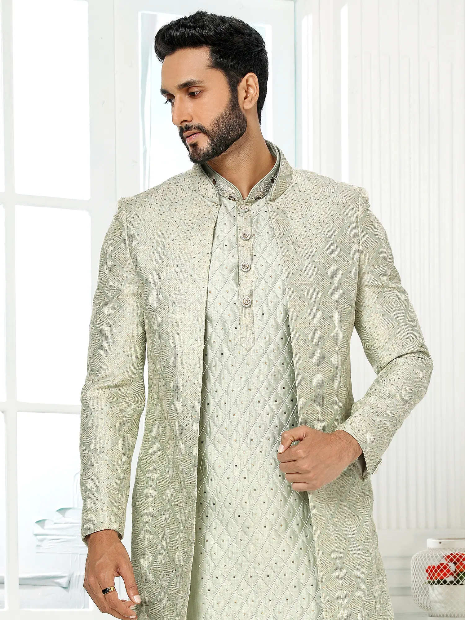 The soft, luminous hue provides a sophisticated canvas for the delicate, all-over embellishments that catch the light with every movement. This ensemble features a contemporary jacket layered over a finely patterned kurta, complemented by Aligadhi pants that offer a relaxed yet polished finish. The subtle diamond motif and intricate stitching create a tapestry of understated luxury, perfect for festive gatherings.